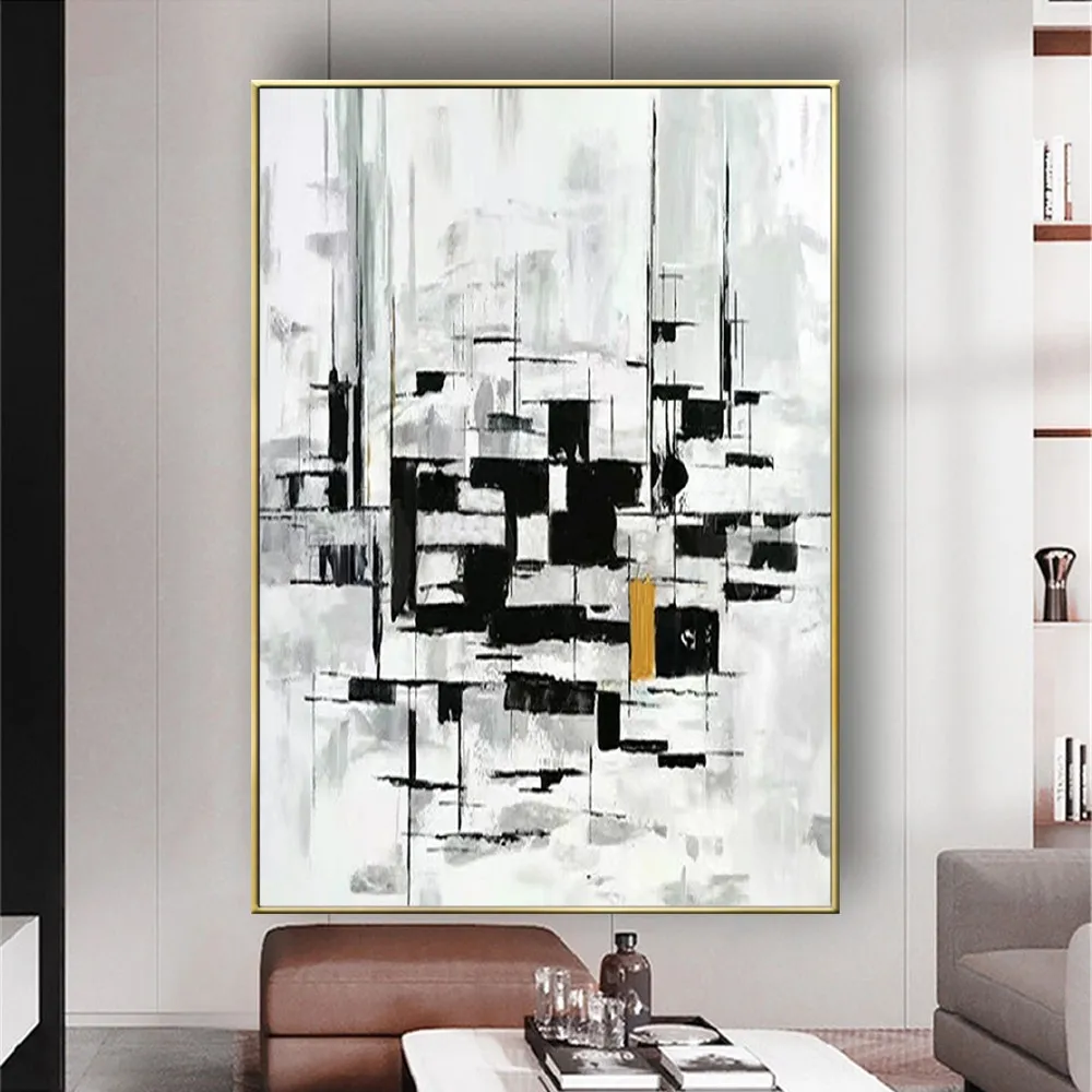 Dive into the intriguing world of urban abstraction with our 'Monochrome Geometric Landscape.' This textured painting skillfully blends intricate geometric forms in a captivating monochrome palette, creating a contemporary masterpiece. The play of textures adds depth and character to the artwork, evoking the dynamic energy of a modern cityscape.