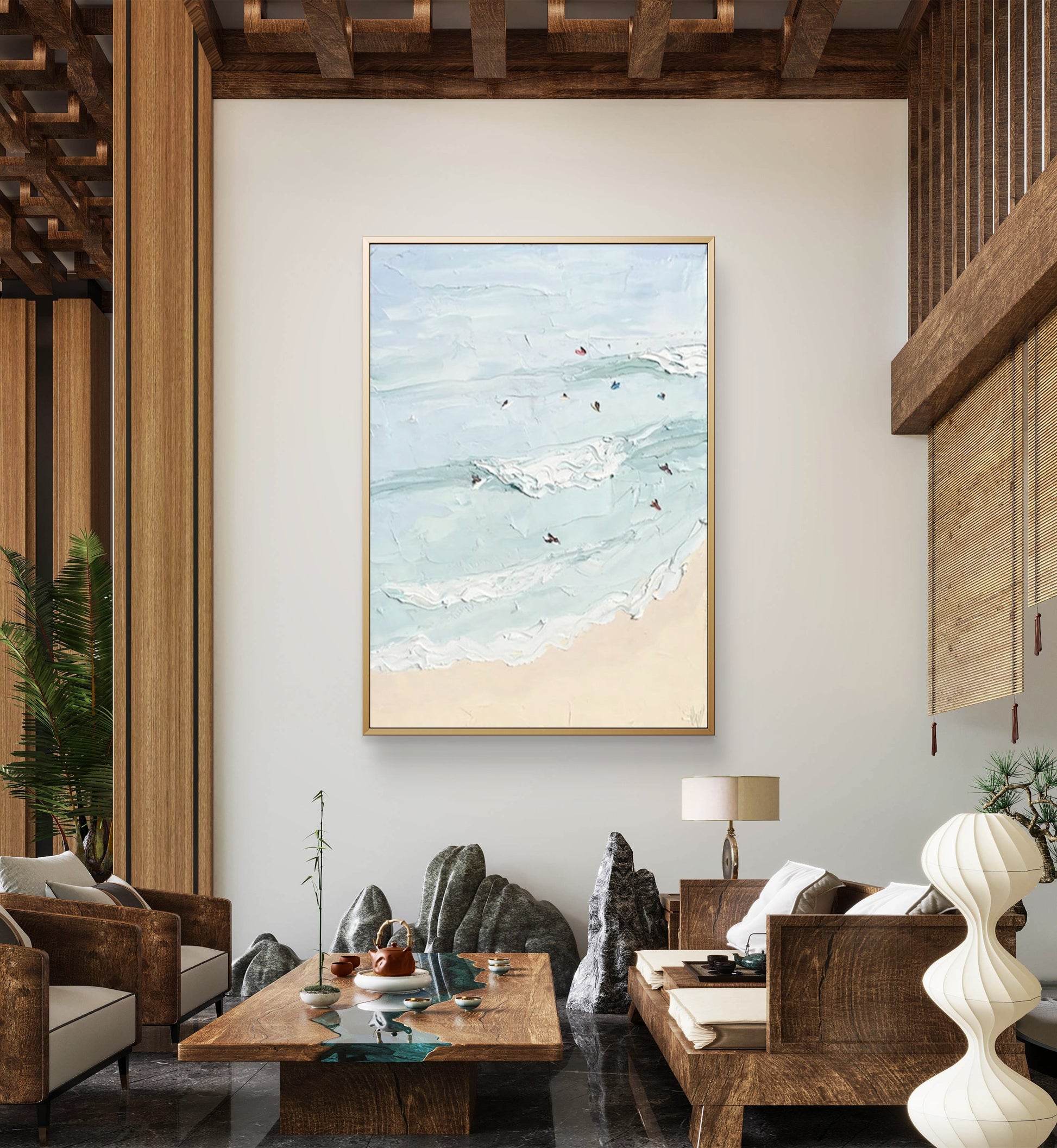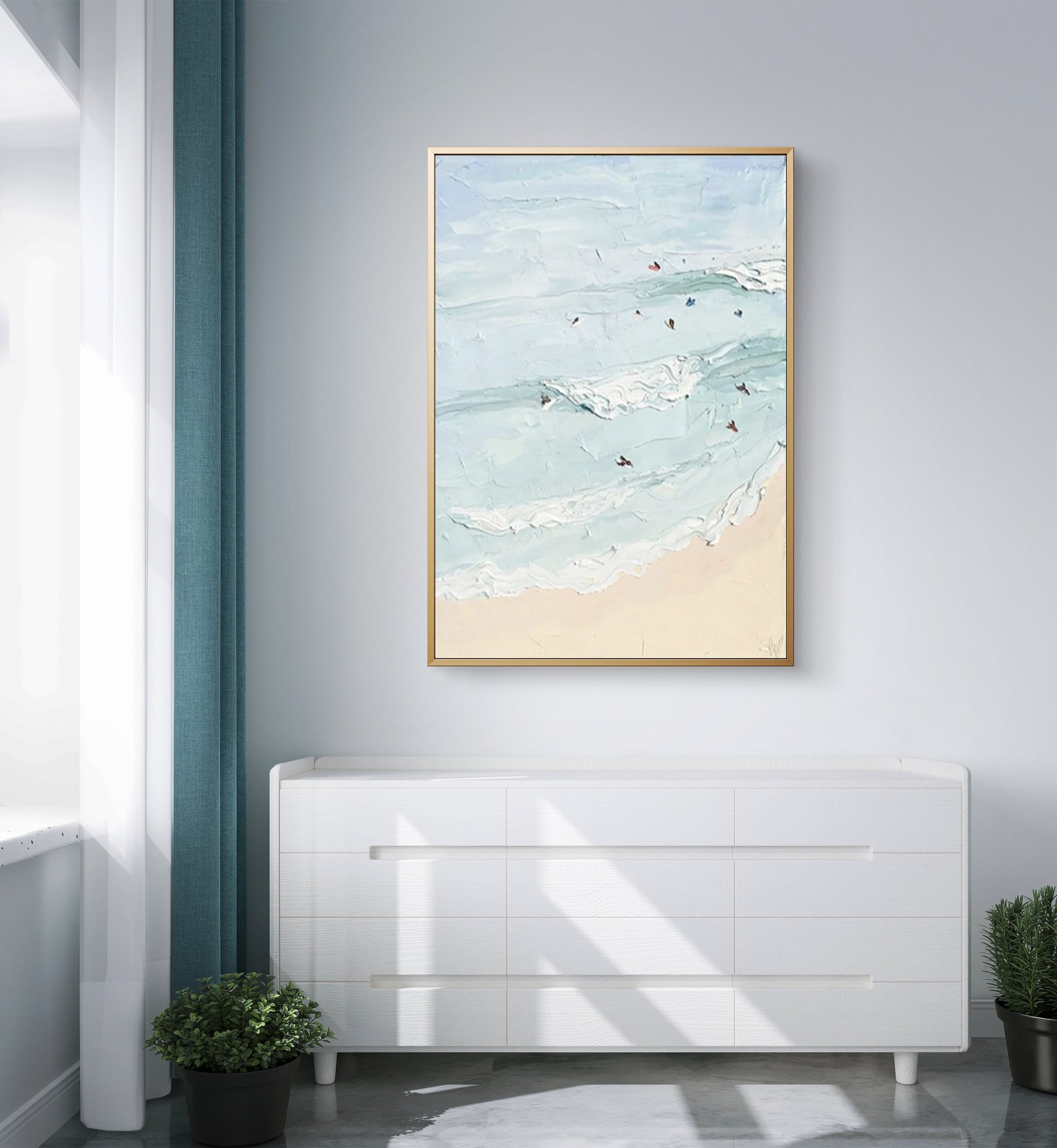Dive into the beauty of the ocean with this abstract handmade oil painting of a swimming seascape. The artist’s use of bold colours and textured brushstrokes creates a vivid and dynamic representation of the sea, perfect for bringing a touch of coastal charm to any living room or bedroom. This unique piece of art is ideal for those who love the ocean and appreciate modern, handcrafted decor.