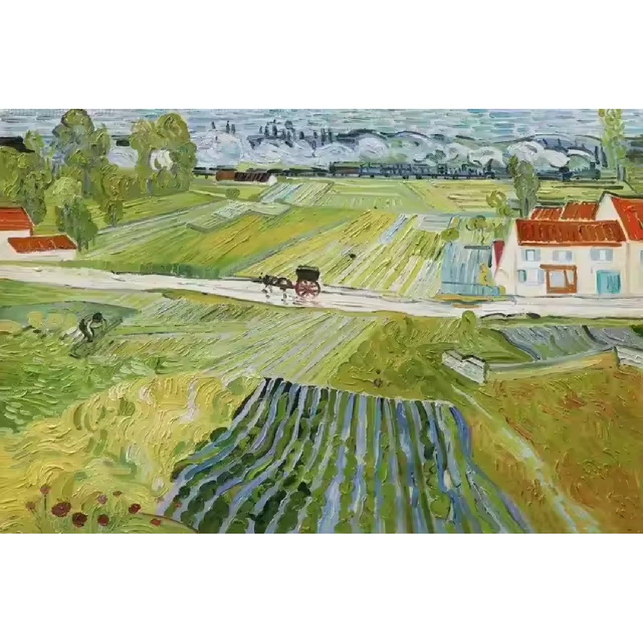 Bring the charm of the European countryside into your space with Countryside Journey, a hand-painted landscape inspired by the expressive style of Vincent van Gogh. This vivid scene captures a winding rural road lined with golden and green striped fields, a horse-drawn carriage, and charming red-roofed cottages nestled in lush farmland.