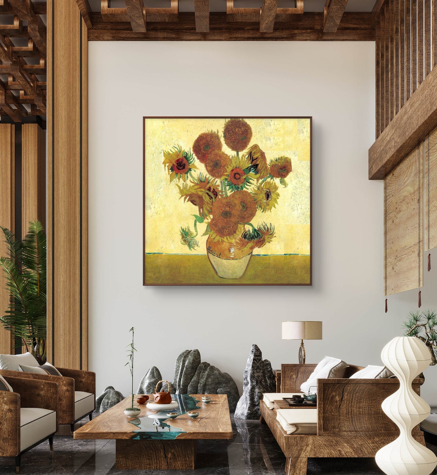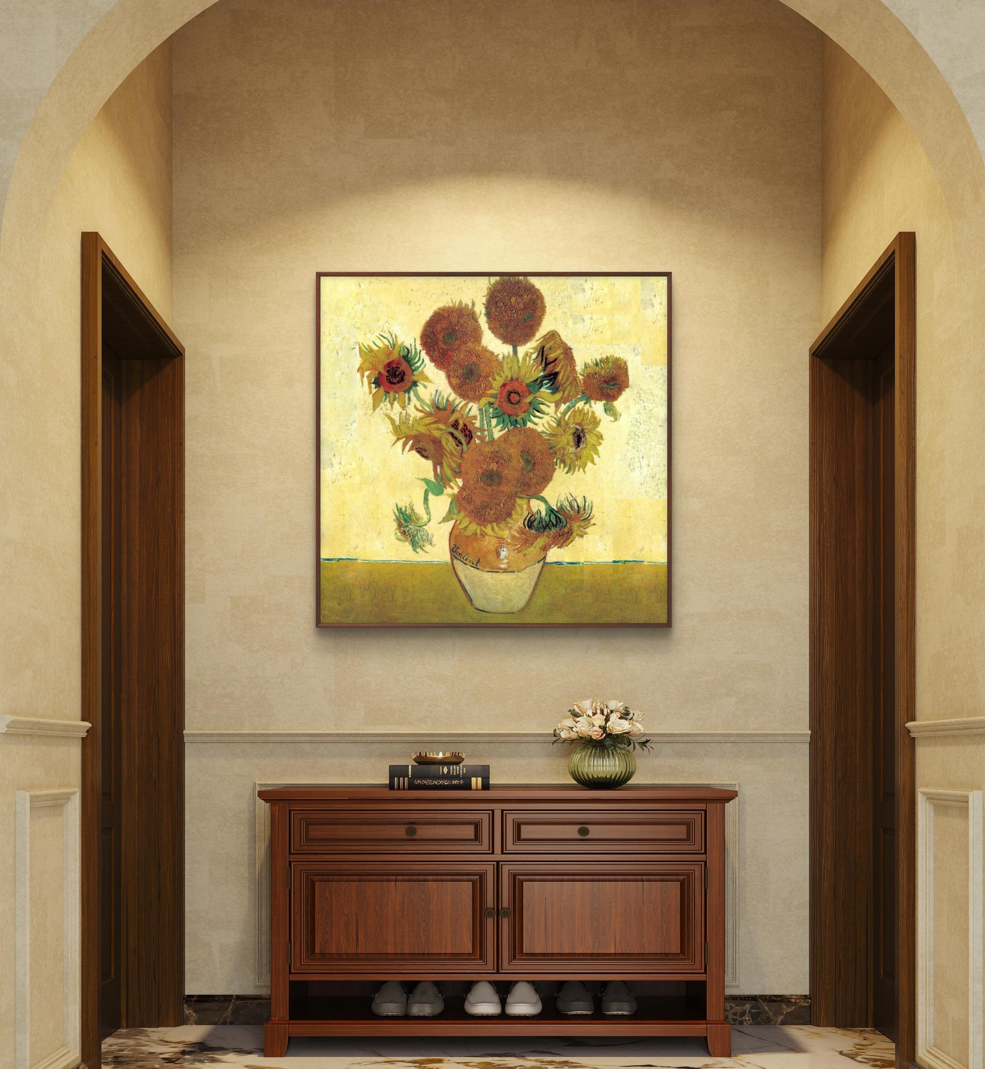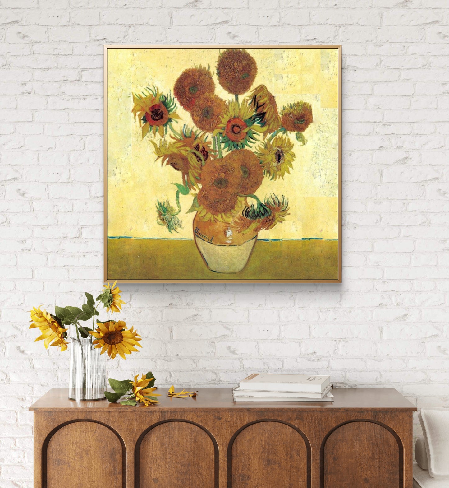 Explore the mesmerizing beauty of Vincent van Gogh's iconic masterpiece, the 'Famous Van Gogh Golden Sunflower Textured Painting.' This exquisite reproduction showcases a stunning bouquet of sunflowers, brilliantly capturing their vibrant hues. Immerse yourself in Van Gogh's distinctive style, characterized by bold colors and expressive, thick brushstrokes, as you admire this lifelike portrayal in a simple interior setting. Don't miss the chance to own a piece of art history with this perfect embodiment of Van Gogh's genius.