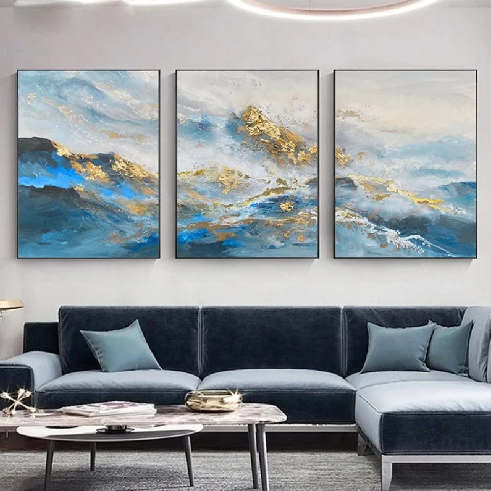 This painting is a set of three wall hangings that depict a stunning landscape of golden blue mountains. The artist has used a textured technique to create a sense of depth and dimension in the scenery. The painting evokes a feeling of tranquility and harmony, as the golden sun sets over the blue peaks. This painting is a perfect choice for anyone who loves nature and wants to add some warmth and beauty to their home.