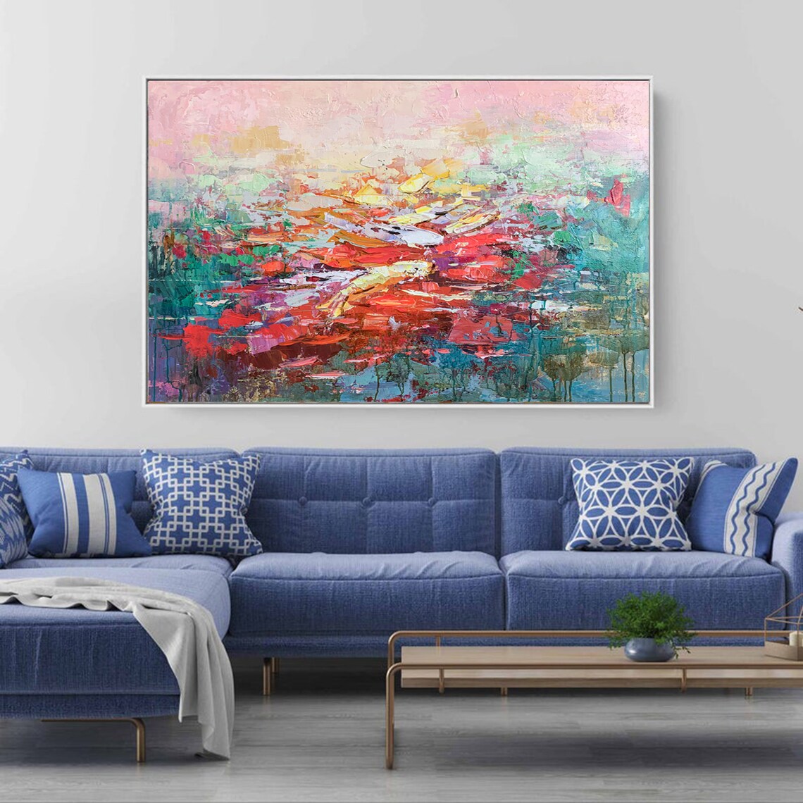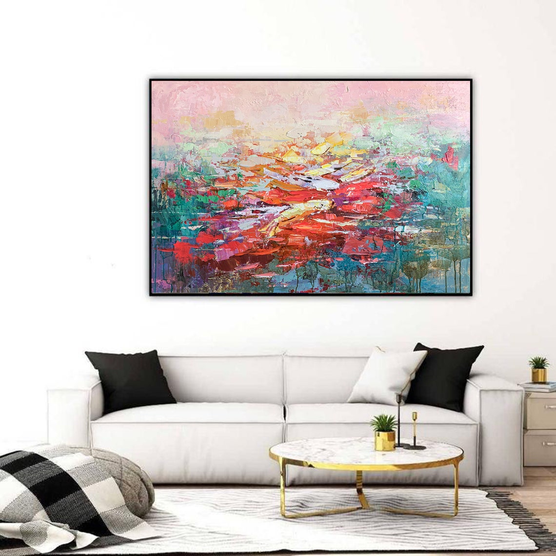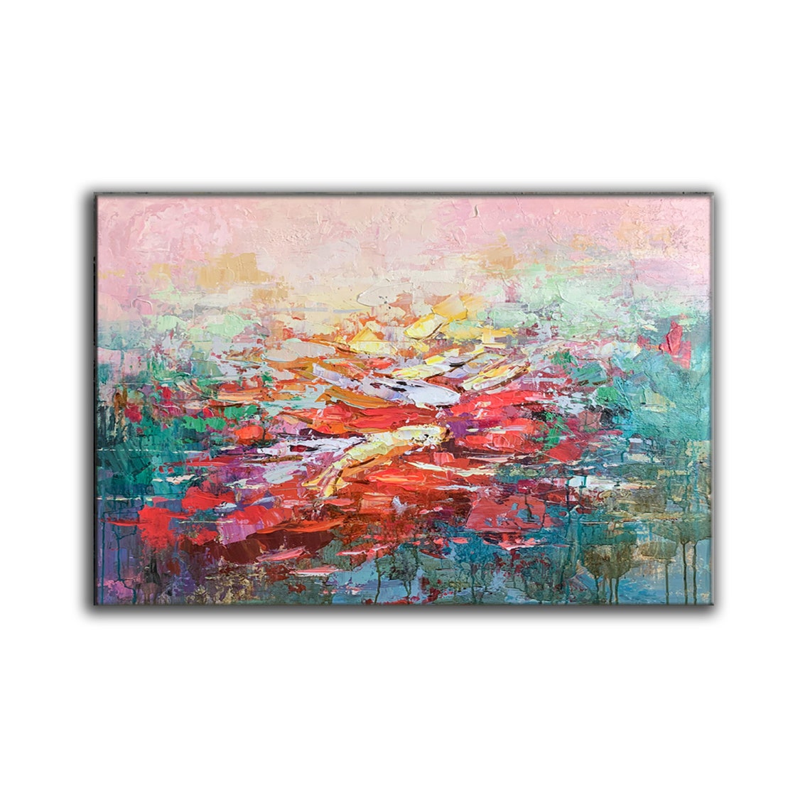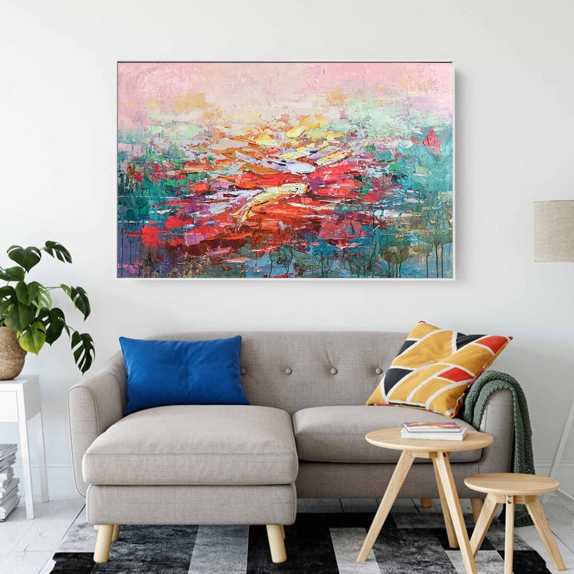 Light up your interior with this stunning sunset-inspired abstract painting, where bold colors and dramatic texture collide in a dazzling visual explosion. Vibrant reds, fiery oranges, sunny yellows, and warm pinks blend with serene aquas and greens in thick, expressive palette knife strokes. The impasto technique gives the surface a rich, sculptural feel, while the composition evokes a radiant sunset reflecting over water. Whether styled above a sofa or in an entryway, this hand-painted canvas brings joy, motion, and contemporary character to your space.