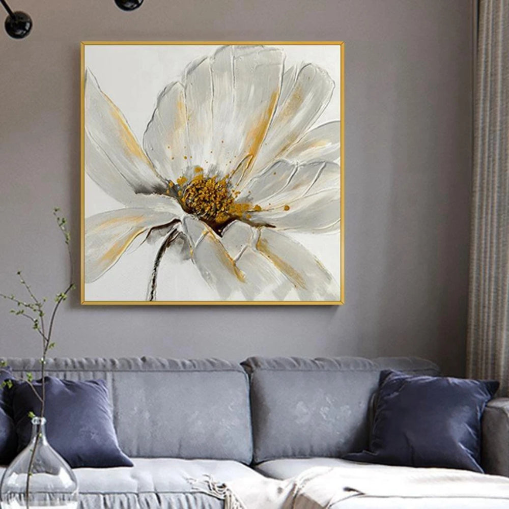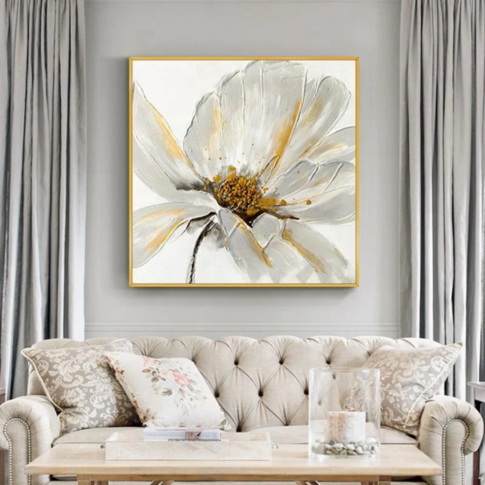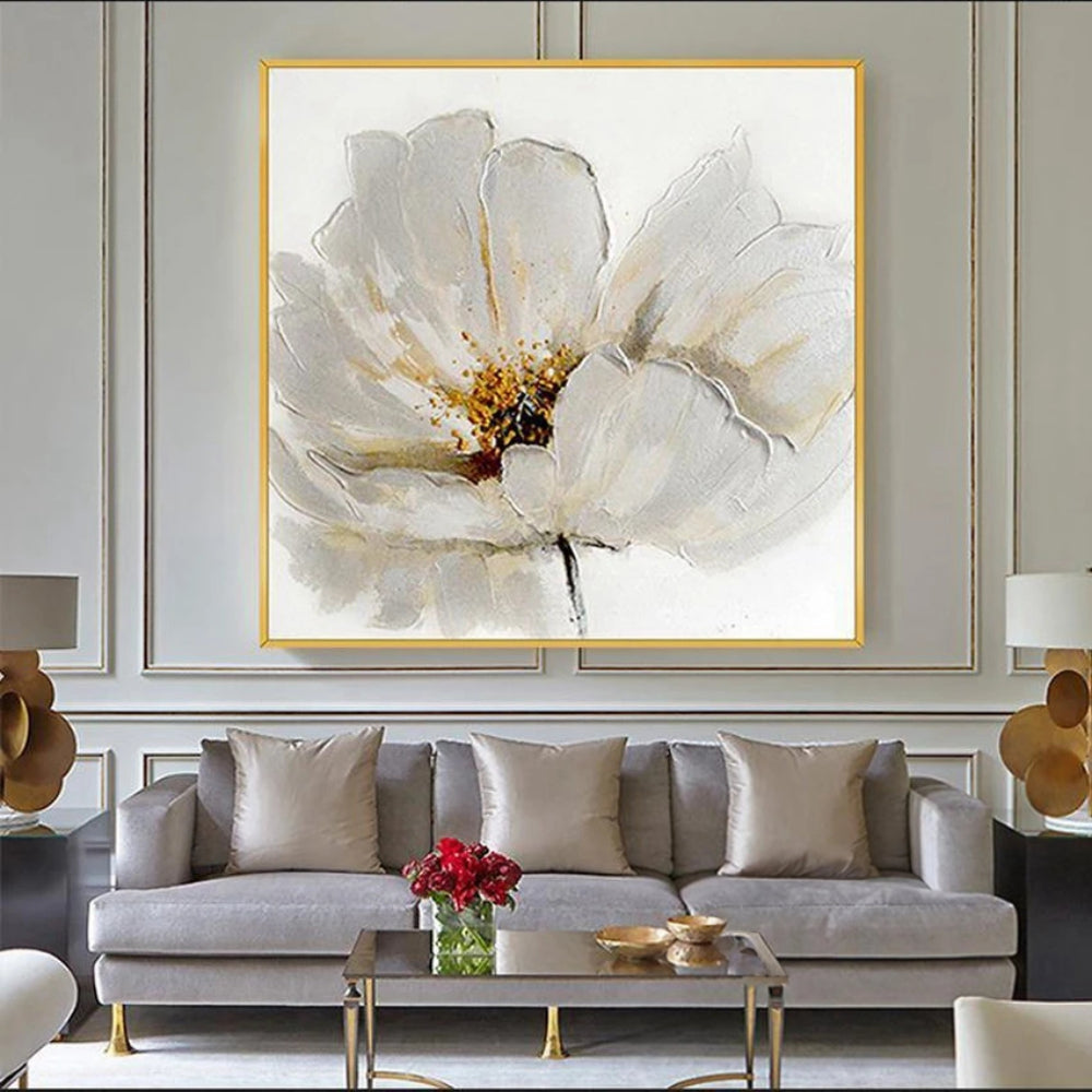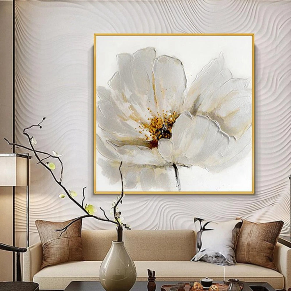 This exquisite set of three paintings is a celebration of nature's elegance and beauty. Each piece showcases a blooming flower, rendered in a delicate white hue that symbolizes purity and tranquility. The flowers, with their intricate details and subtle shading, appear to burst forth from the canvas, creating a sense of depth and realism.