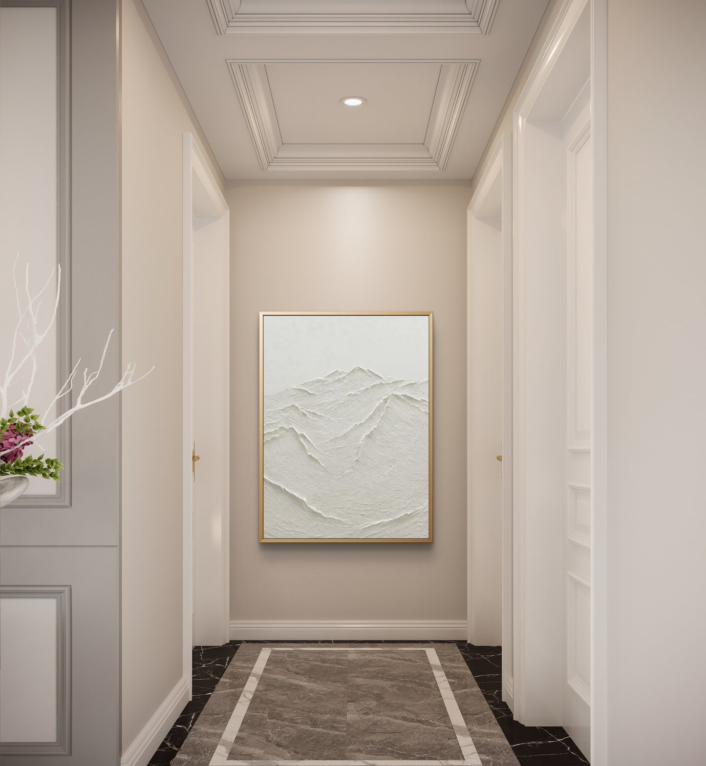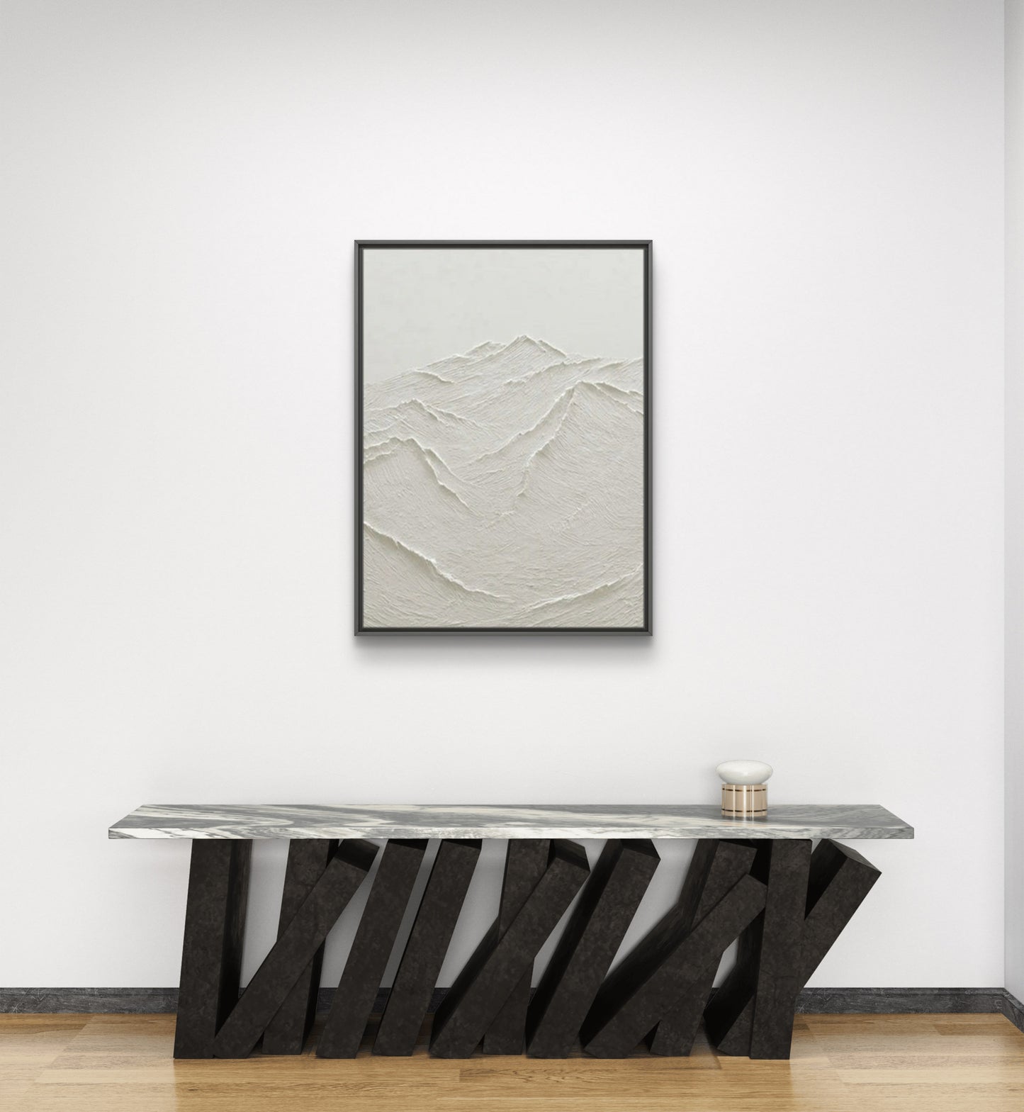 This oil painting features a series of mountain ranges, rendered in a striking 3D style that adds depth and dimension to the scene. The mountains are painted in a textured white, giving them a rugged, realistic appearance that contrasts beautifully with the abstract style of the artwork. The painting is designed to be displayed in a living room, where it can serve as a stunning focal point and conversation starter. Its neutral white colour scheme makes it versatile enough to complement a variety of interior design styles, from modern to rustic. This painting is not just a piece of decor, but a statement of appreciation for the awe-inspiring beauty of our natural world.