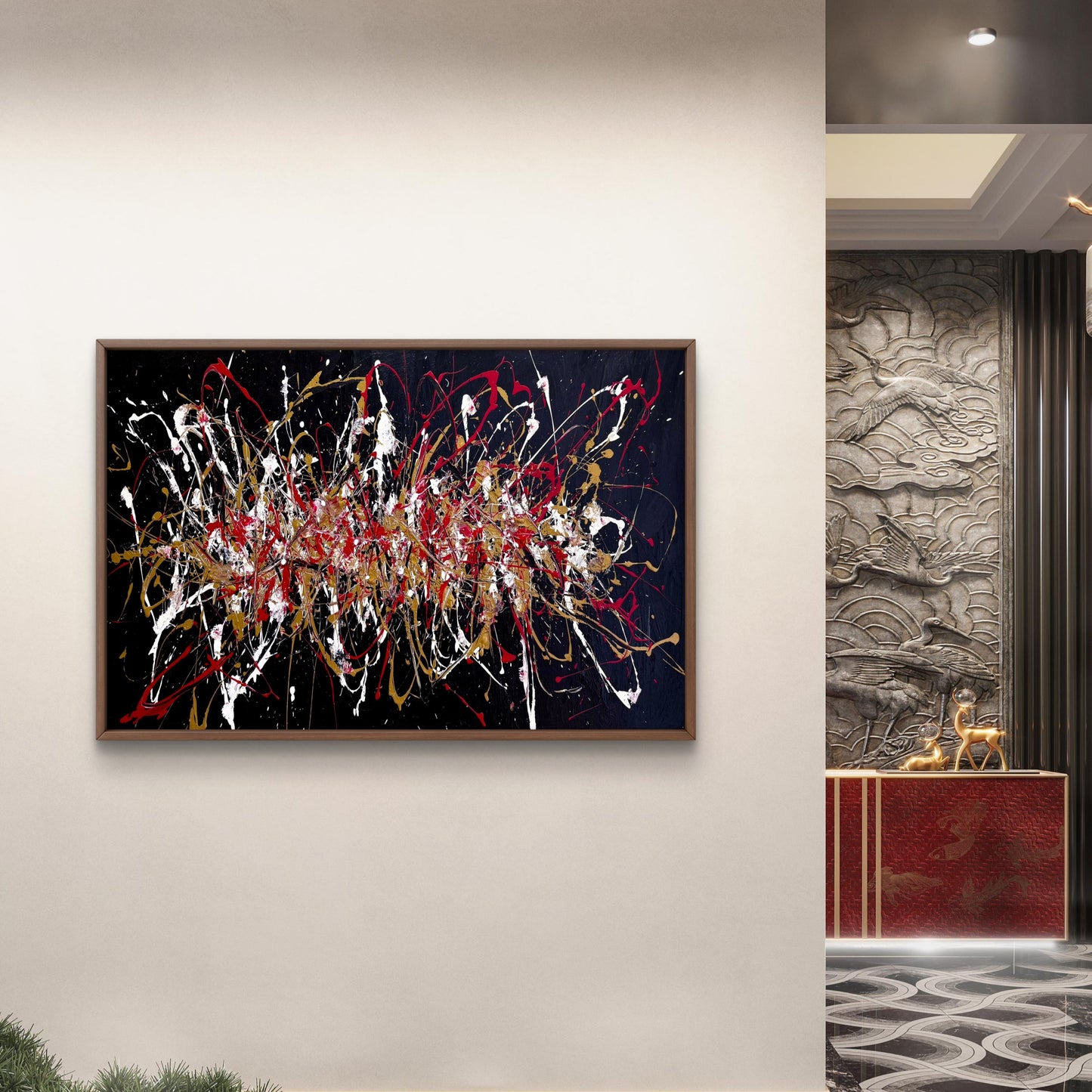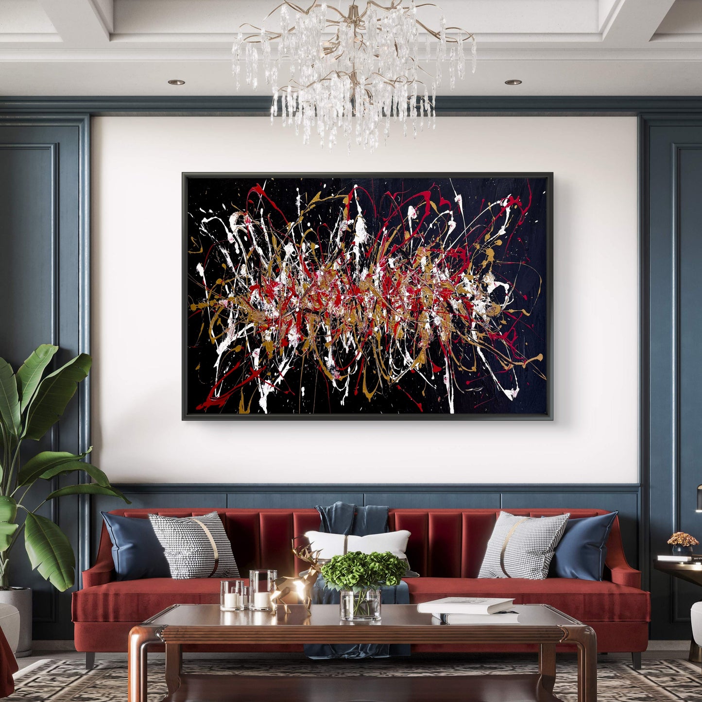 Dramatic, opulent, and high-contrast. This hand-painted, Pollock-inspired canvas unleashes ribbons of white, red, and metallic gold across a deep black ground. The layered action-painting technique creates intense rhythm and depth, delivering a statement centrepiece for living rooms, offices, and gallery-style spaces. Each artwork is individually crafted for tactile texture and one-of-a-kind character.