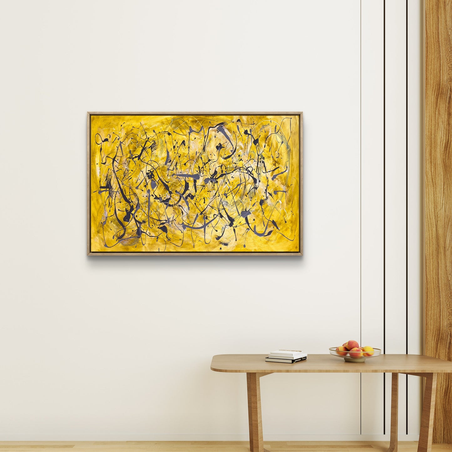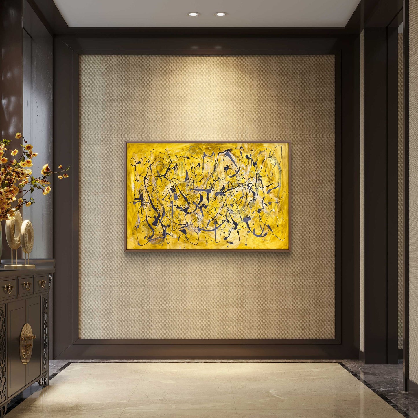 Sunny, graphic, and uplifting. This hand-painted, Pollock-inspired canvas sets a radiant yellow ground alive with inky black pours and soft white/grey highlights. The layered action-painting technique creates rhythm and depth, making a bold centrepiece for living rooms, studios, and gallery-style interiors. Each artwork is crafted by hand for tactile texture and one-of-a-kind character.