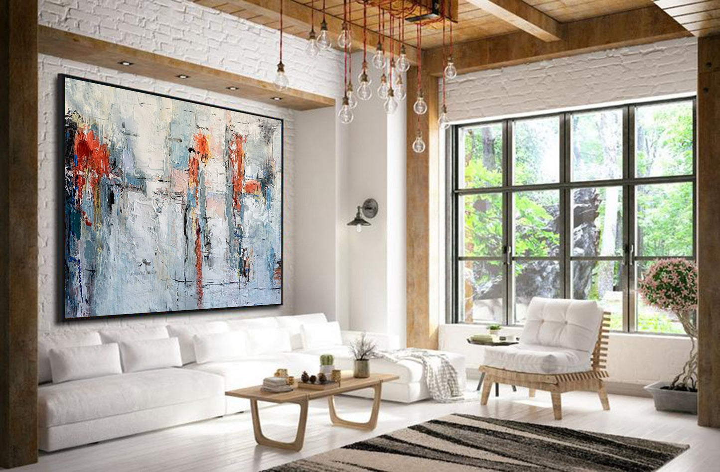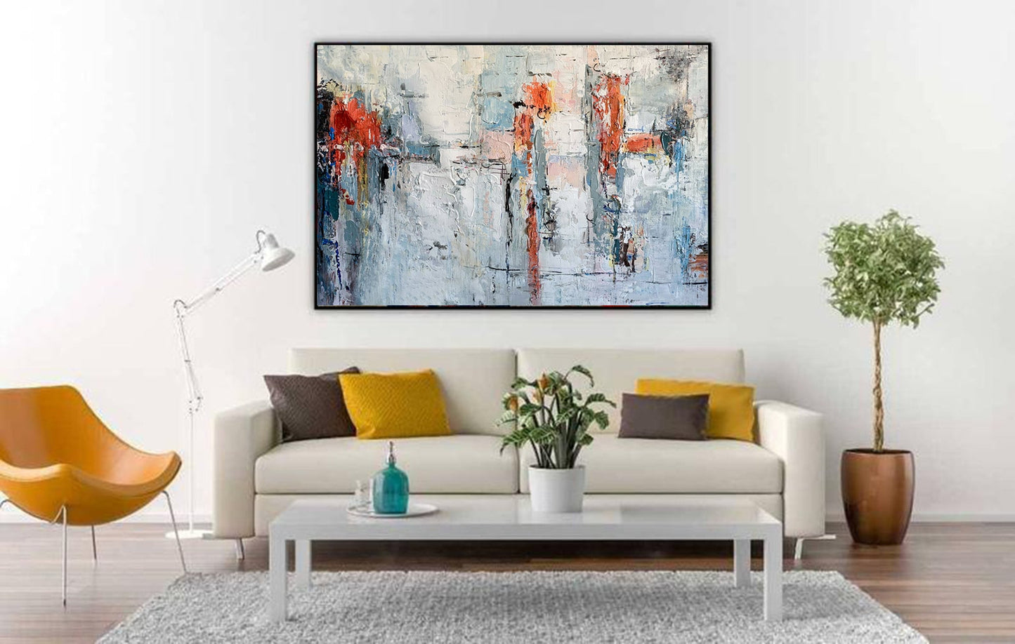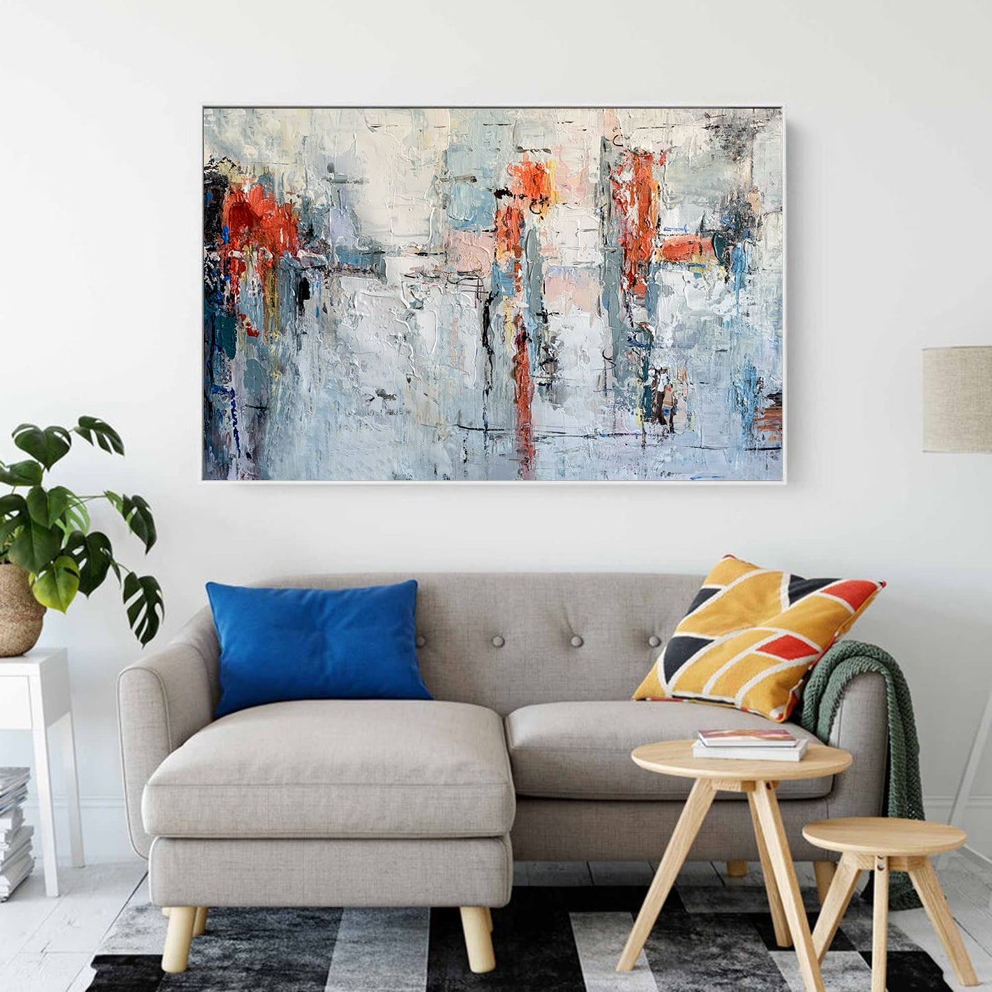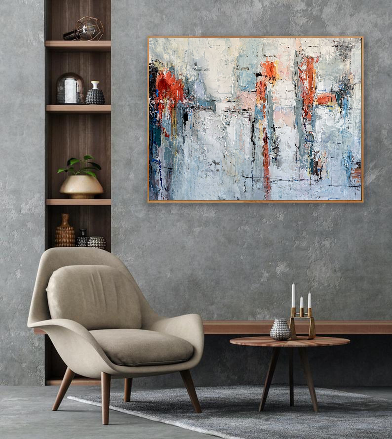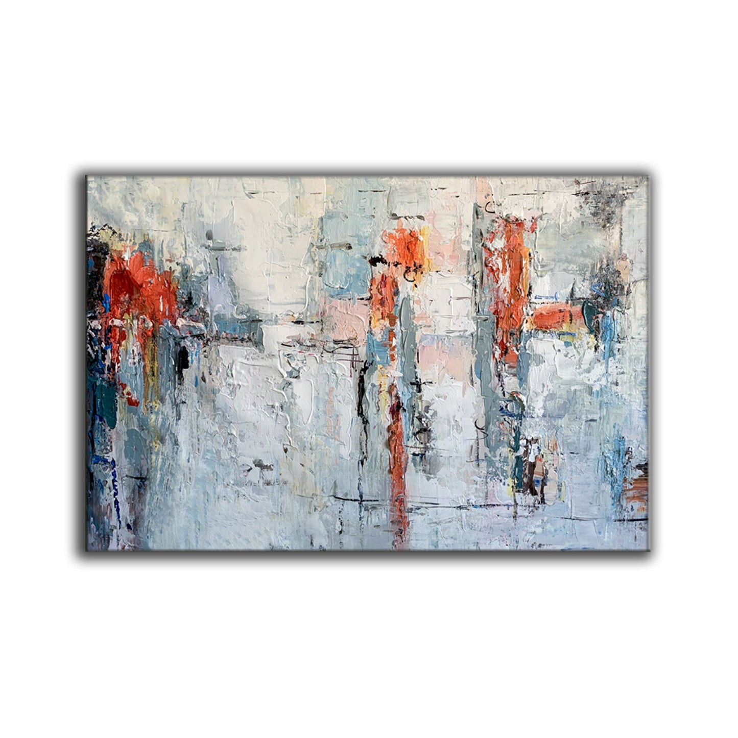 Add movement, structure, and refined texture to your space with this hand-painted abstract cityscape. Featuring a palette of rich coral, cool blue, soft greys, and ivory white, this piece captures the layered energy of an urban skyline or reflected dreamscape. Created with bold palette knife strokes and high-relief impasto texture, the painting offers a tactile experience and striking depth. Ideal for living rooms, bedrooms, hallways, or modern offices, it balances bold colour with atmospheric calm for a statement that’s both sophisticated and expressive.