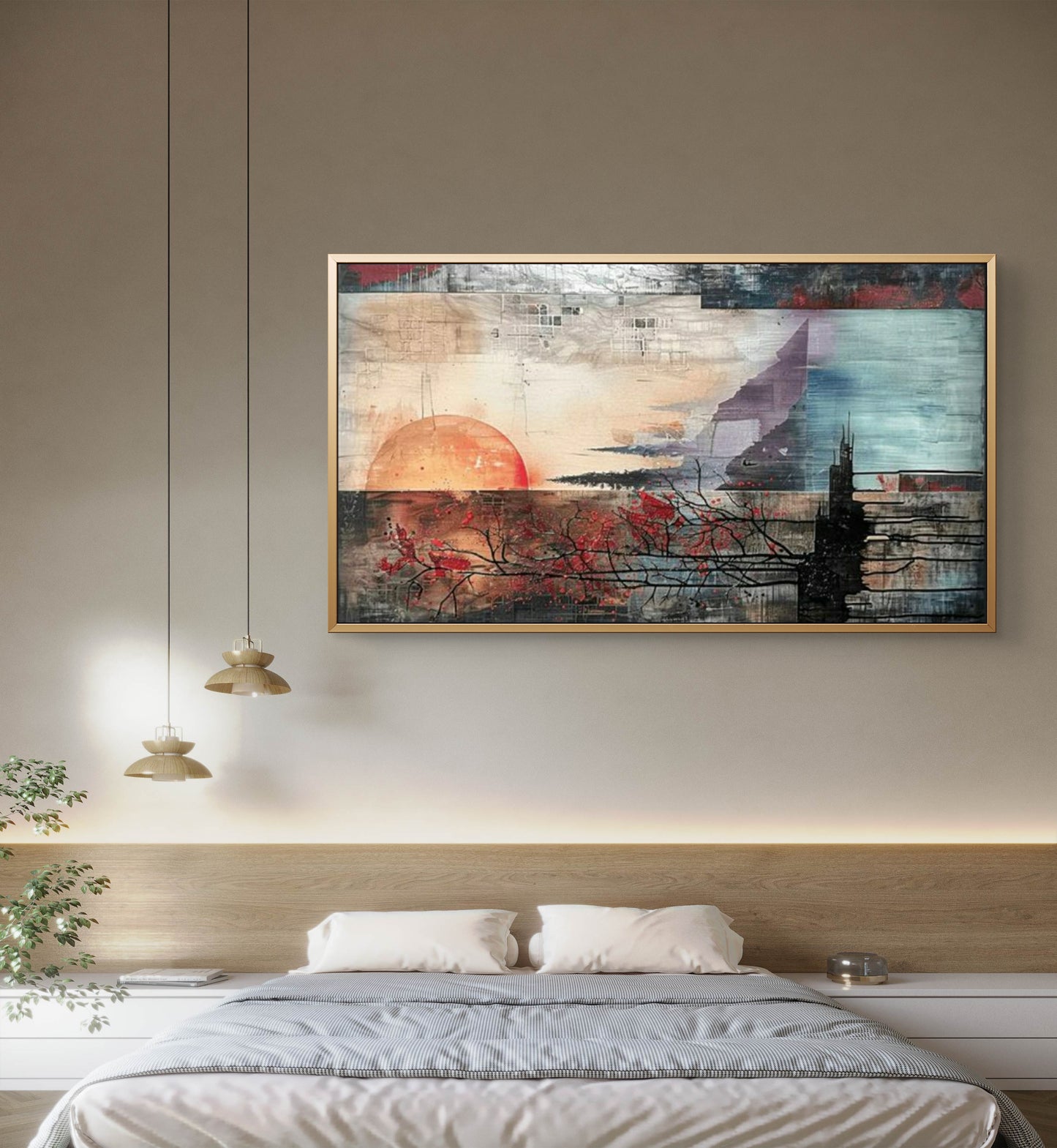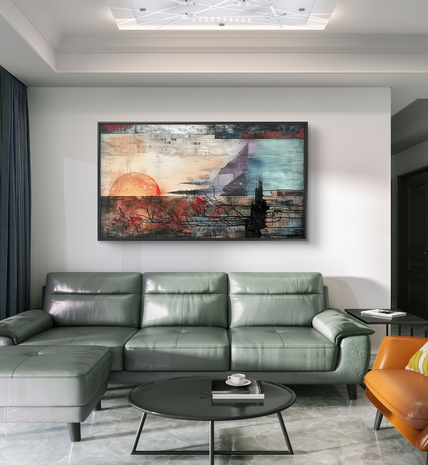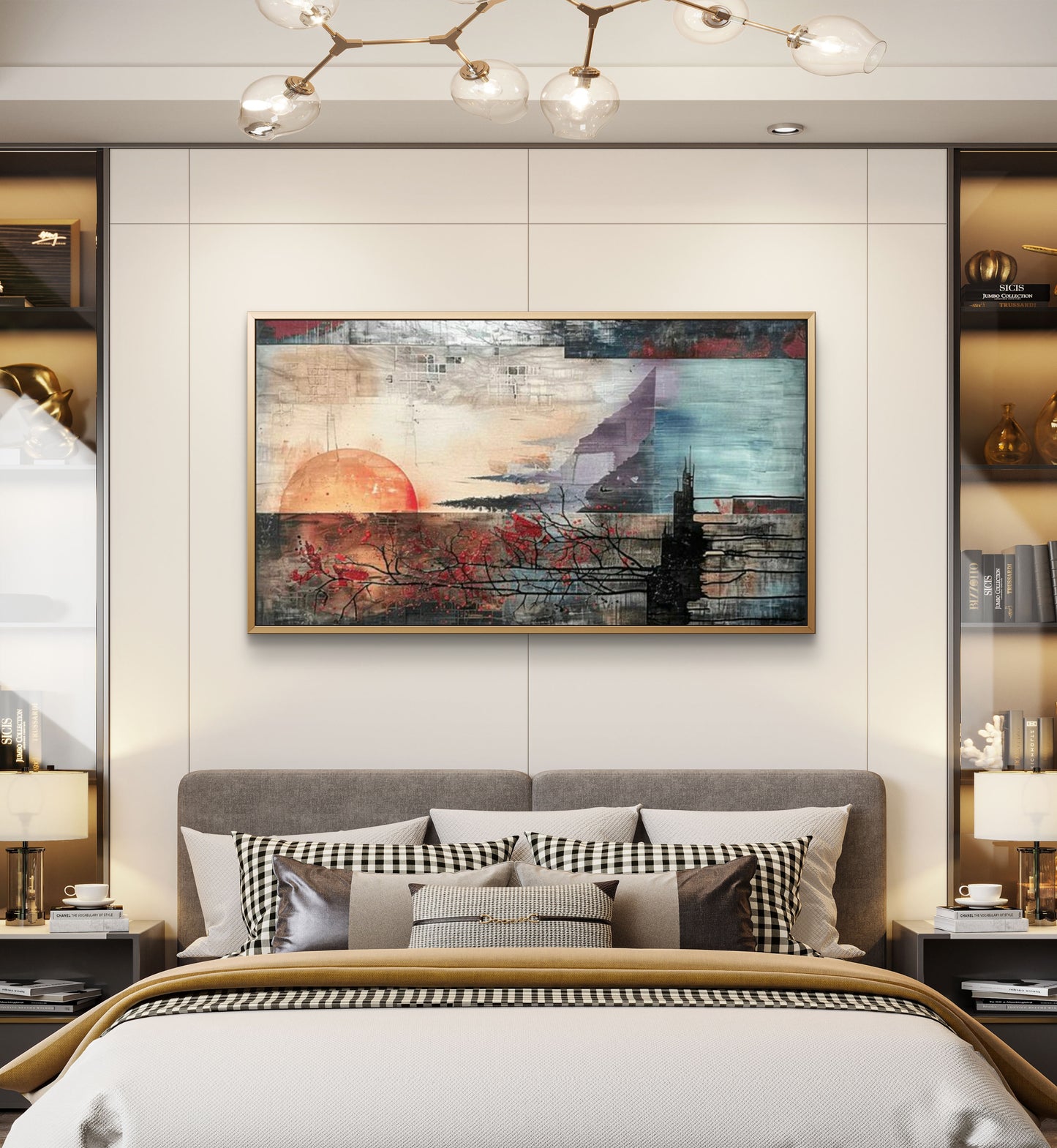 Step into the dreamlike world of Twilight Divide, a hand-painted abstract landscape that fuses the calm of nature with urban edge. A glowing terracotta sun splits the canvas, casting its warm light over fragmented trees, jagged peaks, and reflected waters in pale teal. The left side drips with deep charcoal and crimson foliage, while the right side fades into geometric impressions and soft lavender mountains.