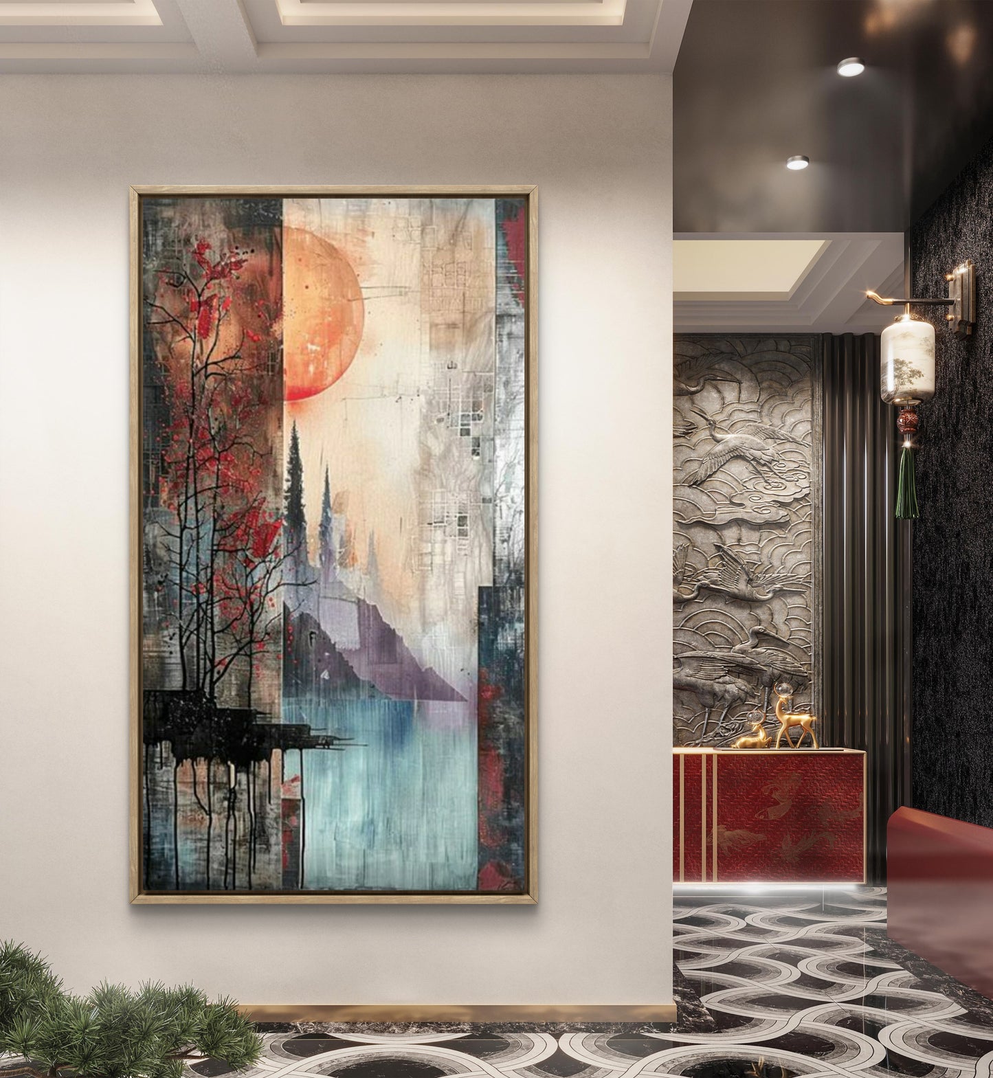 Twilight Divide – Vertical Abstract Landscape Wall Art with Trees, Sun & Mixed Media Texture