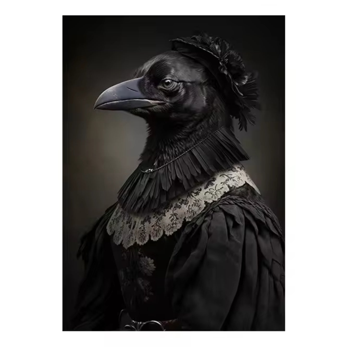 This unique Gothic wall art features an exquisitely detailed crow dressed in Victorian-era clothing, complete with lace collar, dark ruffles, and a feathered hat. A surreal blend of animal portraiture and human refinement, this piece radiates dark elegance and mysterious charm.