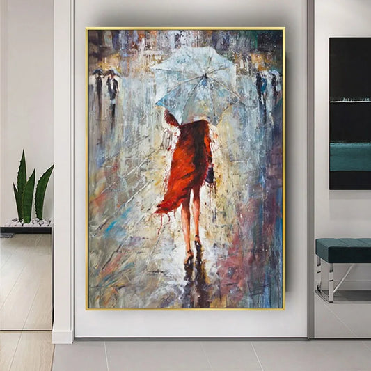 Rainy Elegance – Woman with Umbrella in Red Dress Hand-Painted Figurative Canvas Art