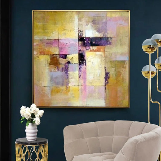 Geometric Abstract Wall Art – Hand-Painted Modern Textured Canvas Painting in Gold and Purple
