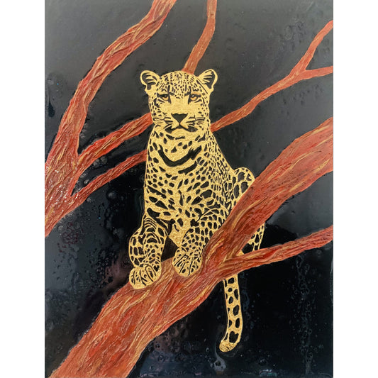 Golden Leopard on Red Tree – 3D Textured Wildlife Wall Art