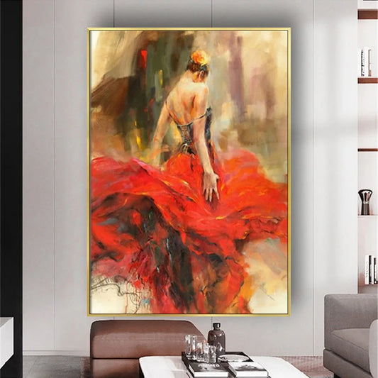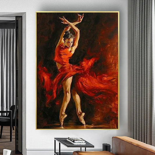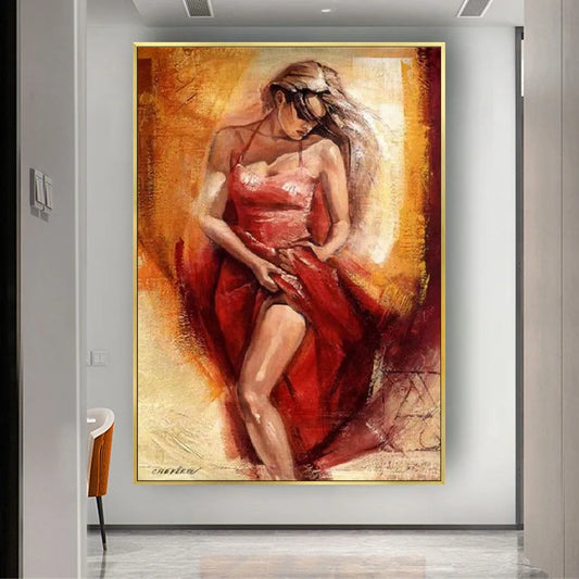 Scarlet Grace – Elegant Dancer in Red Dress Hand-Painted Figurative Canvas Art