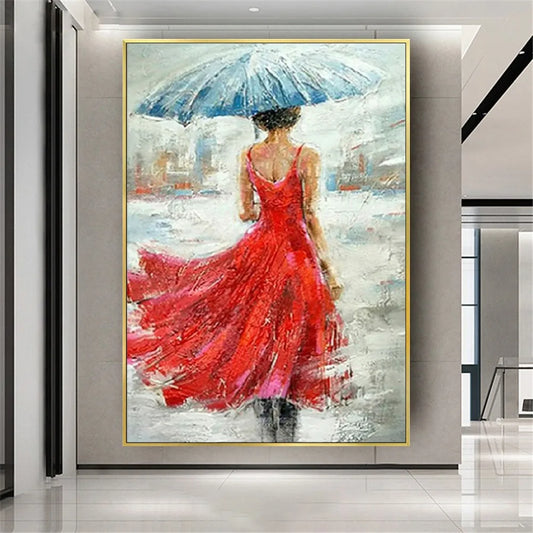 City Rain Muse – Woman in Red Dress with Umbrella Hand-Painted Canvas