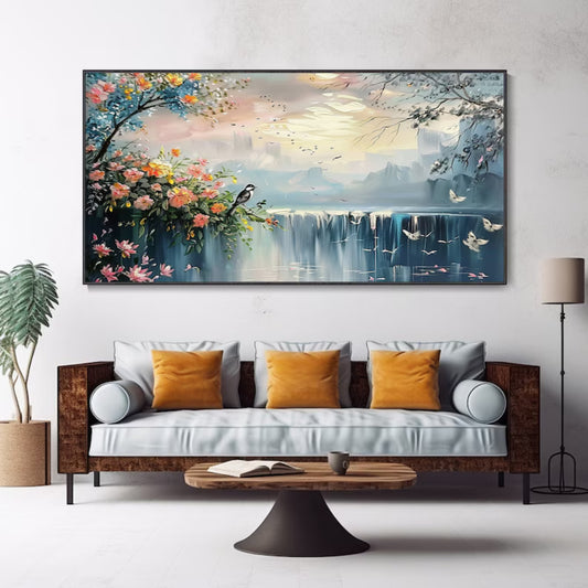 Whispers of Serenity – 3D Impasto Waterfall Painting with Blossoms & Birds