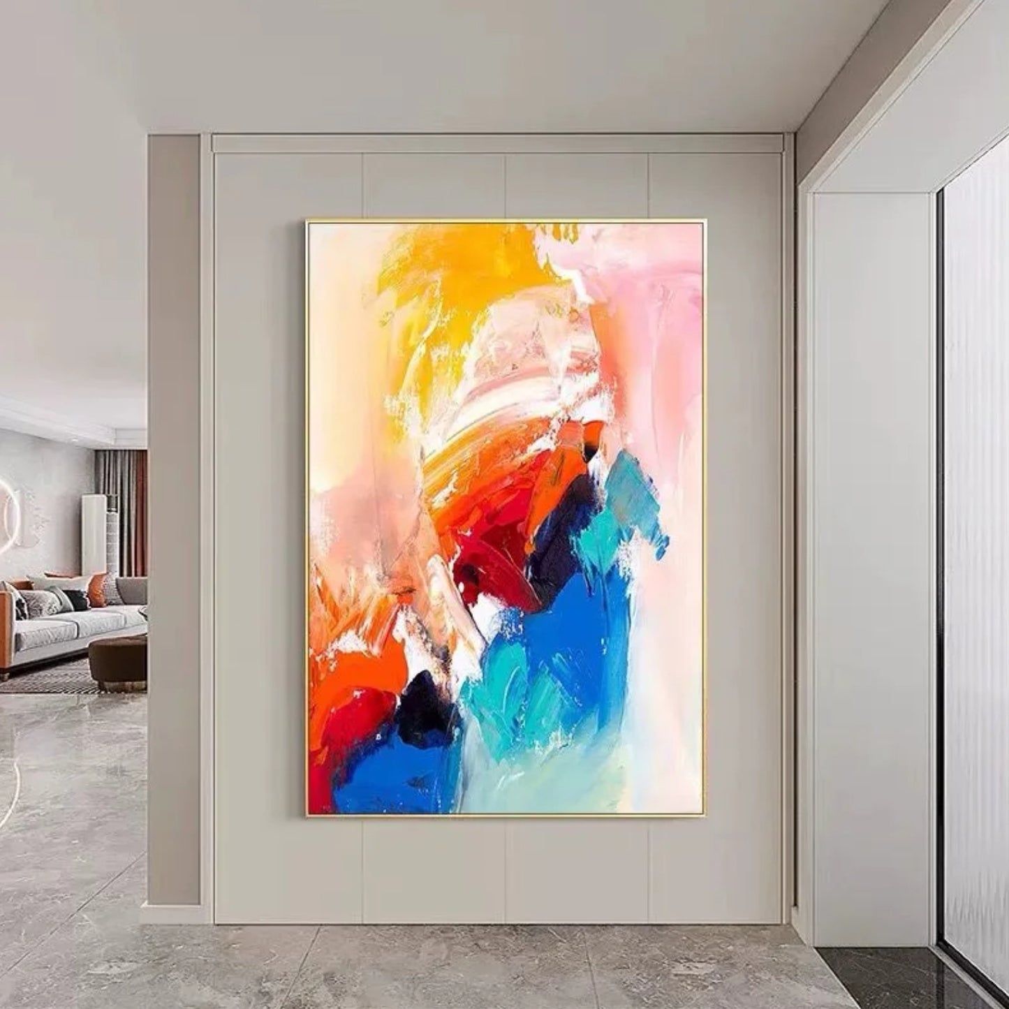 Where colour becomes emotion. This dynamic hand-painted abstract artwork bursts with energy through bold strokes of yellow, red, blue, and pink. The palette knife technique gives the painting rich depth and movement, evoking passion, creativity, and light. Perfect for modern interiors, creative spaces, or statement walls that deserve a touch of vibrancy and artistic freedom.