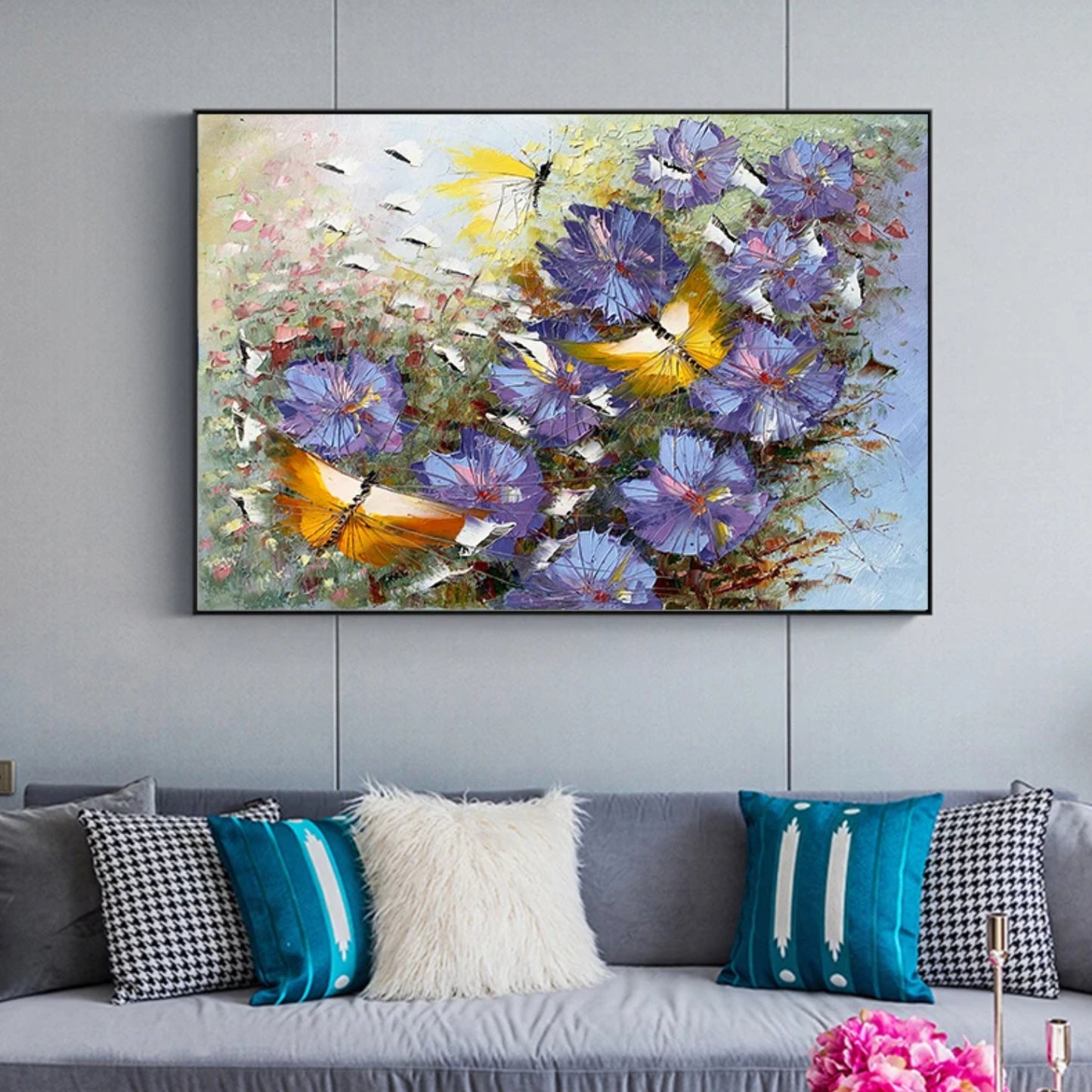 This abstract impasto wall art is a vibrant landscape of colour and texture, where butterflies dance among flowers in a dynamic display of nature's splendour. Rich in detail and bursting with life, each brushstroke adds dimension to the butterflies' wings and the petals they flit amongst, making them almost flutter off the canvas.