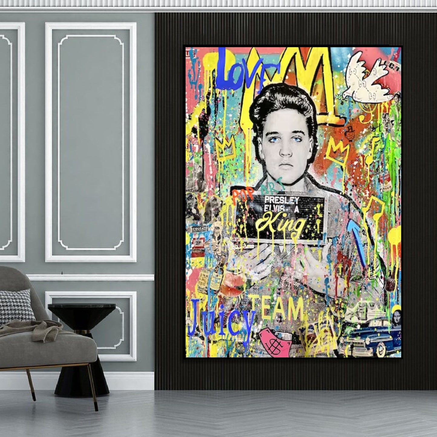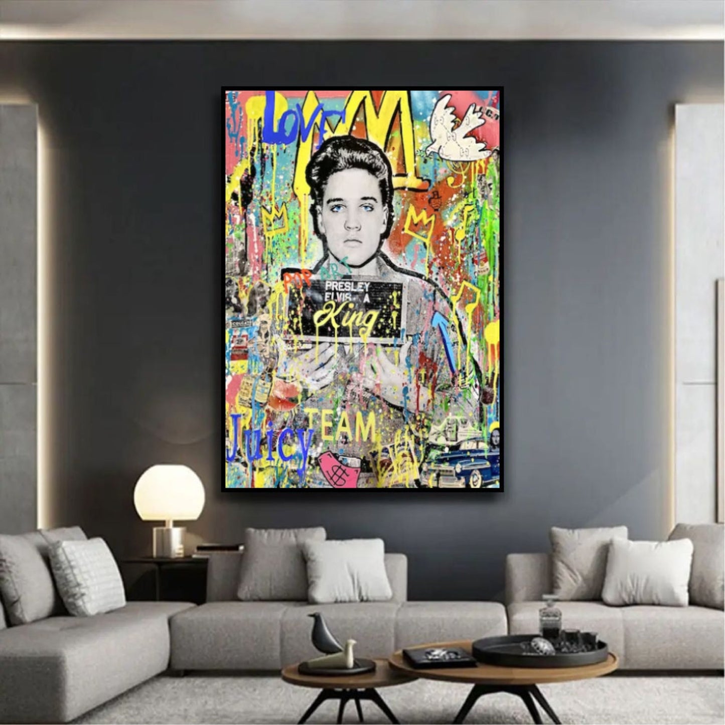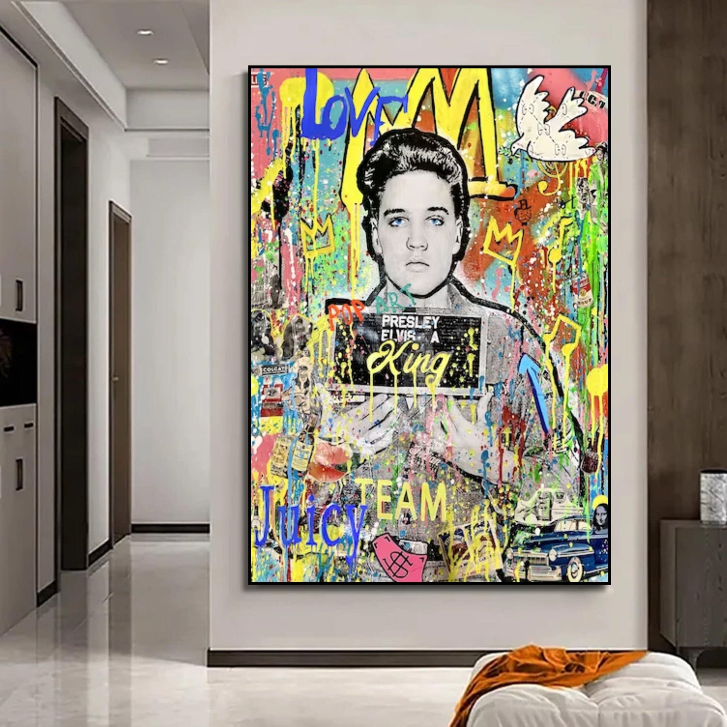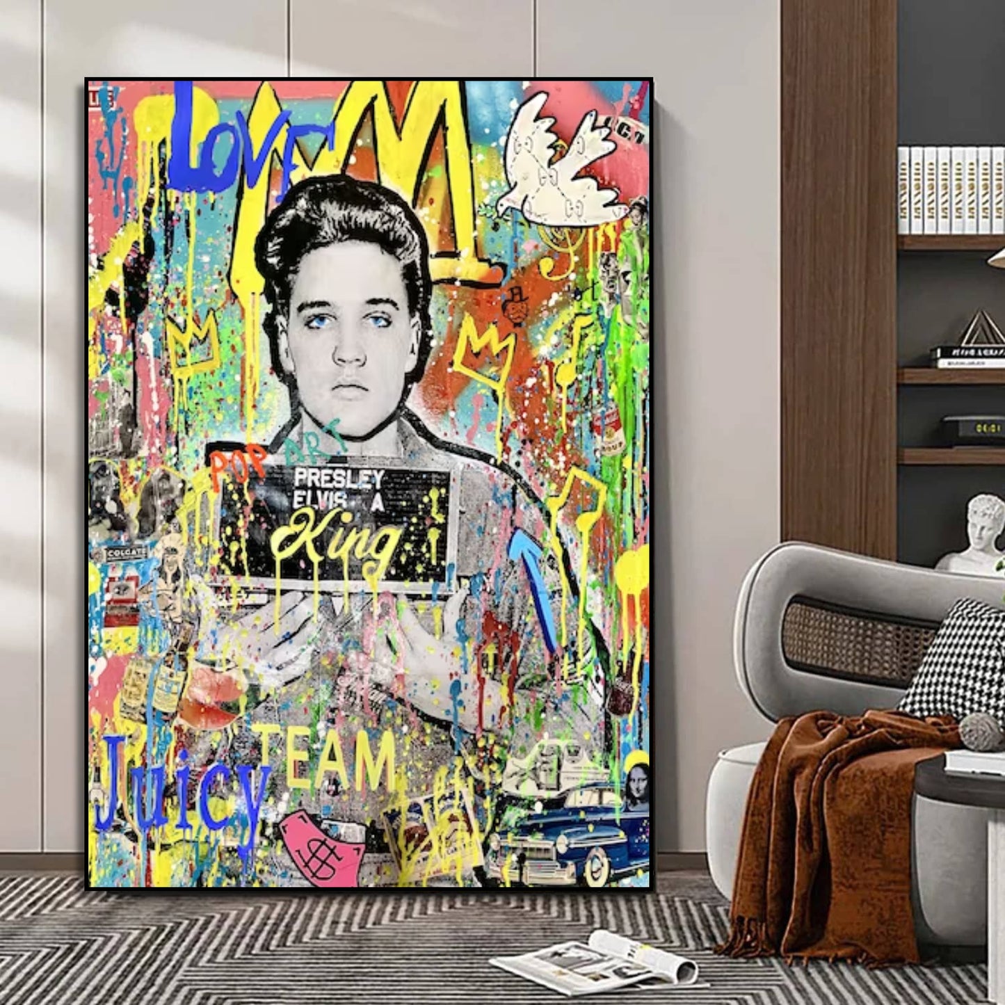 Revitalise your space with our modern Banksy-inspired pop art painting featuring the iconic Elvis Presley. This vibrant artwork pays homage to Banksy's distinctive style while capturing the legendary charisma of Elvis. Perfect for contemporary art enthusiasts, this piece adds a touch of rebellious creativity to your decor. Elevate your space with the fusion of street art and musical history, creating a statement piece that resonates with iconic pop culture.