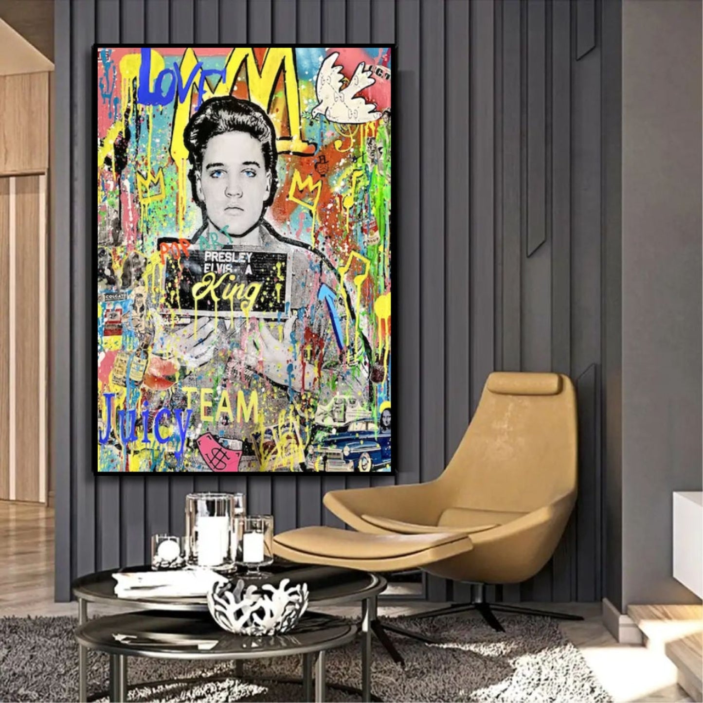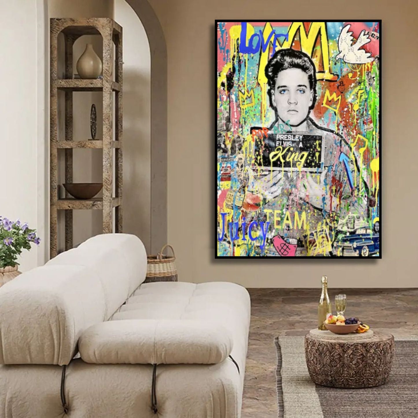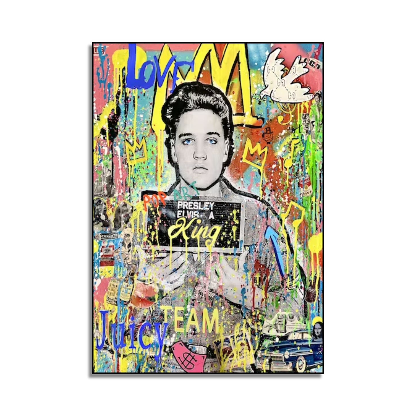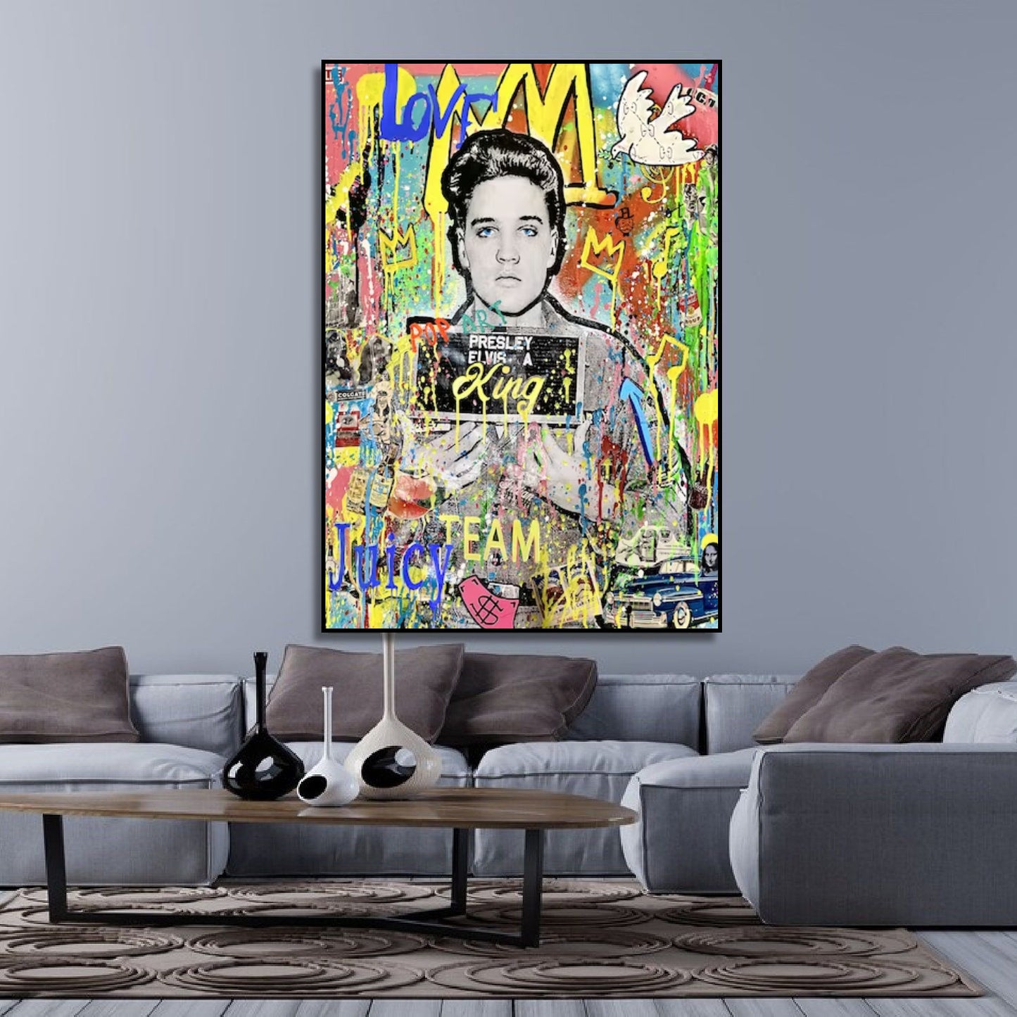 Revitalise your space with our modern Banksy-inspired pop art painting featuring the iconic Elvis Presley. This vibrant artwork pays homage to Banksy's distinctive style while capturing the legendary charisma of Elvis. Perfect for contemporary art enthusiasts, this piece adds a touch of rebellious creativity to your decor. Elevate your space with the fusion of street art and musical history, creating a statement piece that resonates with iconic pop culture.