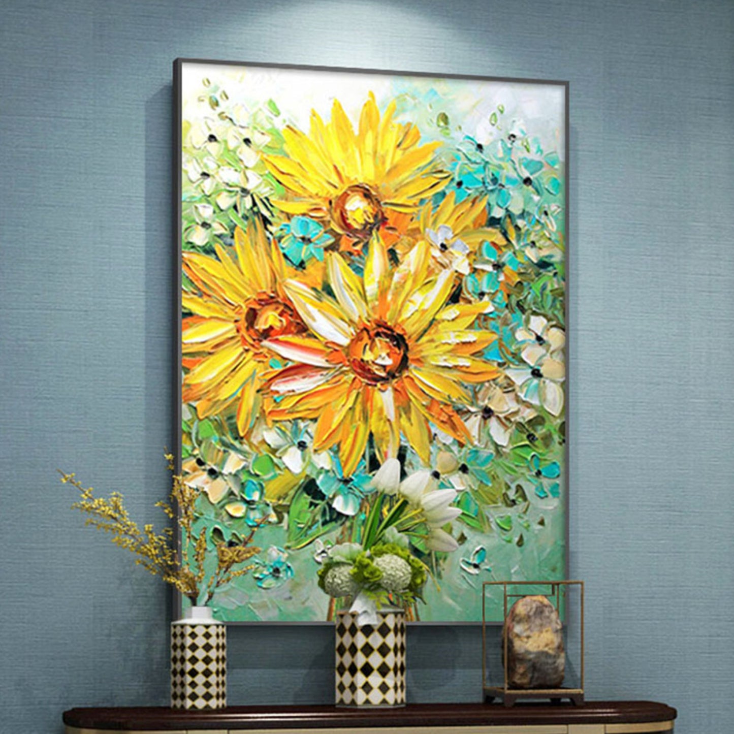 Experience the exquisite beauty of our 'Beautiful Yellow Daisy Flowers 3D Texture Painting.' This stunning artwork showcases the vibrant sunflowers through meticulous techniques such as impasto, glazing, and layering. The artist's masterful use of shades in yellow and green brings the sunflowers to life, creating a captivating sense of depth and texture. Brighten your space with the radiance of nature's finest in this large and detailed masterpiece.