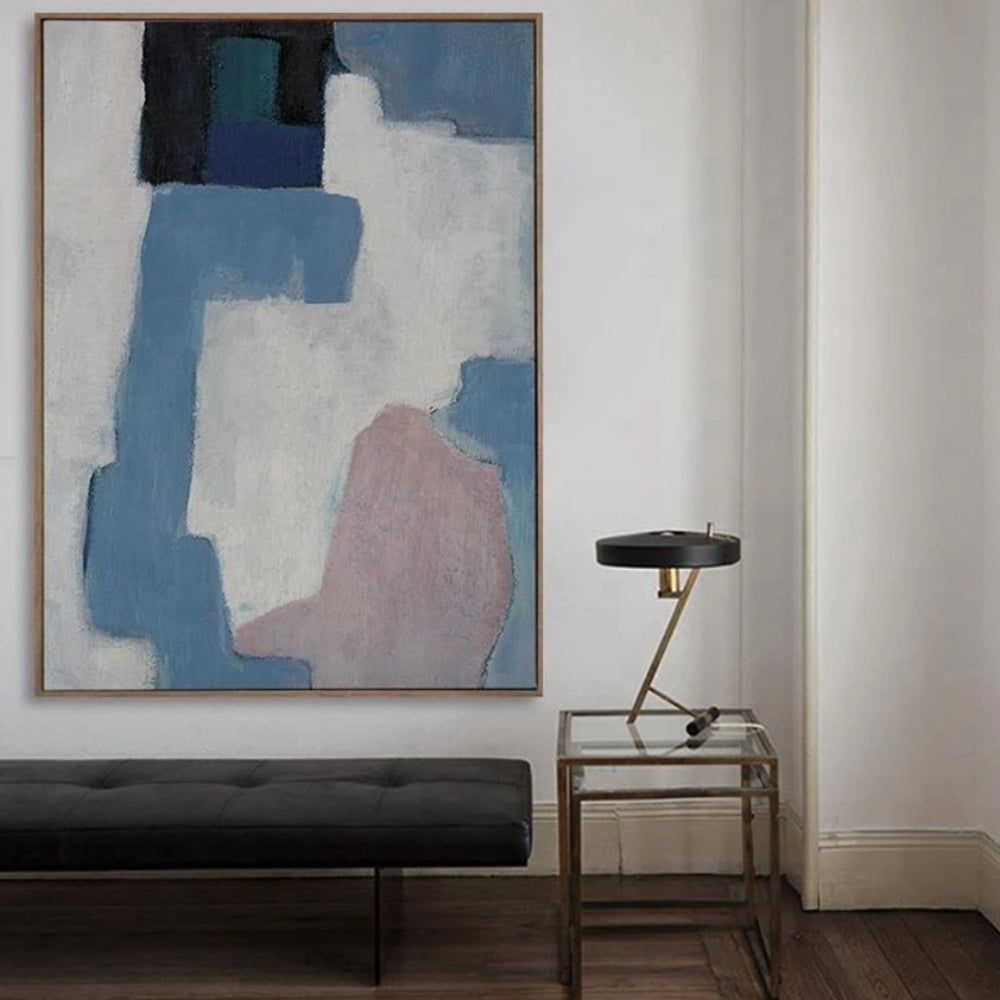 The painting is a symphony of hues, with dominant shades of blue and white, creating a striking contrast. The abstract nature of the artwork invites viewers to interpret the forms and shapes in their own unique ways.