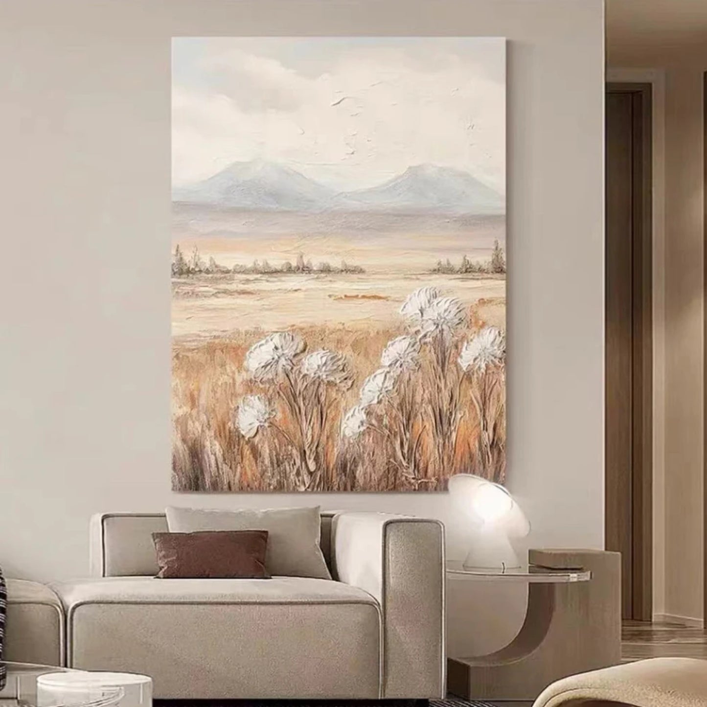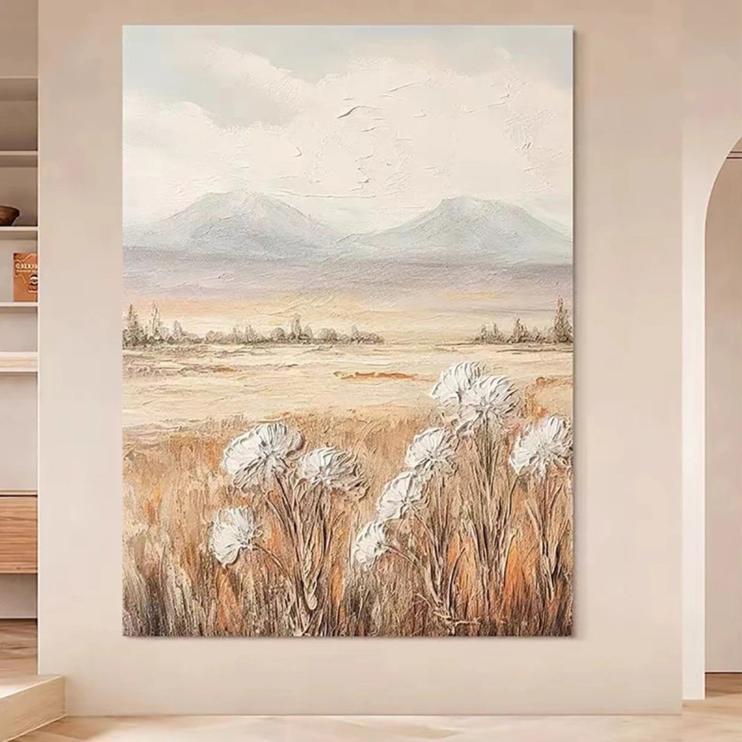 Bring a sense of calm to your home with this beautiful landscape painting featuring serene mountains and delicate wildflowers. Perfect for enhancing any room, this artwork adds a touch of nature's tranquility to your decor. The soft, earthy colours and detailed textures create a peaceful atmosphere, making it ideal for living rooms, bedrooms, or any space in need of a soothing aesthetic. Transform your home with this stunning and tranquil landscape painting.