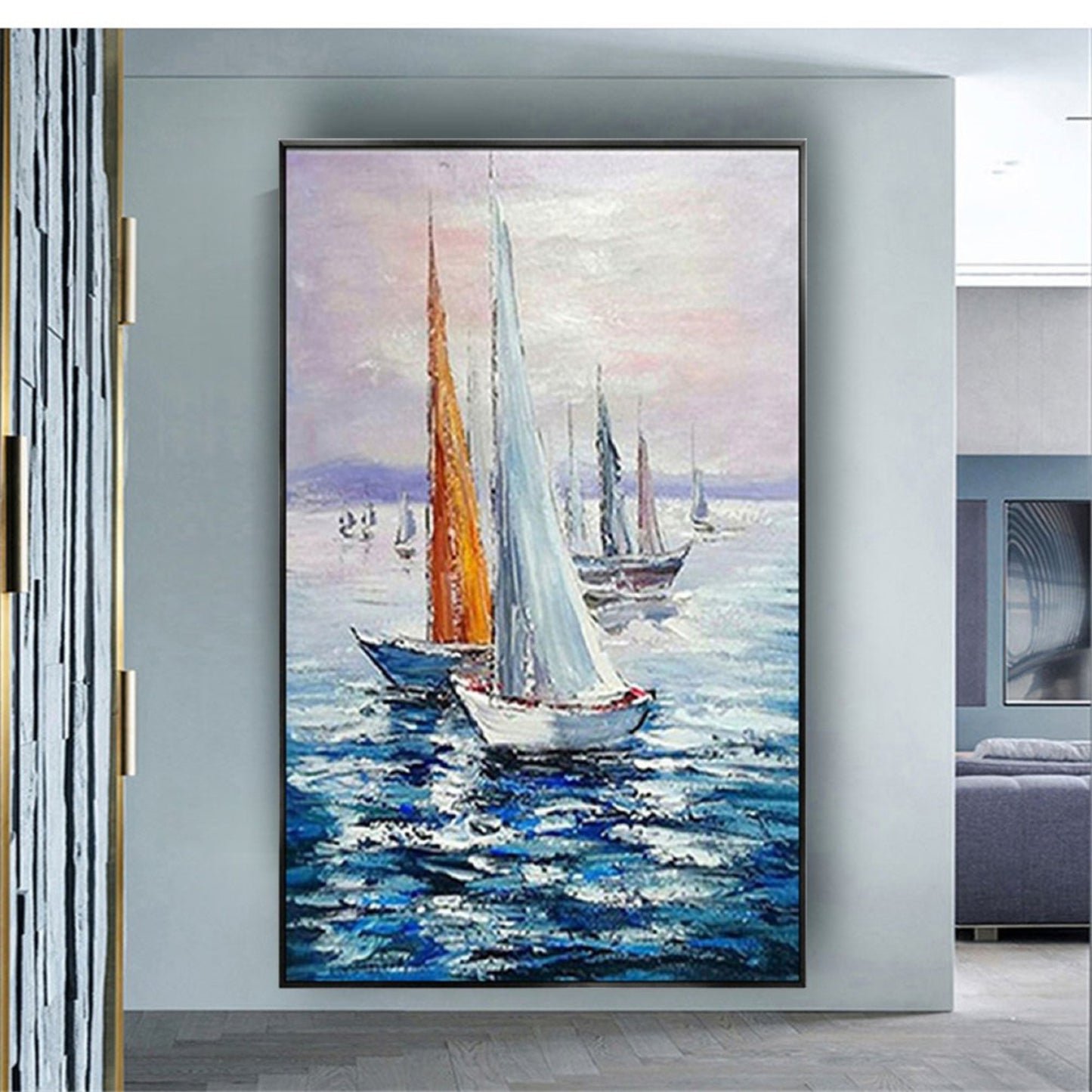 This enchanting artwork showcases a fleet of sailboats adorned with a kaleidoscope of colours, gracefully gliding upon the shimmering waters. The use of oil paints brings an exquisite depth and texture to the composition, making every brushstroke come alive. Whether you're a sailor at heart or simply drawn to the allure of coastal charm, this painting will infuse your space with a sense of joy and tranquility. Let the vivid hues and serene imagery transport you to a world where the sea and sky merge in a symphony of colors and dreams.