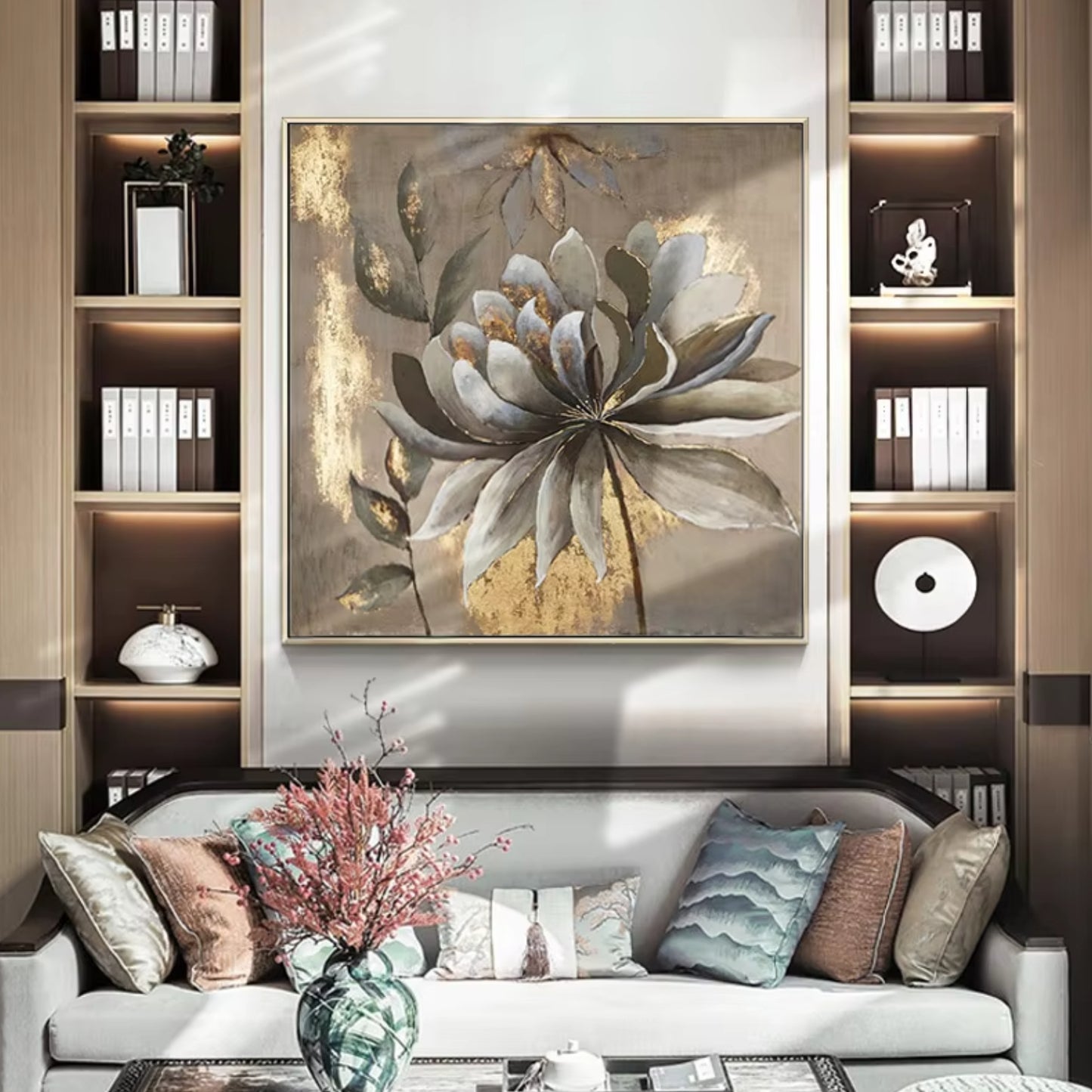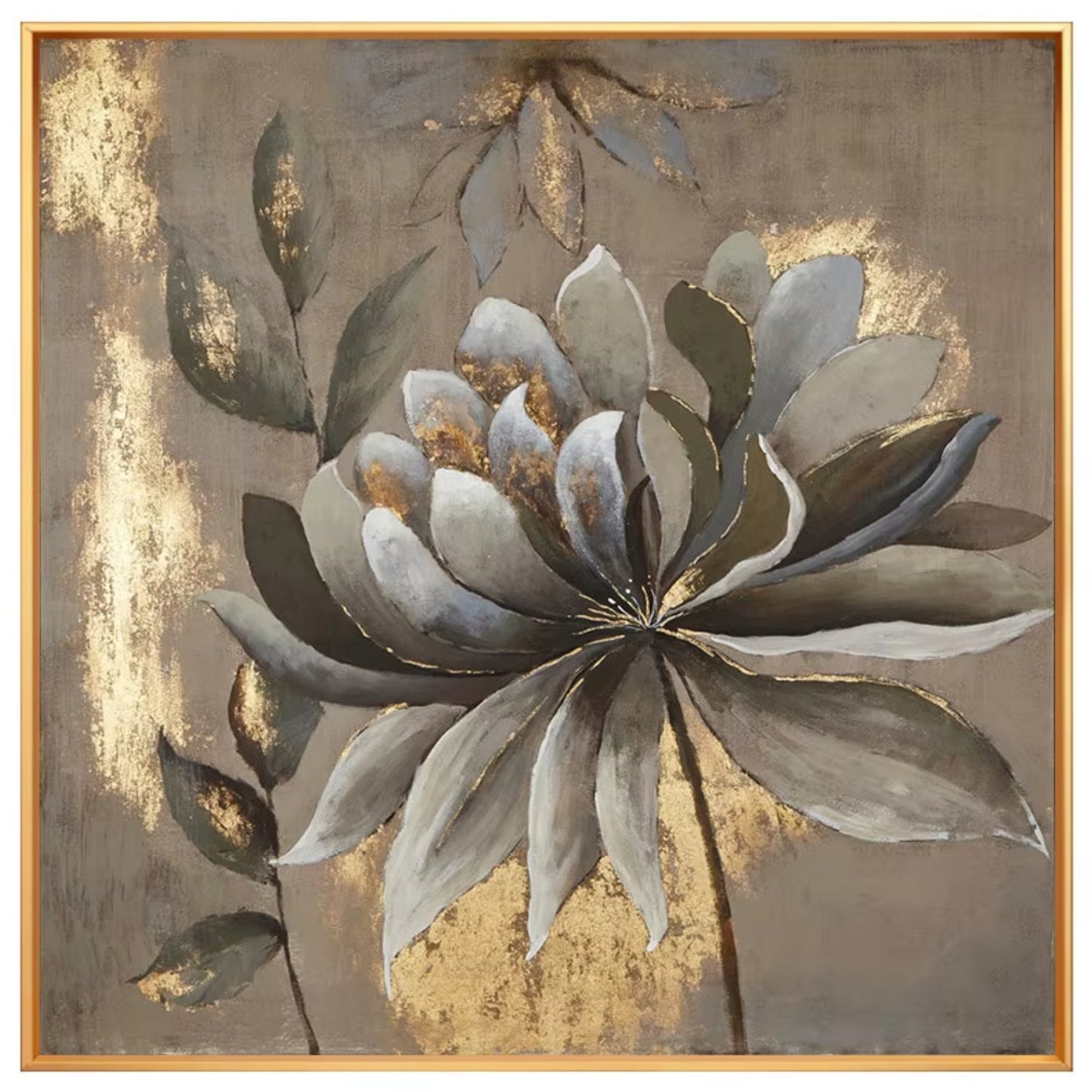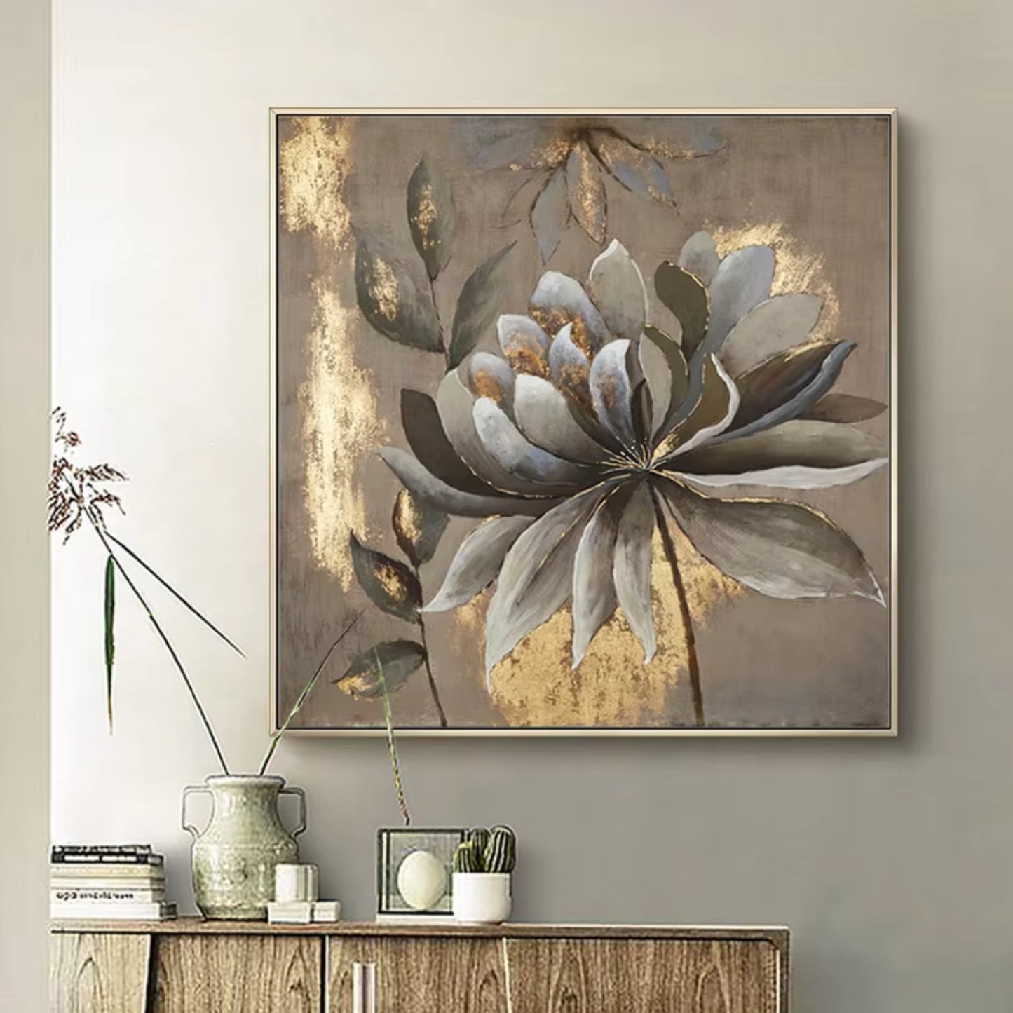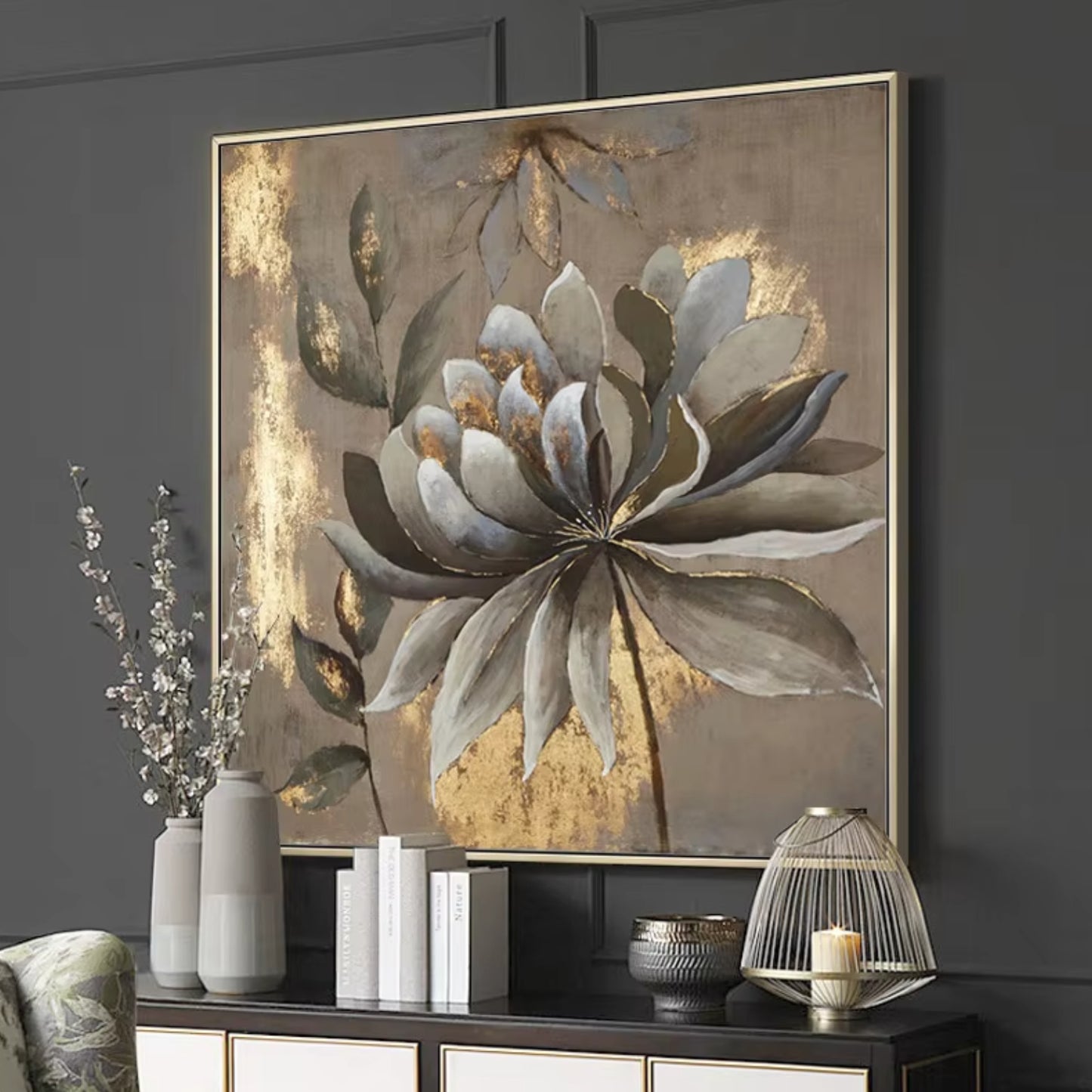 Where nature meets luxury. Golden Bloom is a hand-painted floral masterpiece that captures the serene beauty of a lotus flower in full bloom. Each petal is layered in soft taupe, olive green, warm grey, and dusty blue, delicately accented with shimmering gold leaf for a refined, luminous finish. The raised textures and metallic highlights create stunning visual depth — transforming any wall into an elegant focal point.