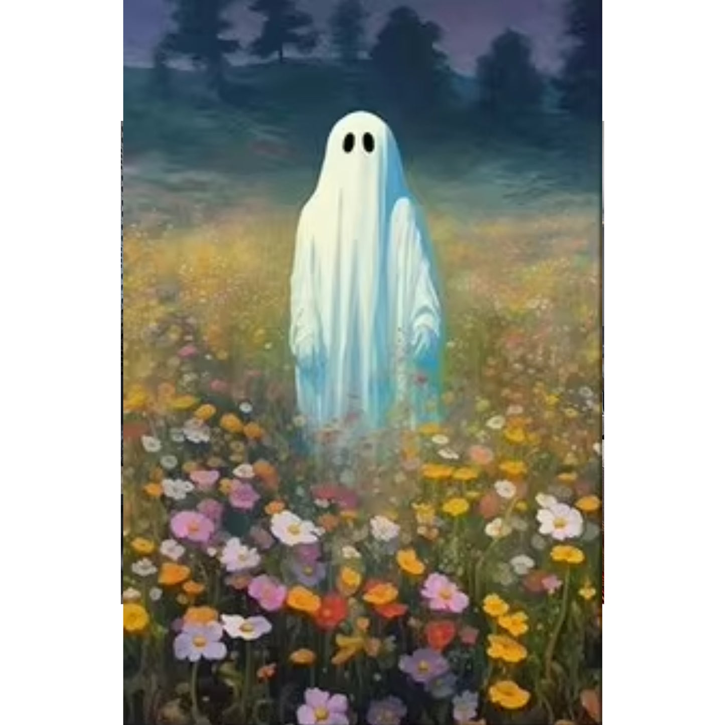 Step into a dreamlike meadow with this enchanting artwork featuring a friendly ghost among a sea of wildflowers. Blending gentle supernatural charm with soft, colorful blooms, this piece creates a mood of peaceful magic—more playful than spooky.