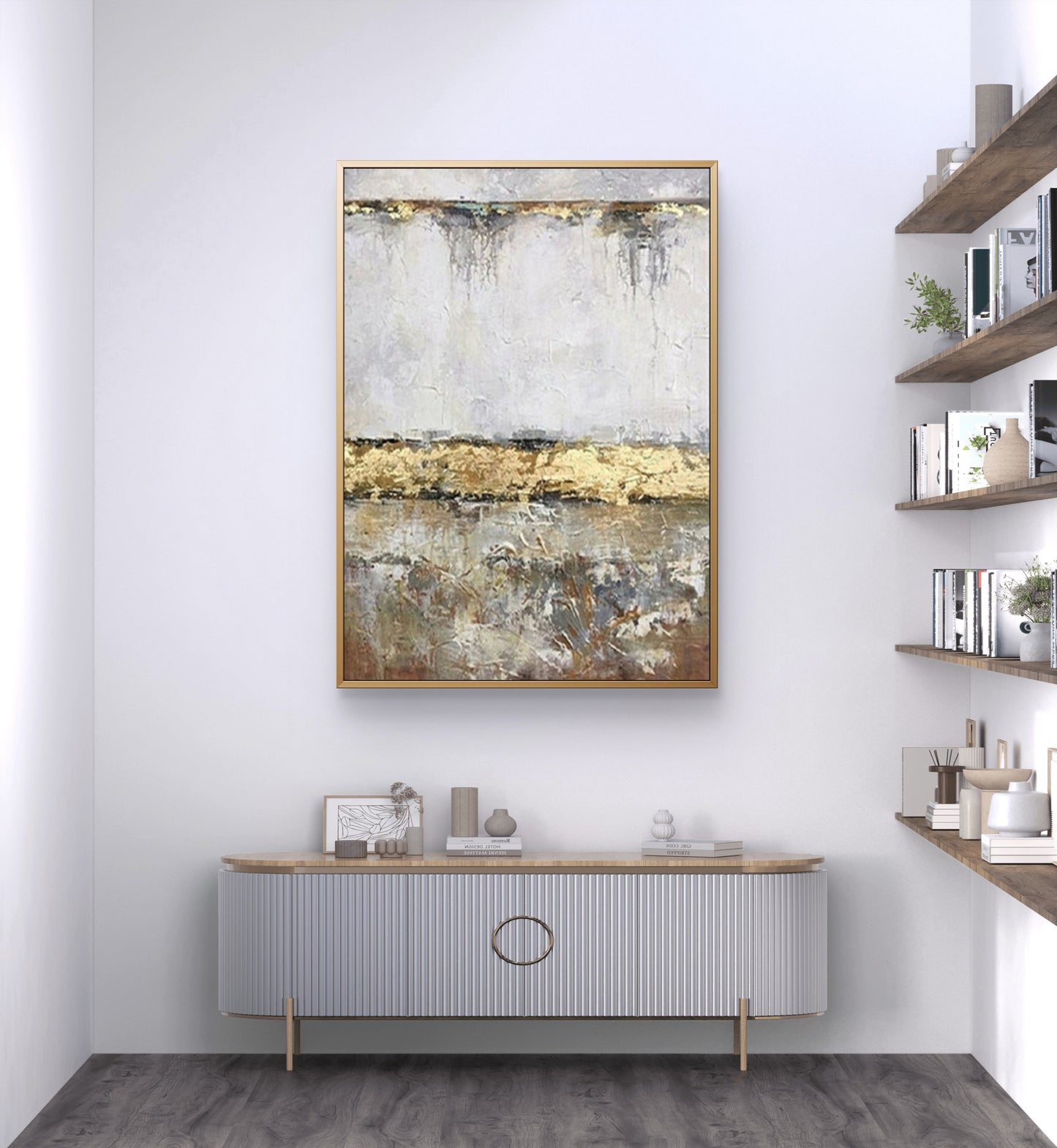 The Golden River 100% Hand-Painted Minimalist Painting features flowing metallic textures and soft neutral tones, creating a serene and luxurious focal point for modern interiors. Its palette of gold, white, and warm beige brings an elegant glow to living rooms, bedrooms, offices, and hotel-style spaces.