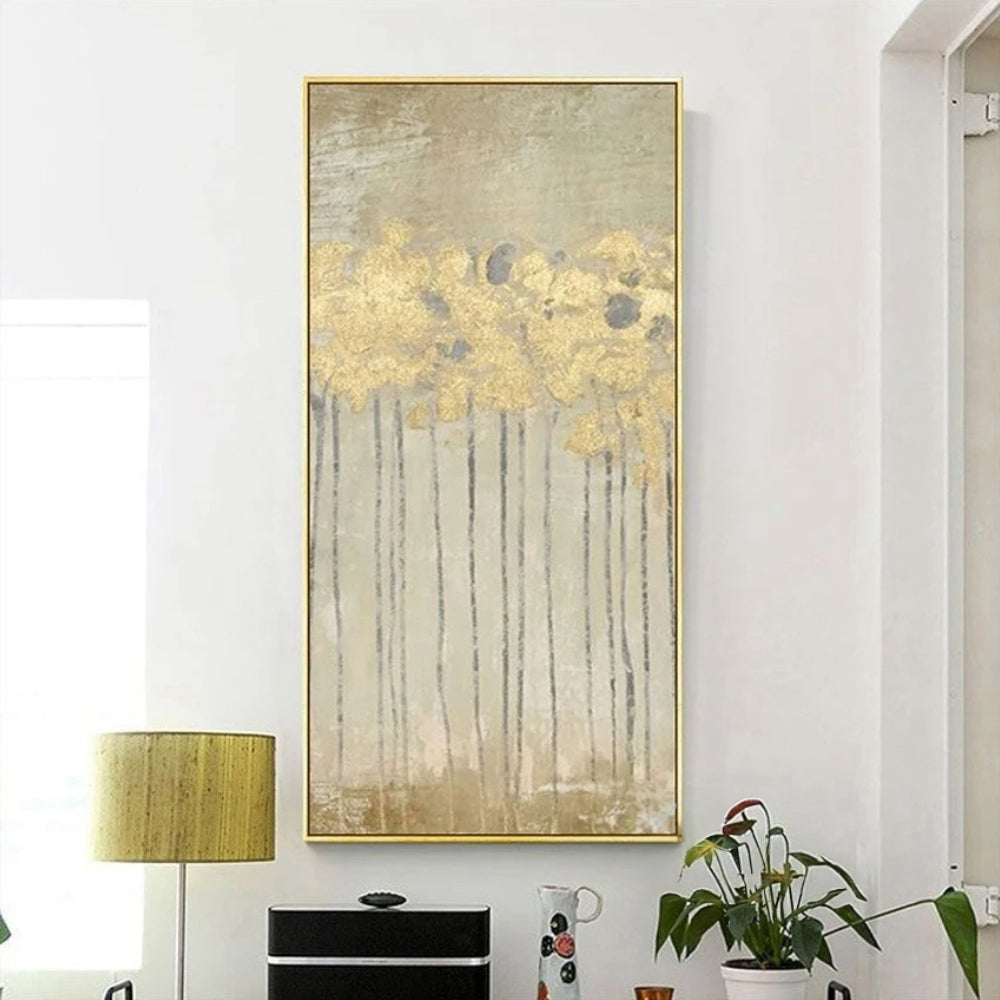 This abstract painting features fortune trees in a stunning shade of golden yellow, symbolizing prosperity and good luck. The trees are intricately detailed, adding depth and dimension to the artwork. The mural is set against a contrasting backdrop, which enhances the vibrant colours of the trees and creates a visually appealing contrast. This painting is not just a decorative piece, but a conversation starter that adds character and personality to your living room. It's a perfect blend of art and symbolism, making it a unique addition to your home decor.