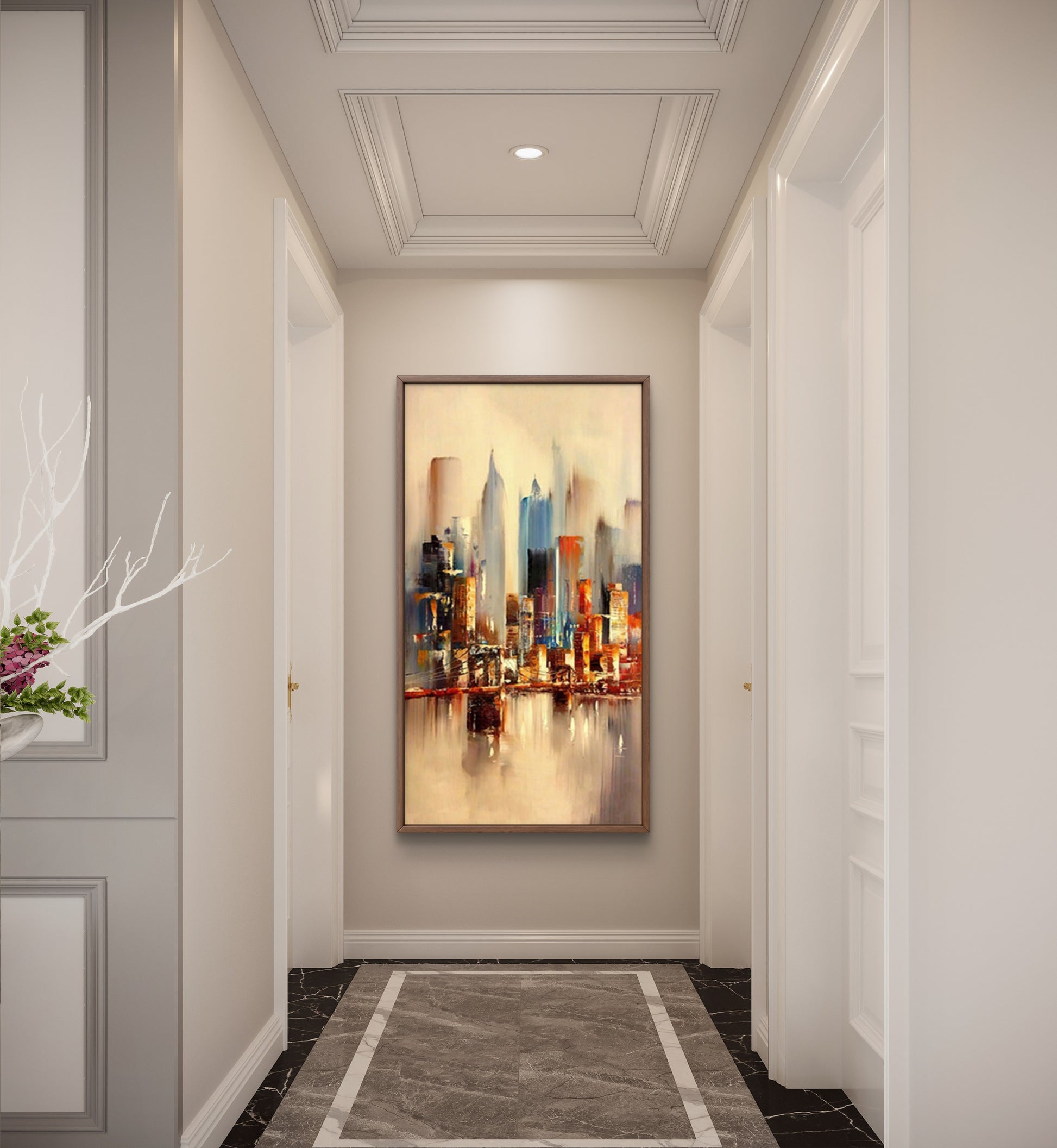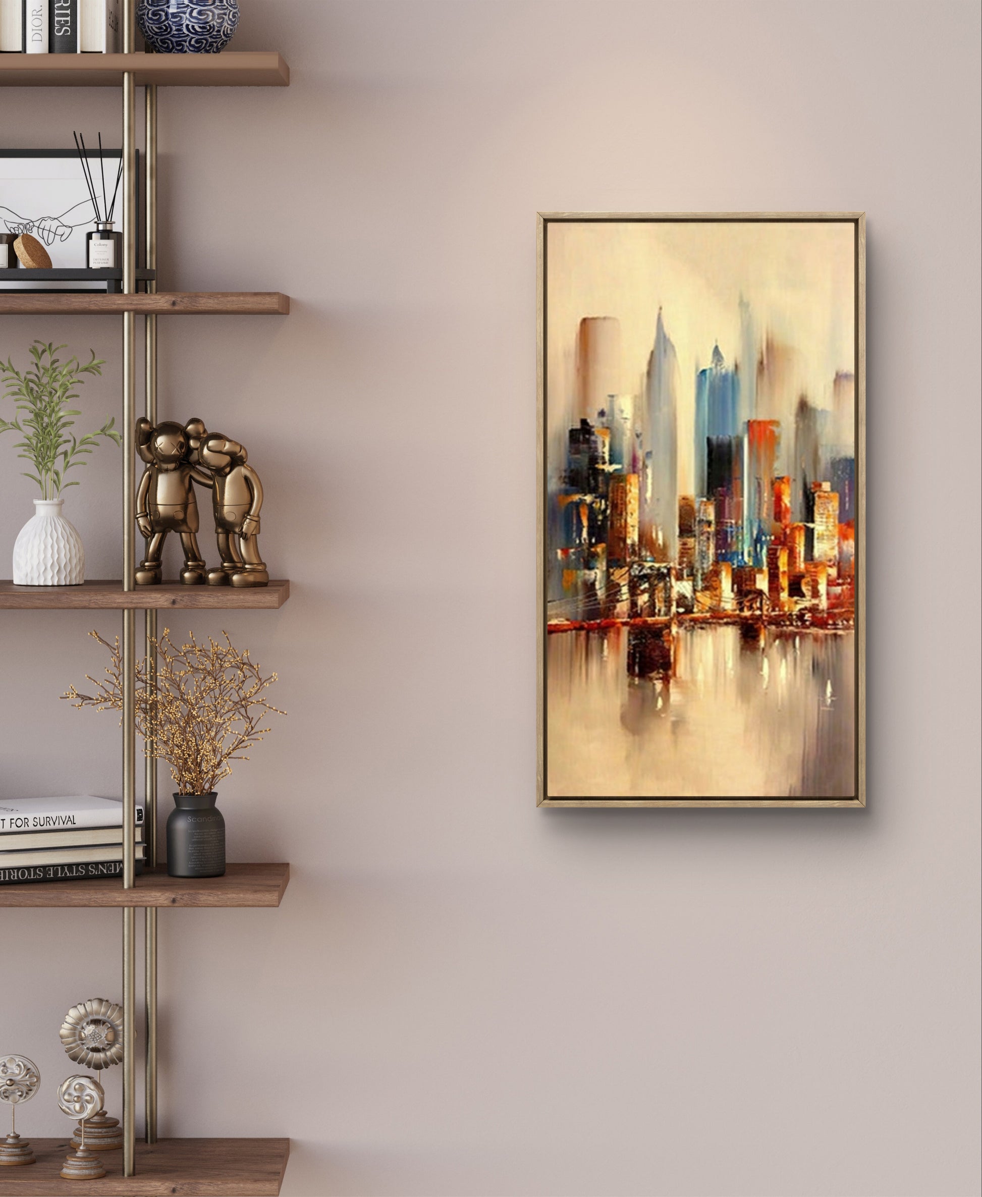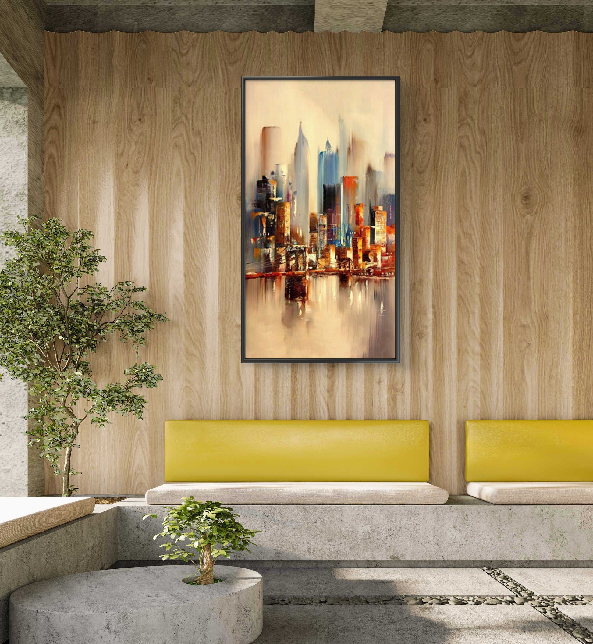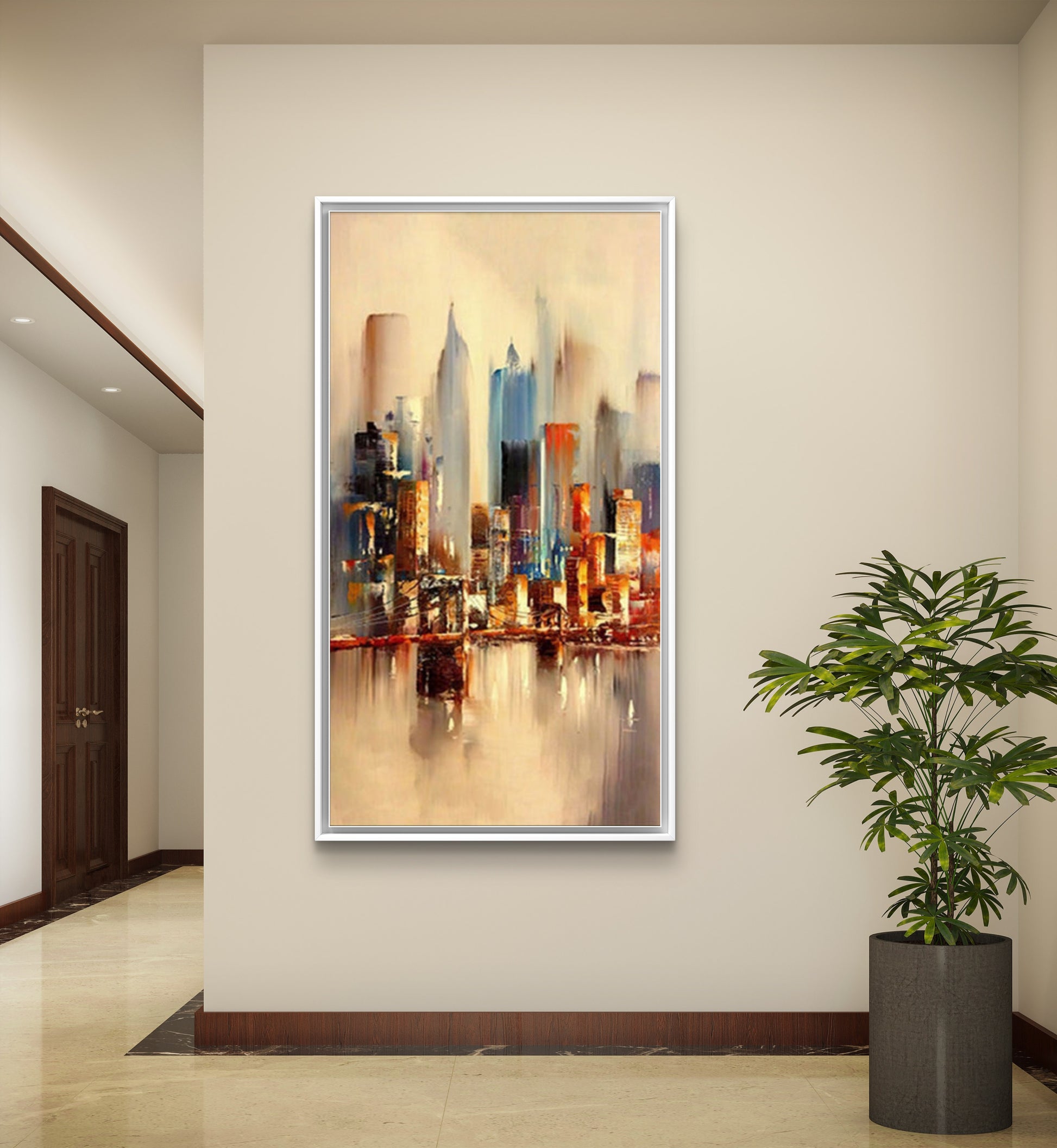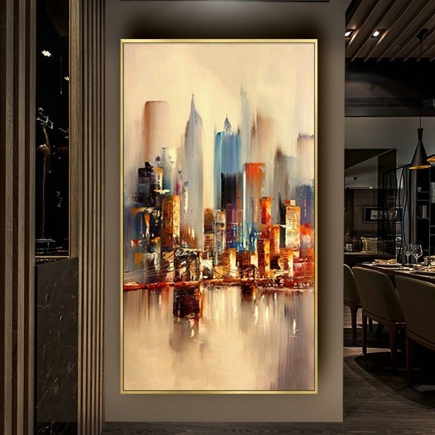 Elevate your modern home decor with a captivating abstract cityscape painting. Featuring towering buildings and mesmerizing water reflections, this large-scale masterpiece is a striking addition to any space. The artist's vibrant palette and dynamic brushwork infuse the artwork with energy and motion, while the water's reflective surface lends depth and authenticity. Transform your surroundings with this stunning piece, combining personality and sophistication effortlessly.