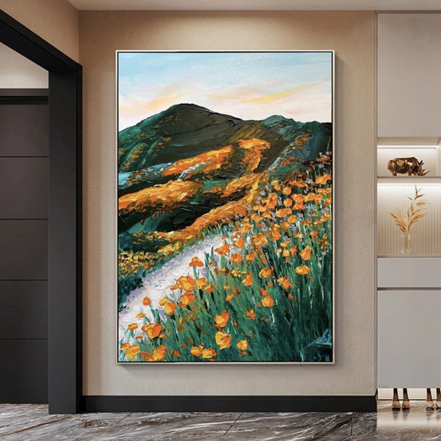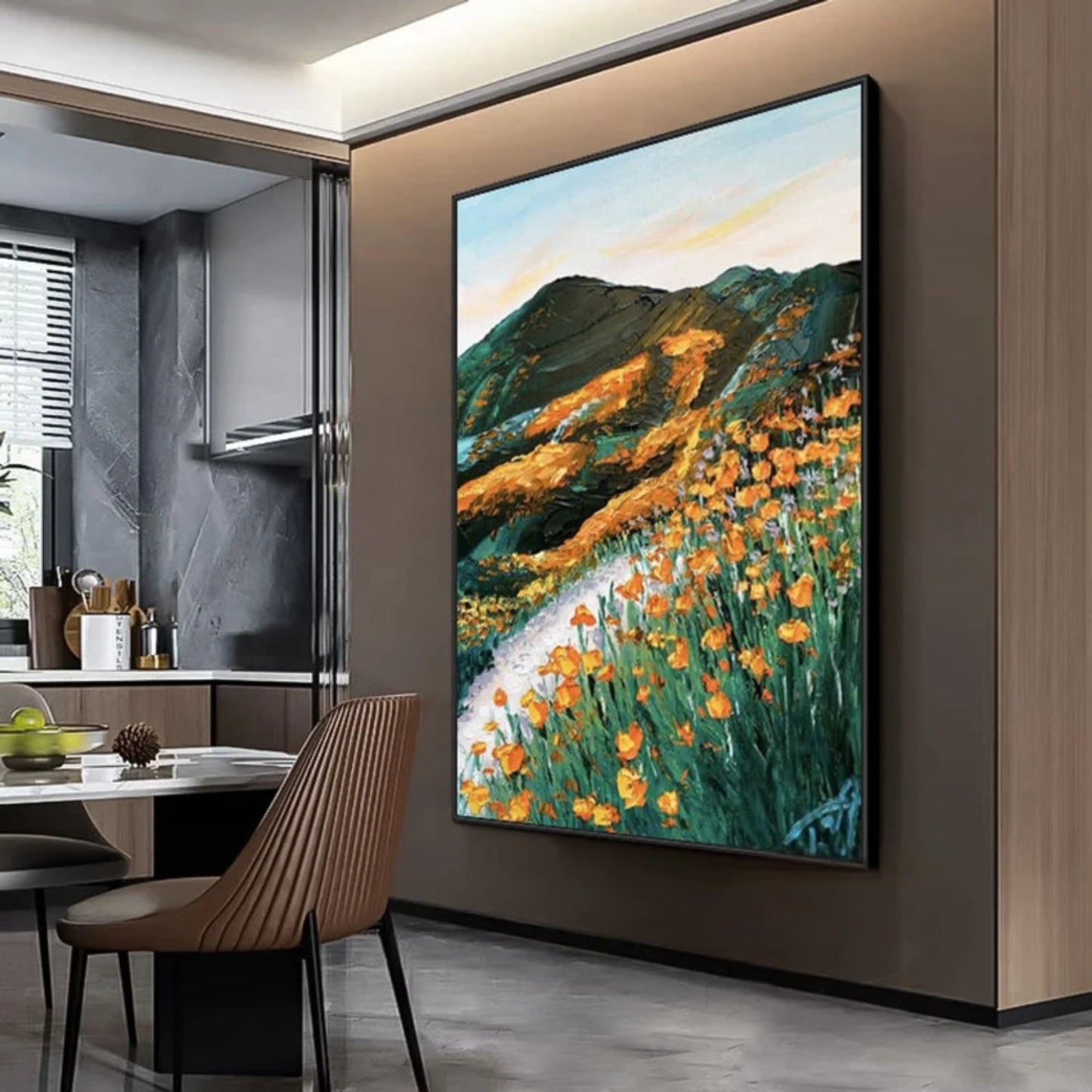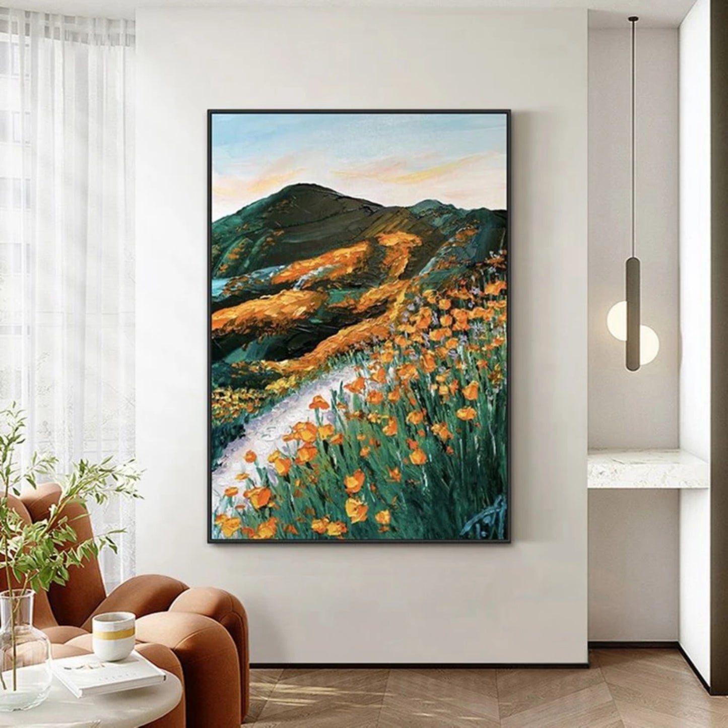 Transform your home with this stunning handmade abstract landscape painting. The artist’s use of vibrant colours and bold brushstrokes captures the essence of nature in a modern and abstract form. Perfect for living rooms, bedrooms, and dining areas, this painting brings a fresh and contemporary look to your home decor. Its unique design and handmade quality make it a valuable addition to any art collection.