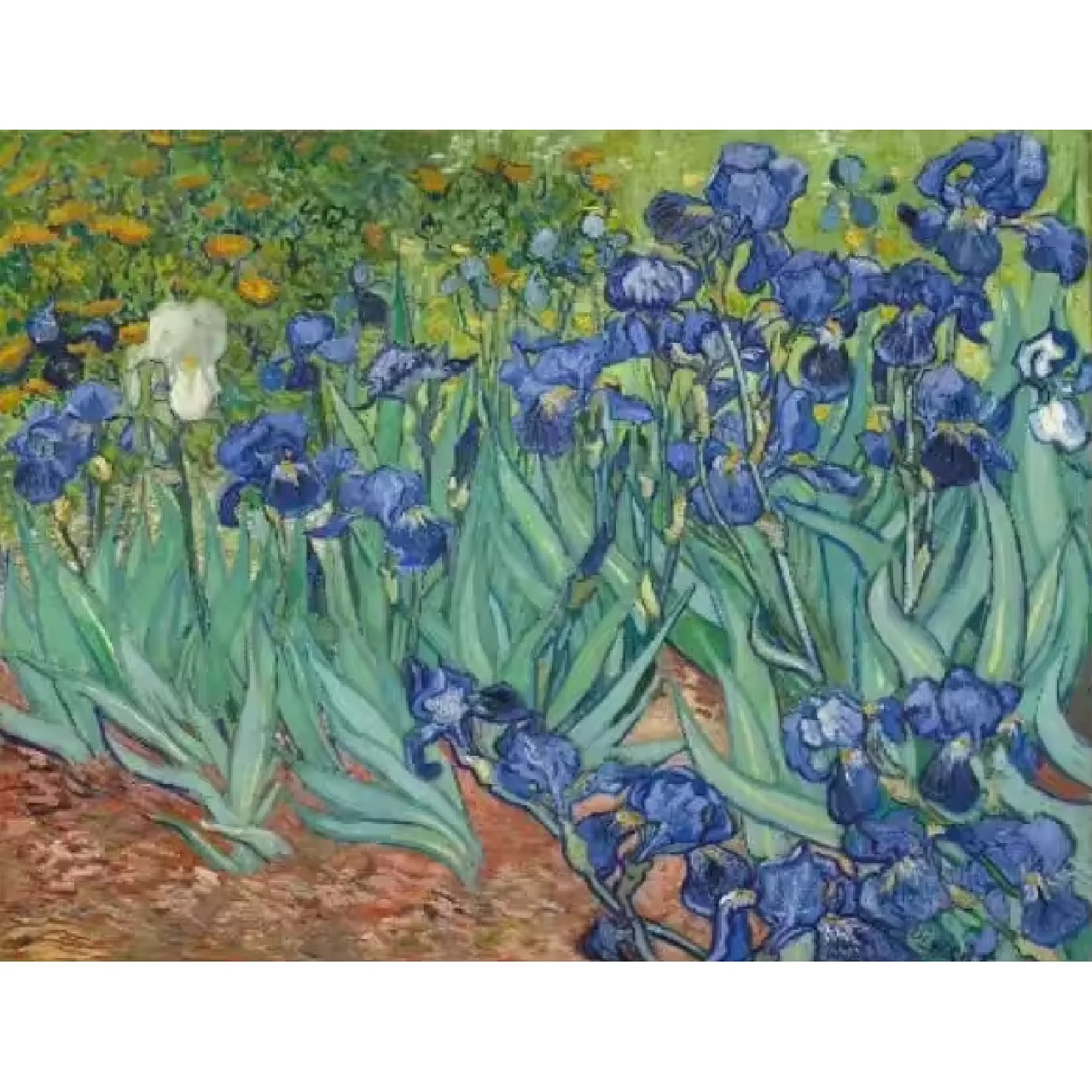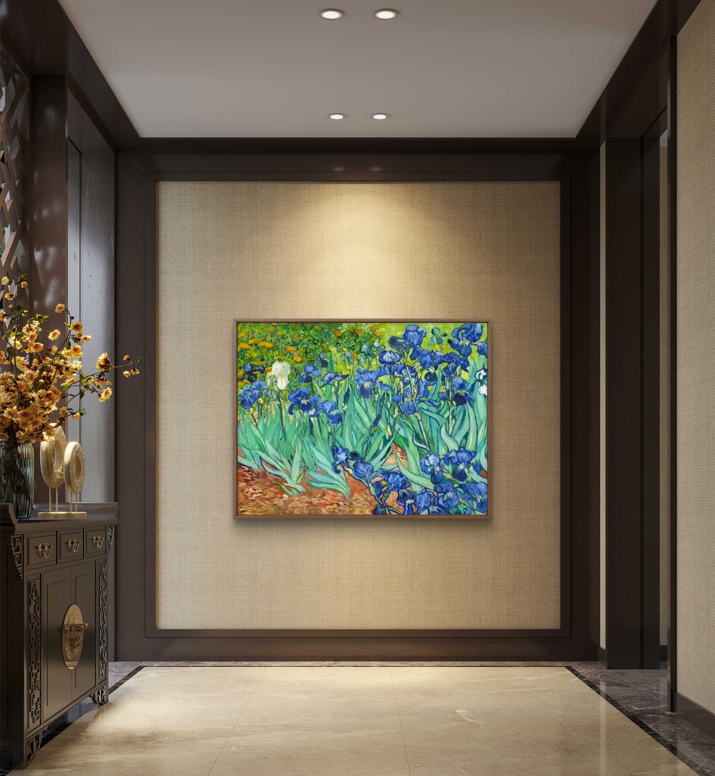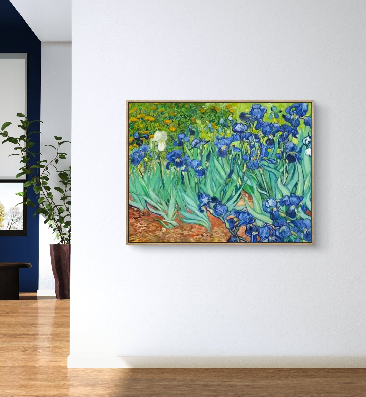 Bring a burst of wild garden beauty into your space with Iris Garden, a hand-painted masterpiece inspired by Vincent van Gogh’s iconic Irises. This vivid floral composition captures the expressive motion of blooming violet-blue irises set against a field of golden yellow poppies, fresh green foliage, and sun-washed soil.