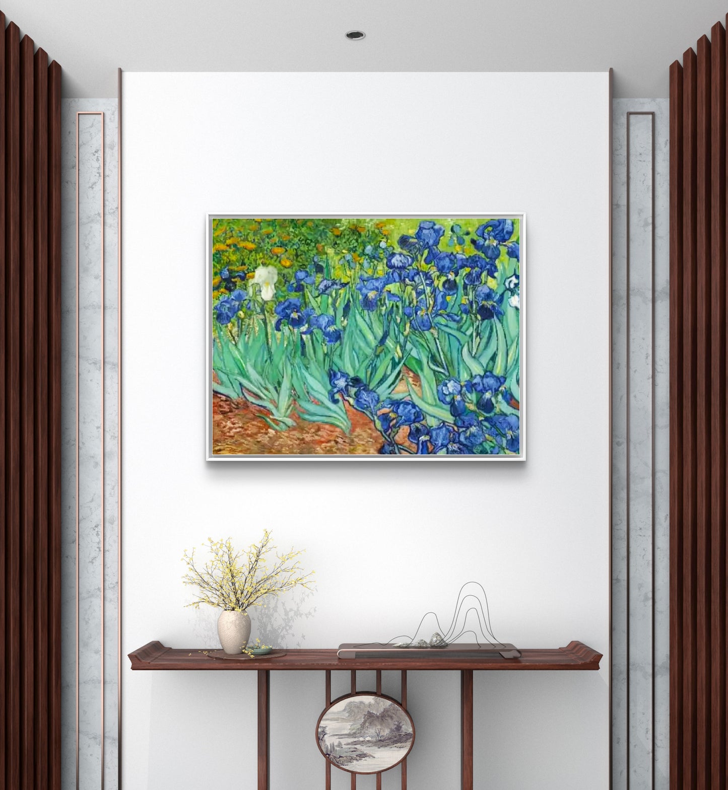 Blue Irises in Garden – Van Gogh Inspired Floral Painting on Canvas