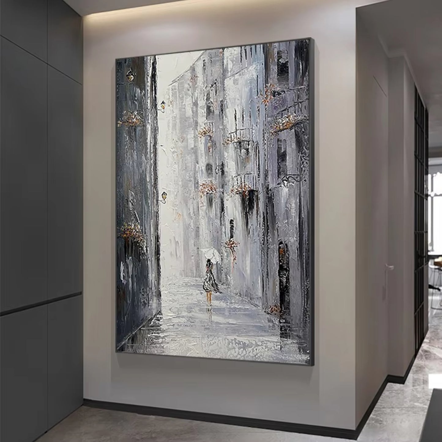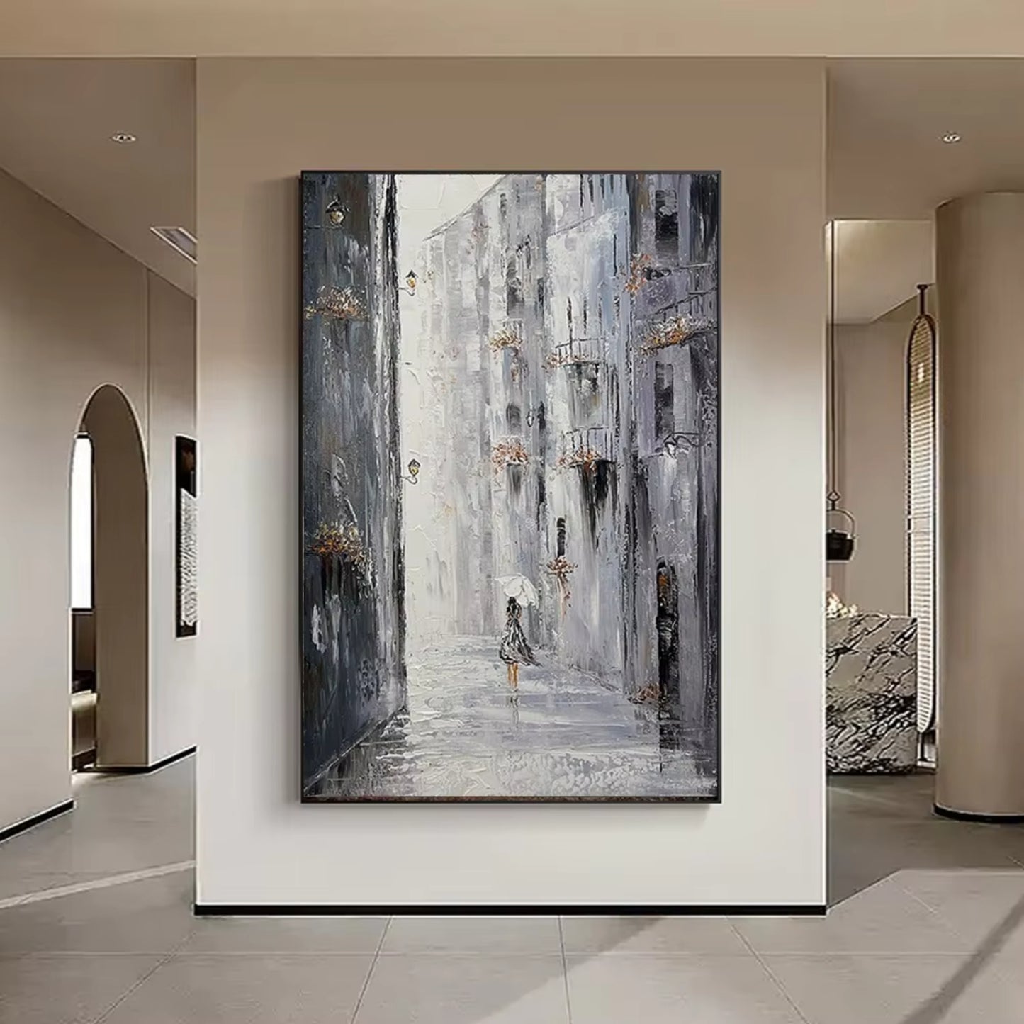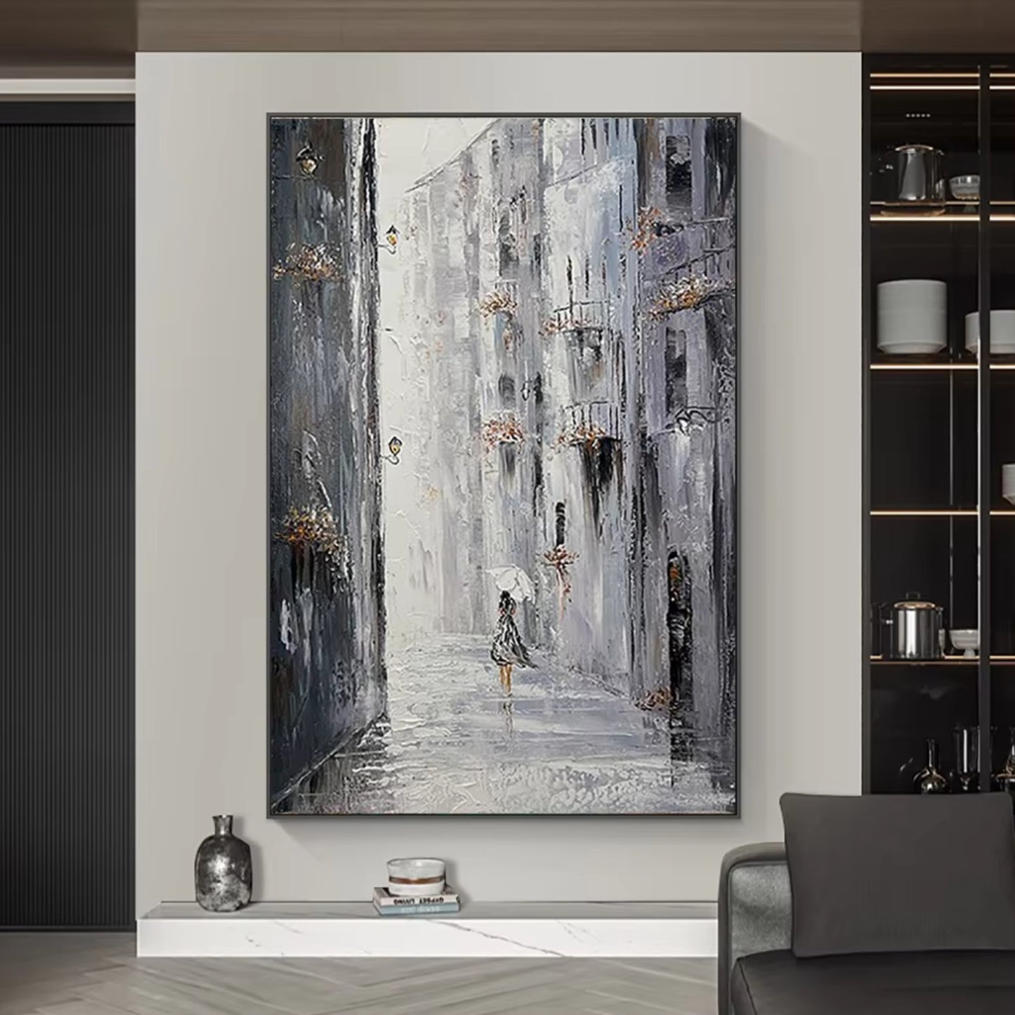 Rainy Alley Walk – Textured Grey Cityscape Painting with Umbrella