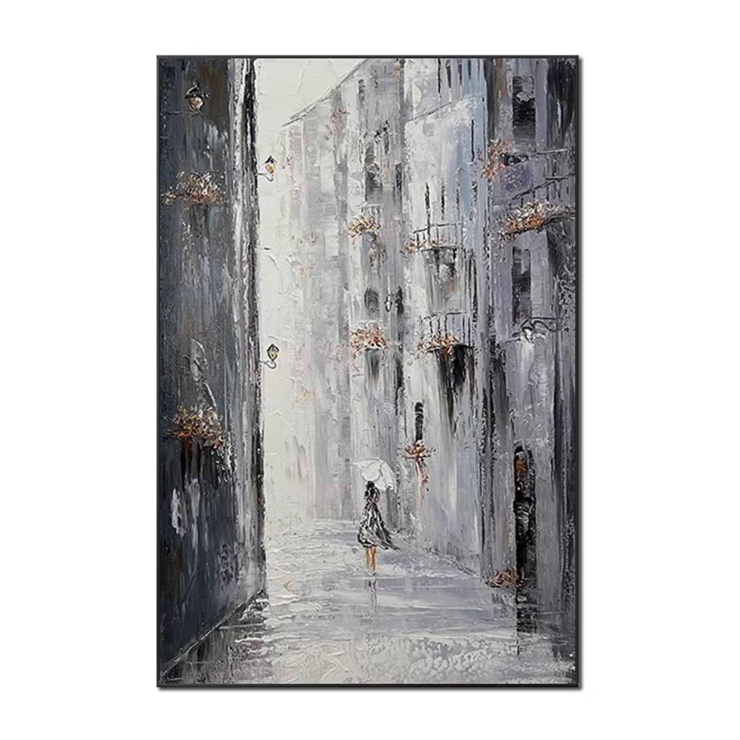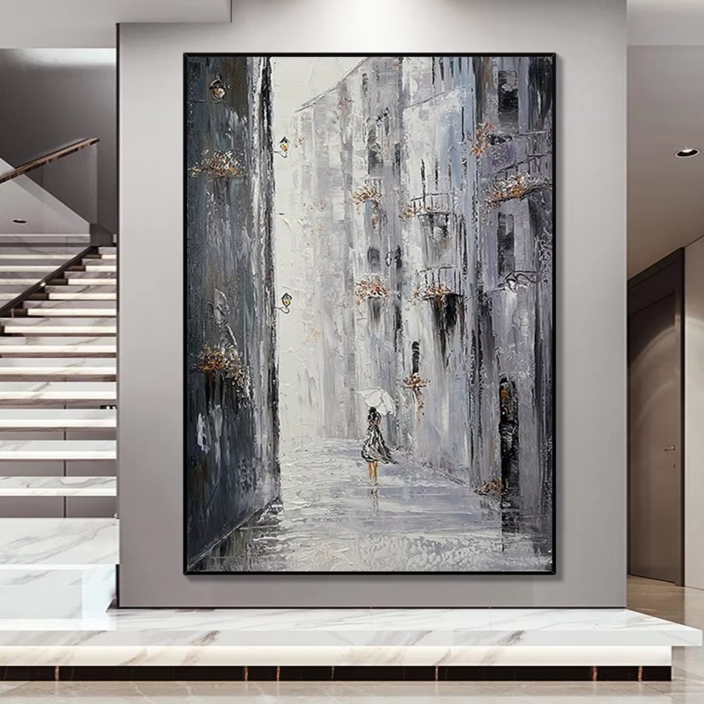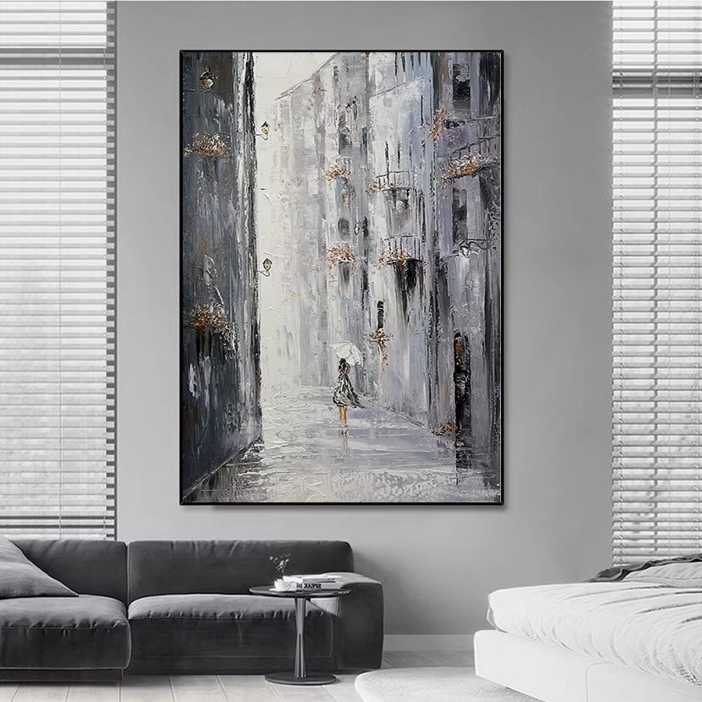 Rainy Alley Walk – Textured Grey Cityscape Painting with Umbrella