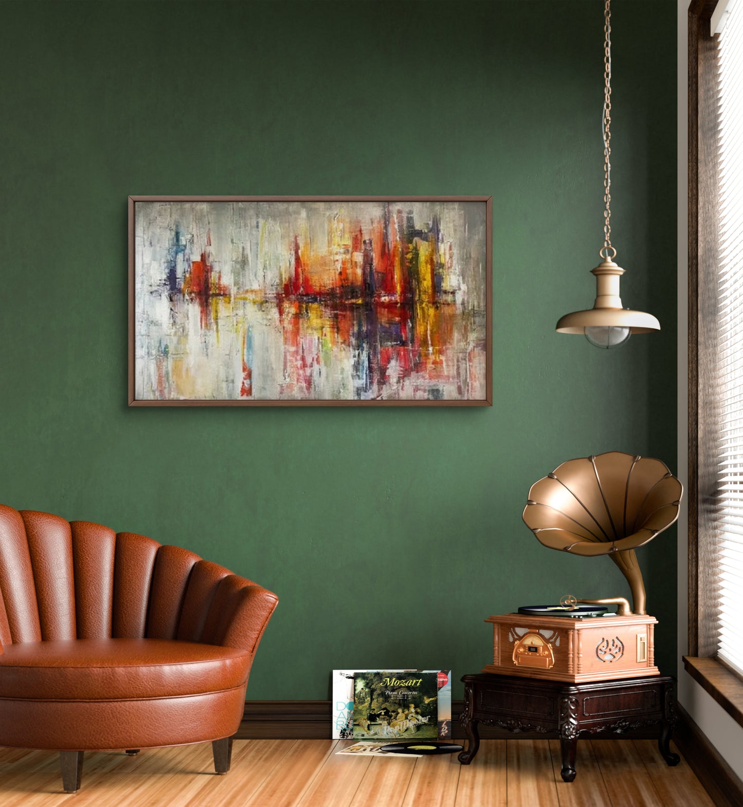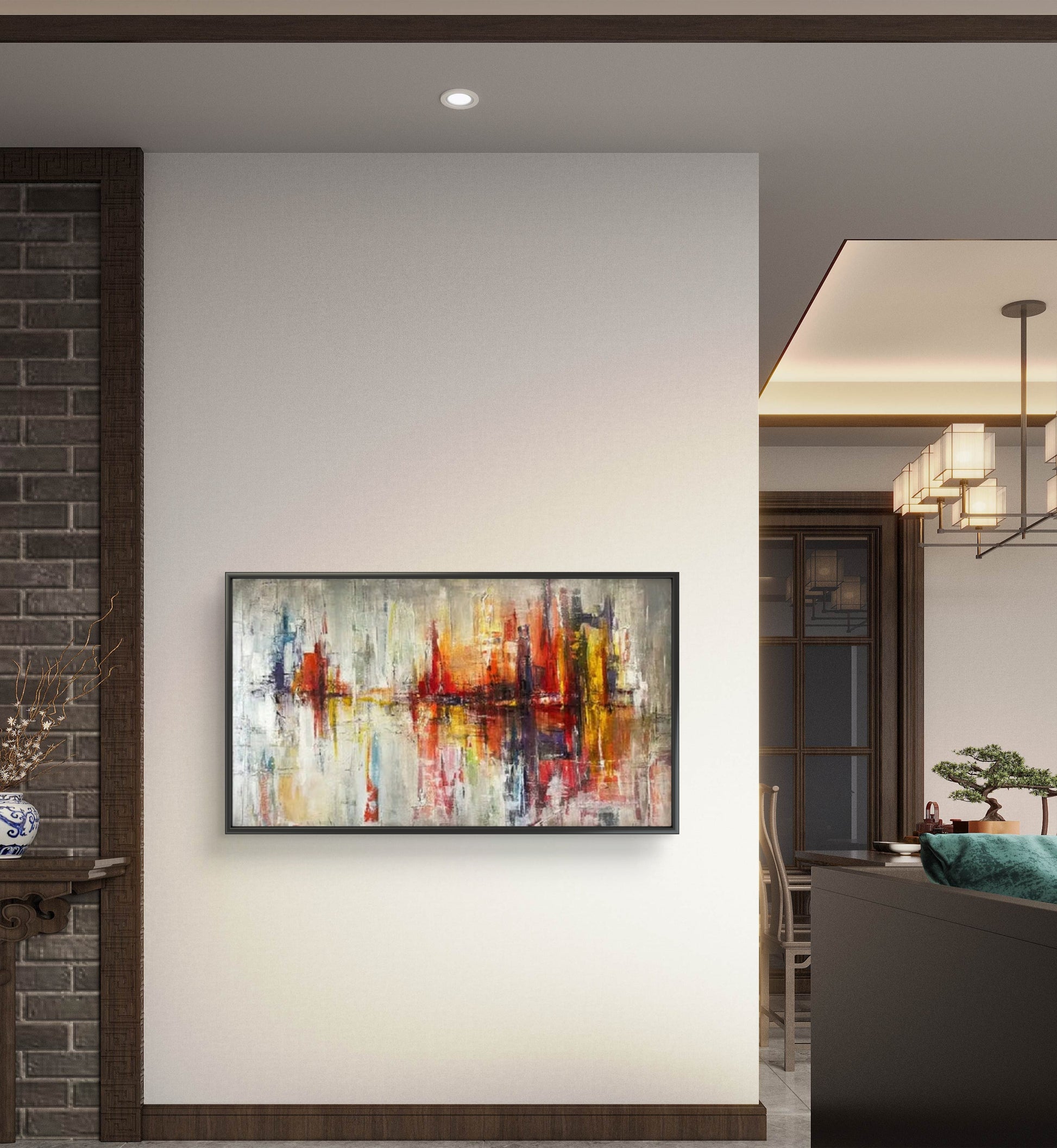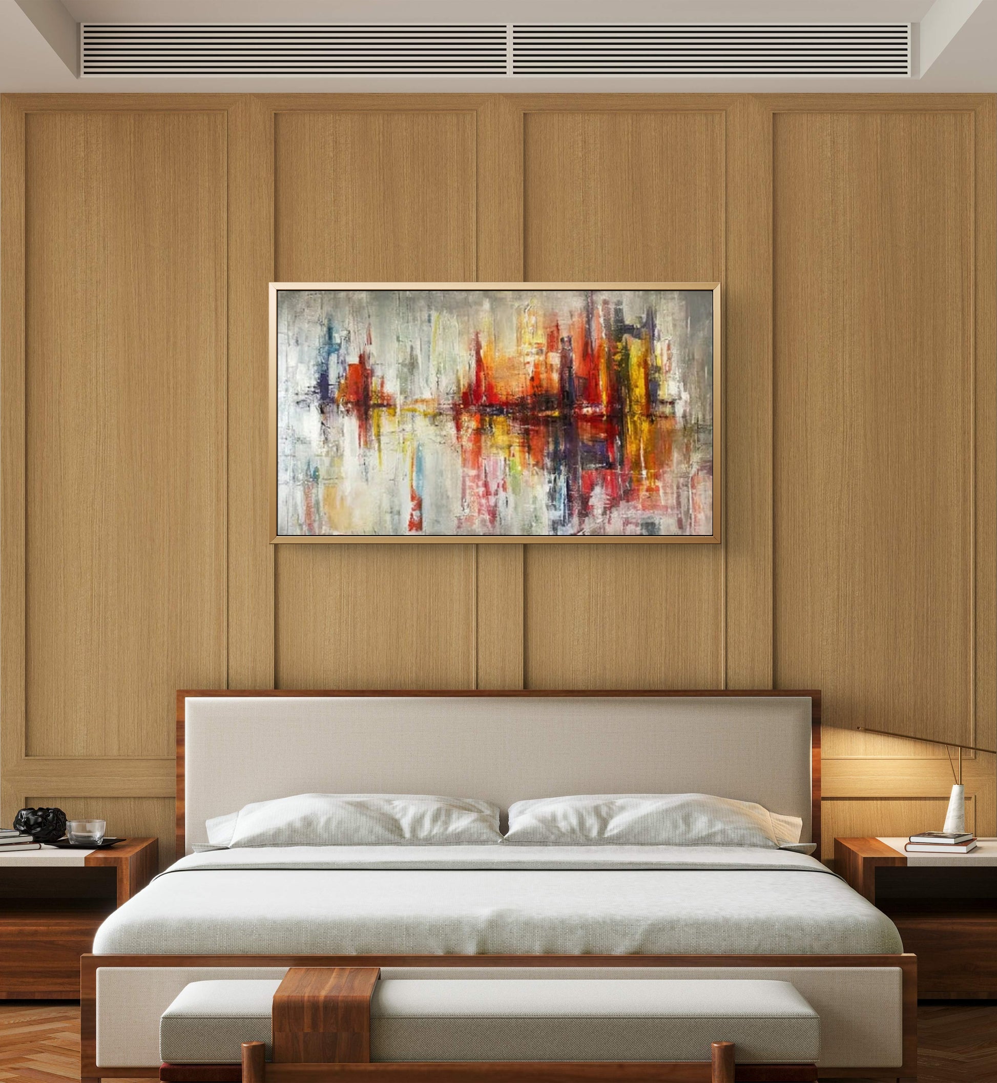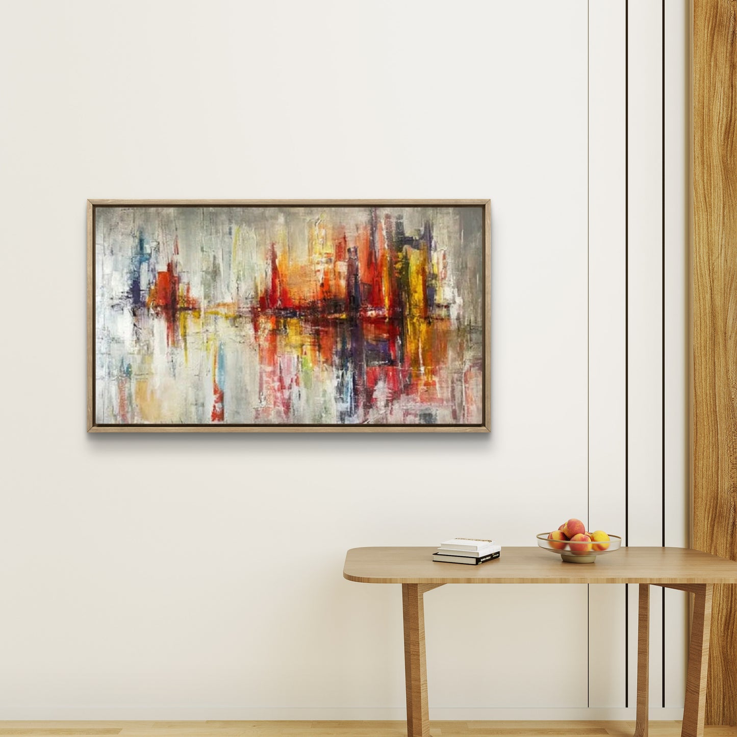 Transform your living space with the captivating beauty of our Modern Seasore Cityscape Colourful Abstract Art. This vibrant masterpiece features a mesmerising cityscape by the sea, rendered in a bold and contemporary abstract style. Hand-painted with meticulous attention to detail, the rich and lively colours create a dynamic visual impact, adding a touch of modern sophistication to any room.