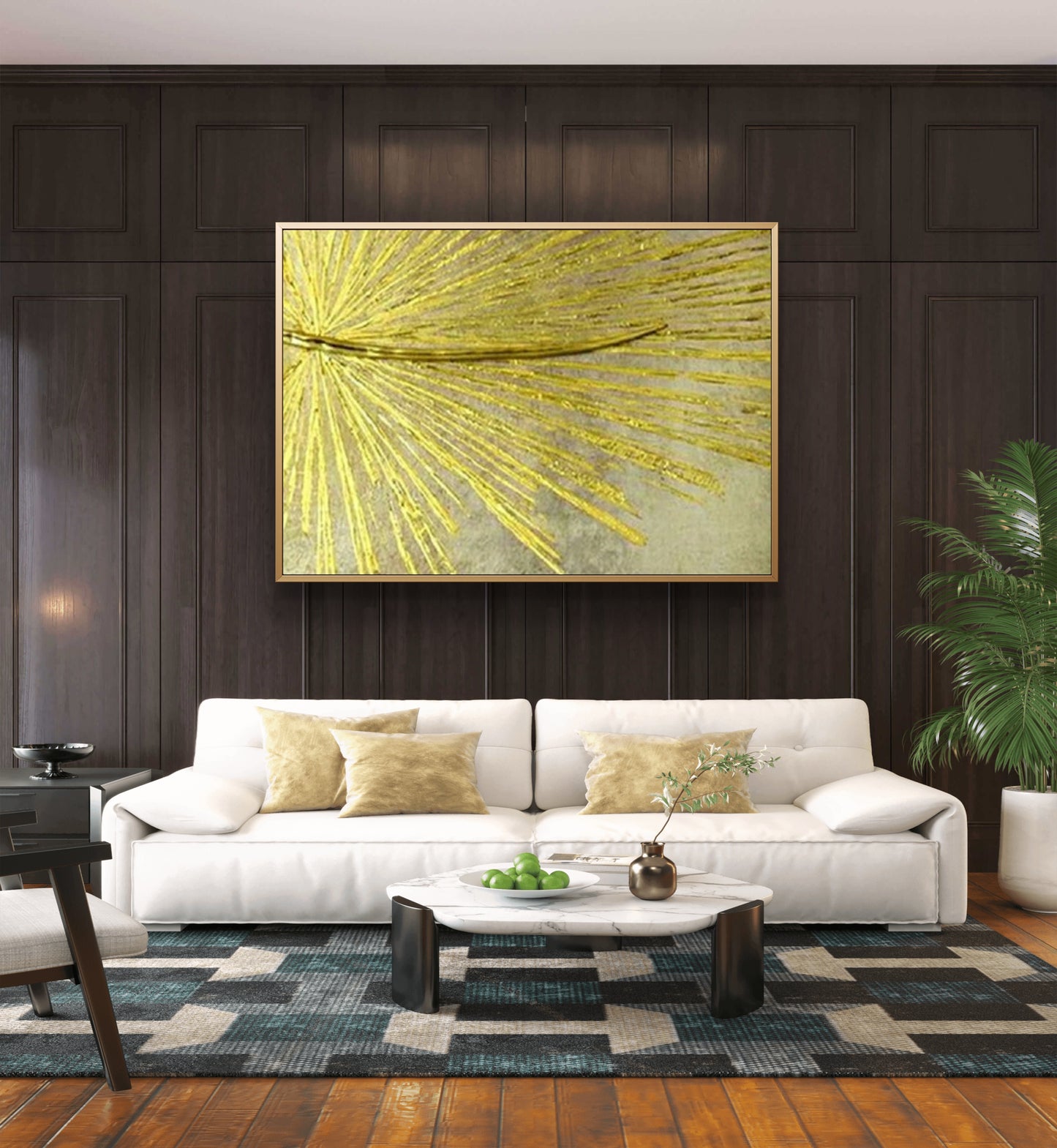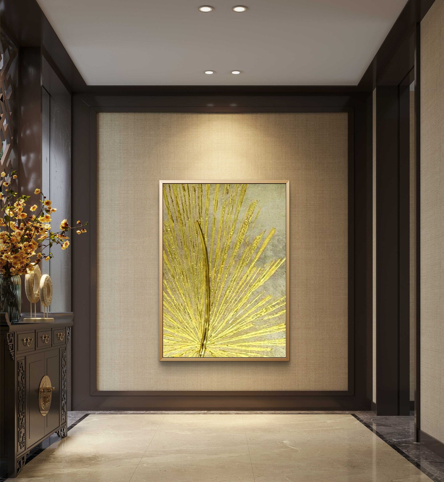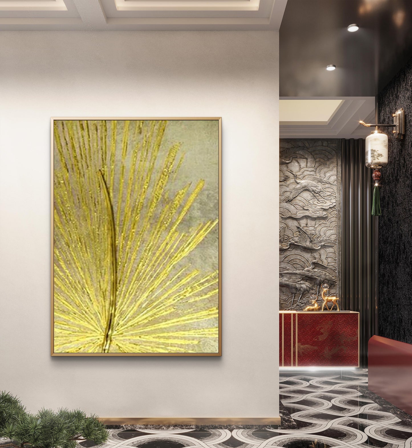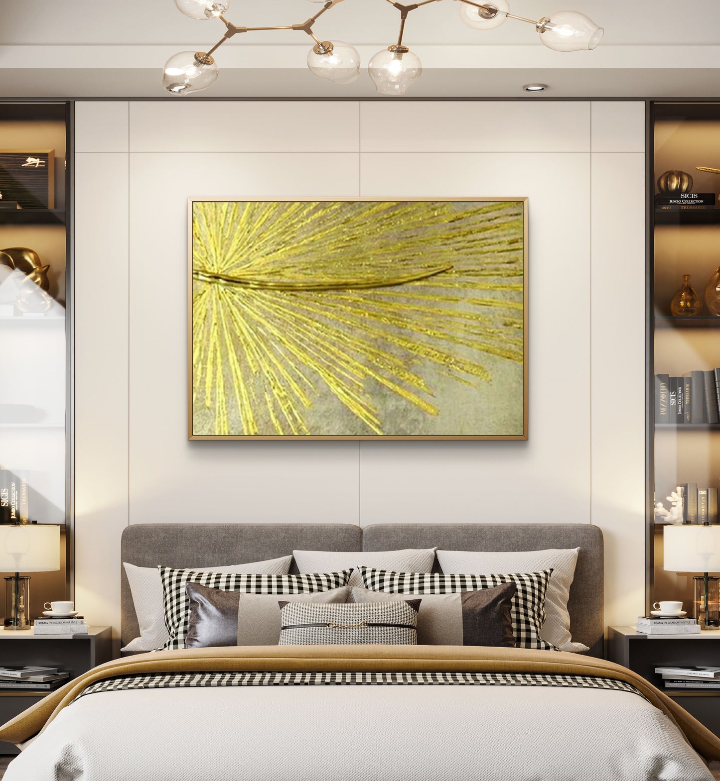 Inspired by the beauty of nature and the glow of gold. This hand-painted golden palm leaf artwork brings sophistication and warmth to any space. With radiant metallic texture and graceful symmetry, it evokes luxury and serenity. Perfect as a standalone piece or part of a pair, it adds a contemporary yet organic touch to hallways, bedrooms, or living rooms.