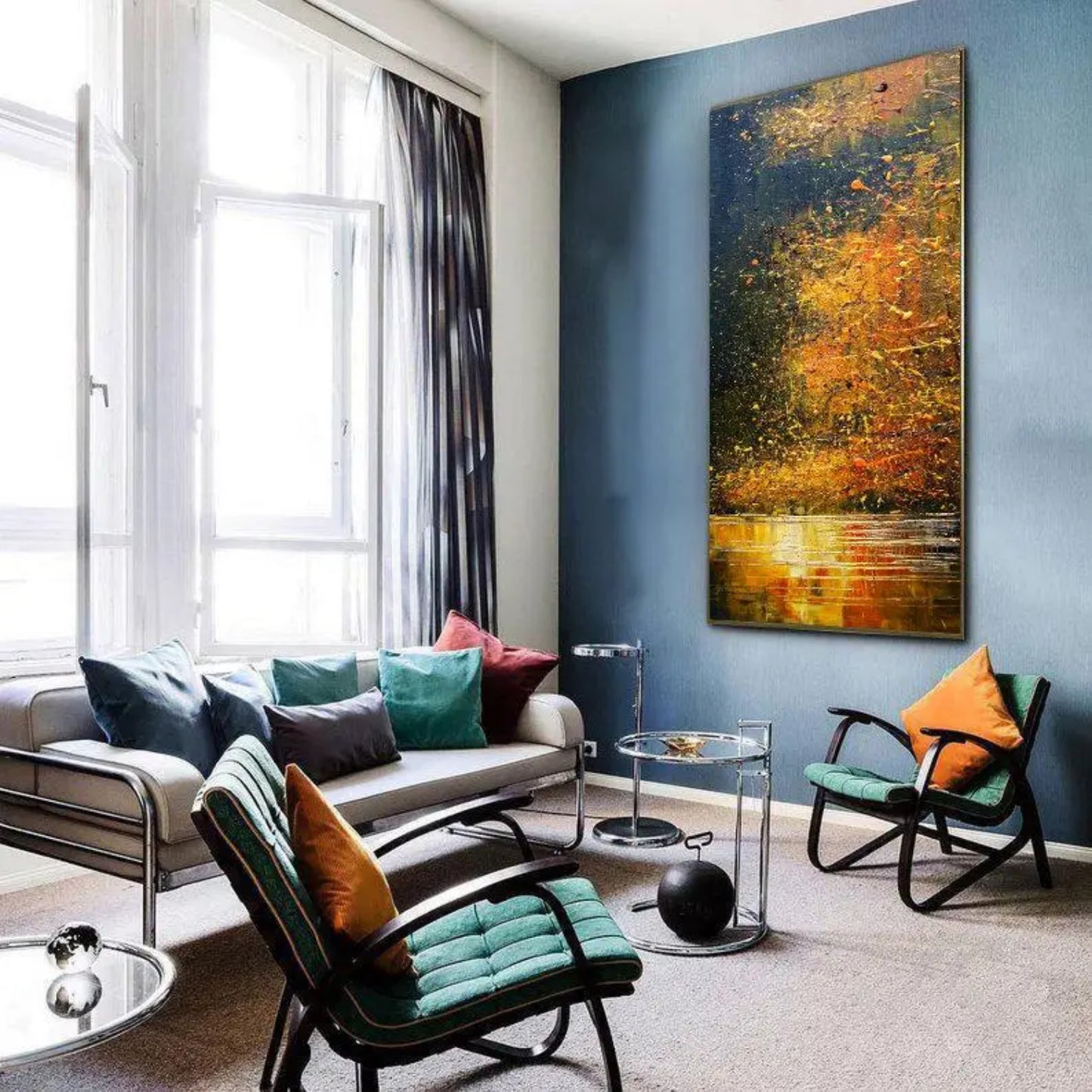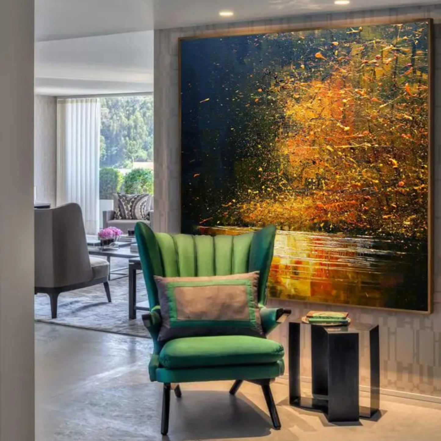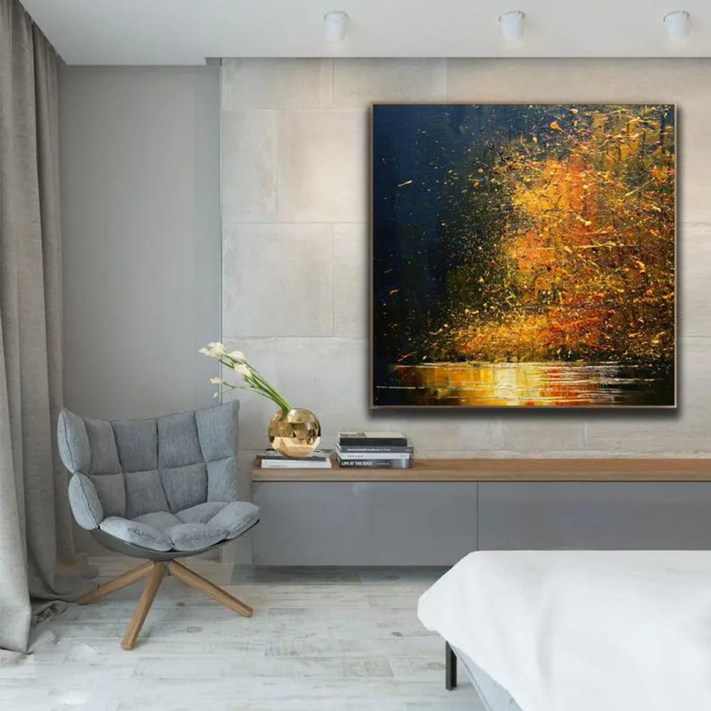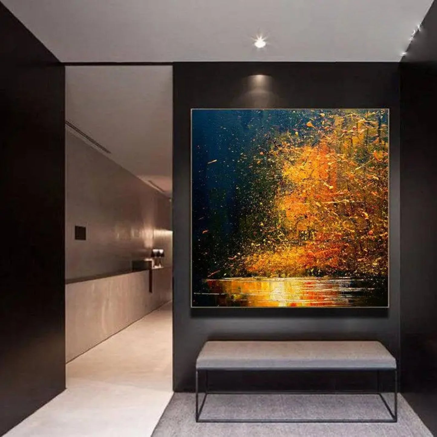 Where autumn light dances upon still water. “Golden Autumn Reflections” is a hand-painted modern Chinese abstract landscape that captures the serenity of nature’s golden season. Vivid tones of amber, gold, and crimson scatter like falling leaves against a deep forest backdrop. The textured brushwork and luminous contrasts evoke a poetic sense of calm and nostalgia, reminiscent of tranquil lakeside evenings in autumn. A stunning centrepiece for homes seeking warmth, depth, and natural harmony.