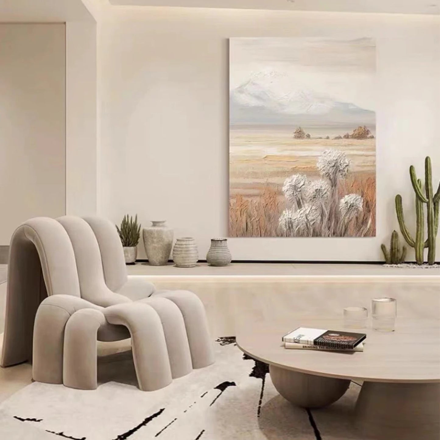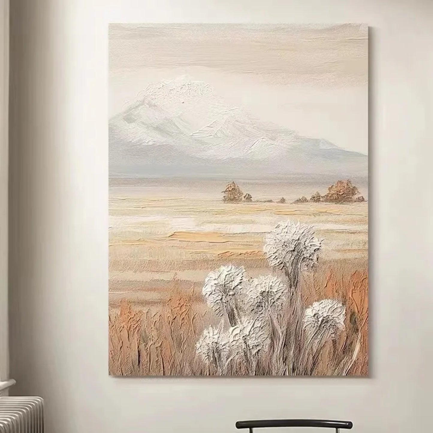 Add a touch of tranquility to your space with this serene landscape painting featuring a majestic mountain and delicate flowers. Perfect for creating a calm and peaceful atmosphere, this artwork is ideal for living rooms, bedrooms, or any space in need of a soothing decor element. The soft, earthy tones and detailed texture bring a sense of nature's beauty indoors, making it a perfect addition to contemporary or traditional interiors. Enhance your home with this beautiful and calming landscape painting.