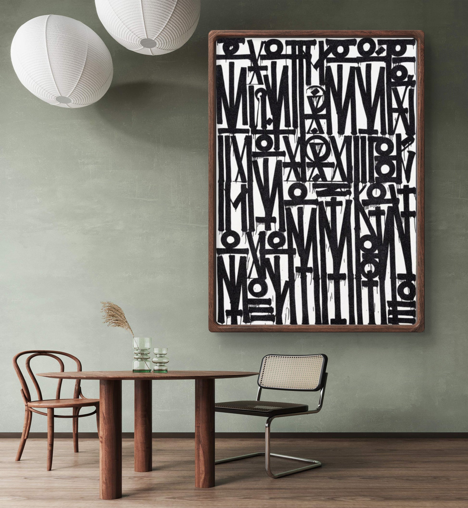 Graphic, minimalist, and powerfully urban. This RETNA-inspired canvas layers crisp white calligraphic symbols over a deep black ground. The rhythmic grid of strokes, circles, and bars creates a bold street-meets-gallery aesthetic that anchors modern, minimalist, and industrial interiors. Each piece is meticulously hand-painted, giving you authentic texture and presence you can’t get from prints.