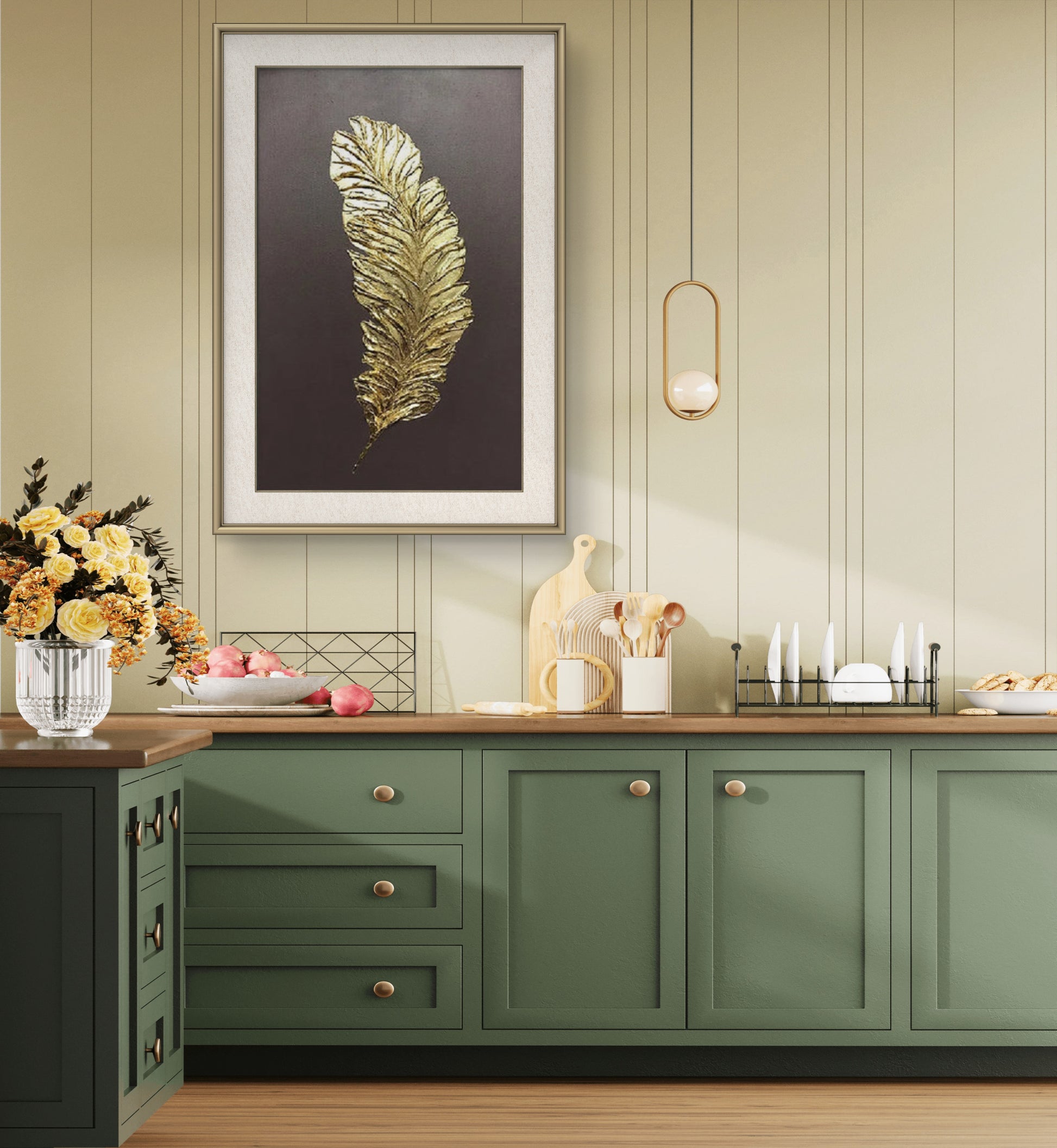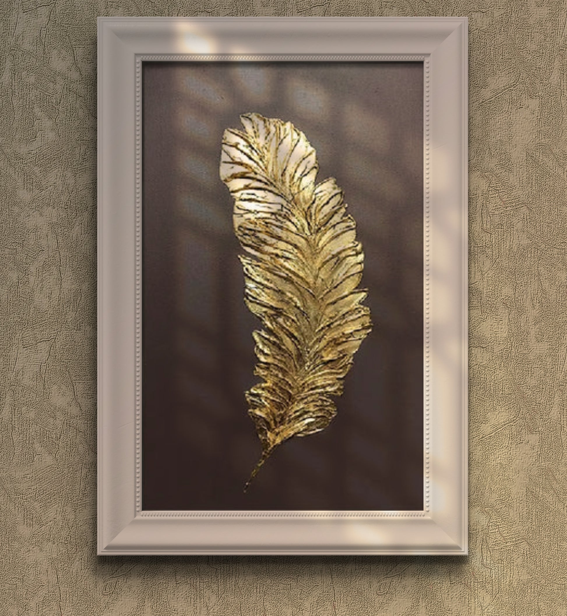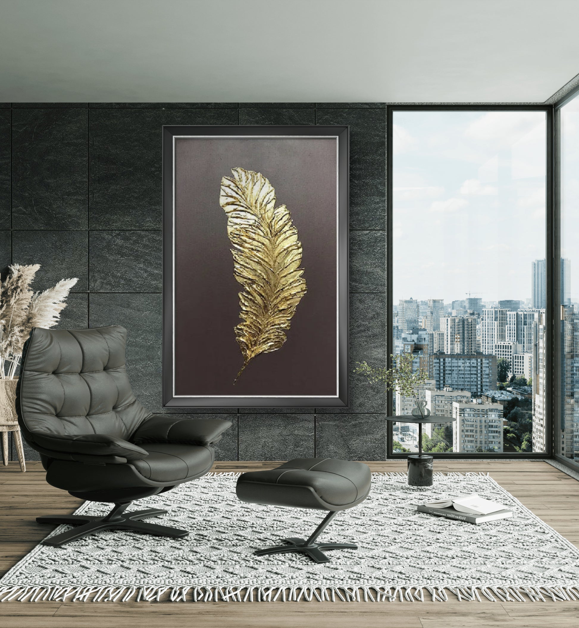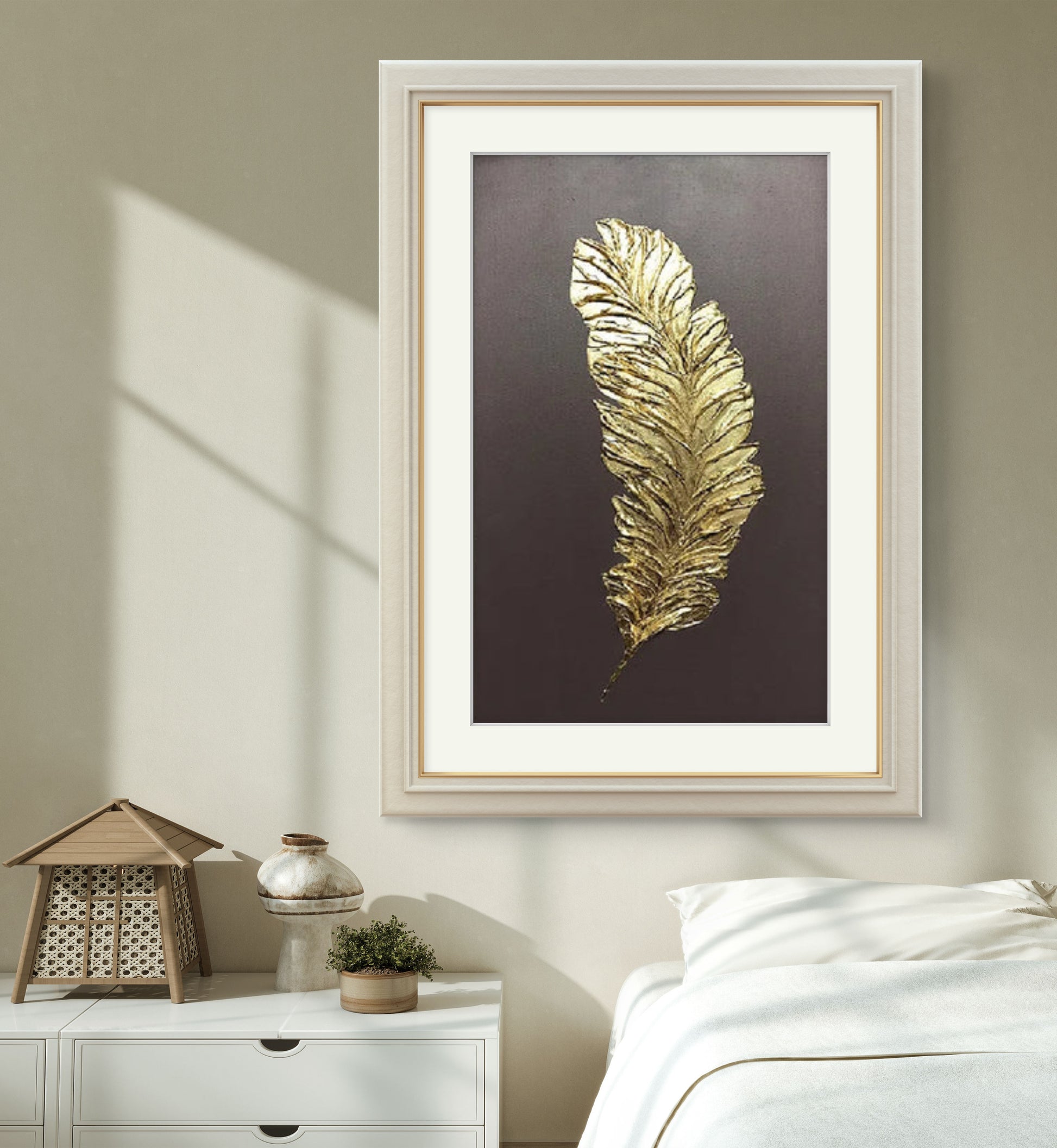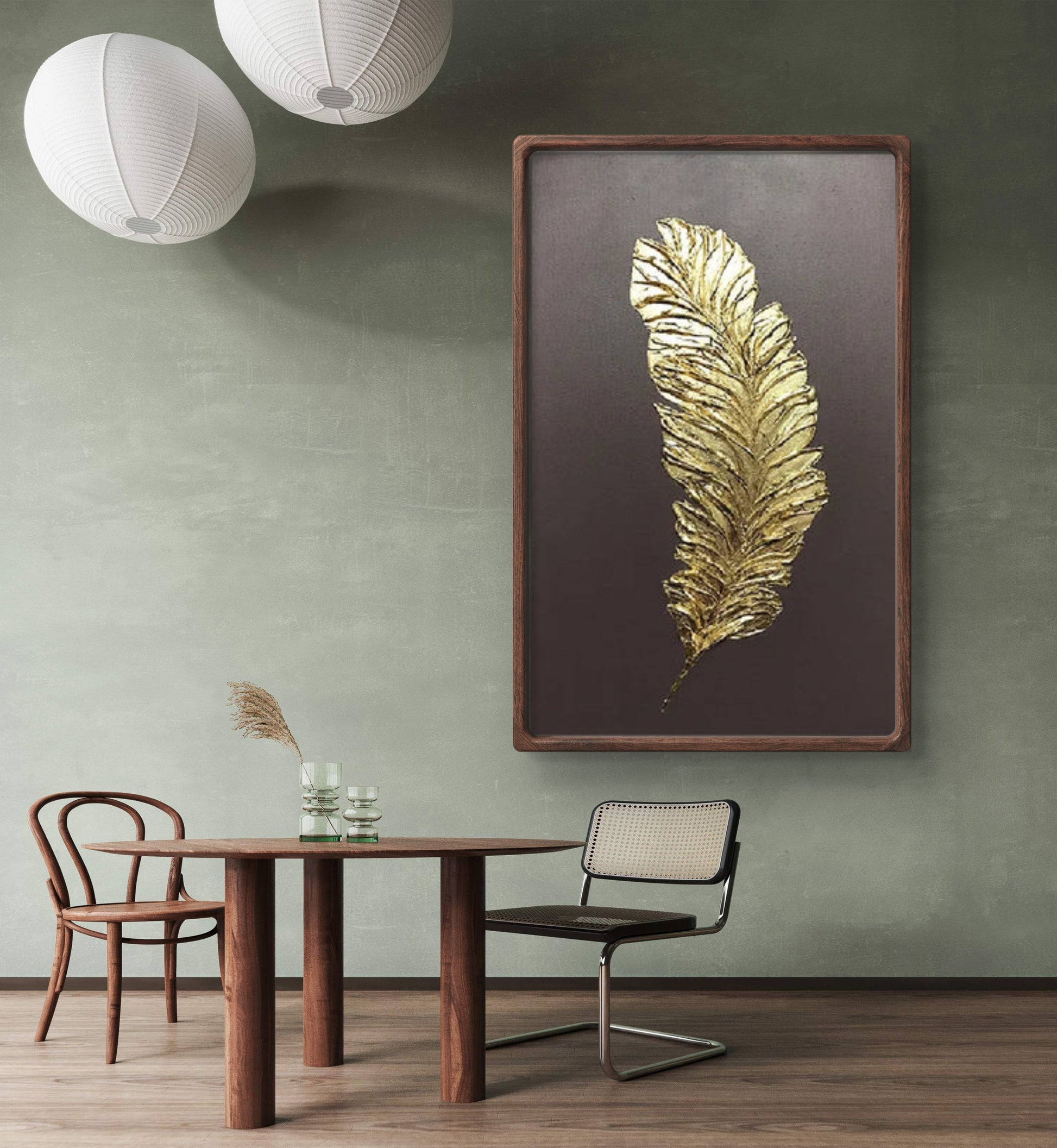 Where simplicity meets luxury. This hand-painted artwork features a striking golden feather delicately textured against a deep background. Each metallic brushstroke catches the light, creating a captivating sense of depth and elegance. A perfect statement piece for sophisticated interiors seeking refined glamour.