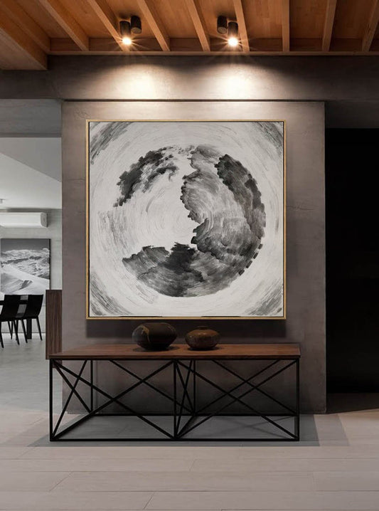 Monochrome Swirl Abstract Painting – Black, White & Grey Textured Circular Canvas Art