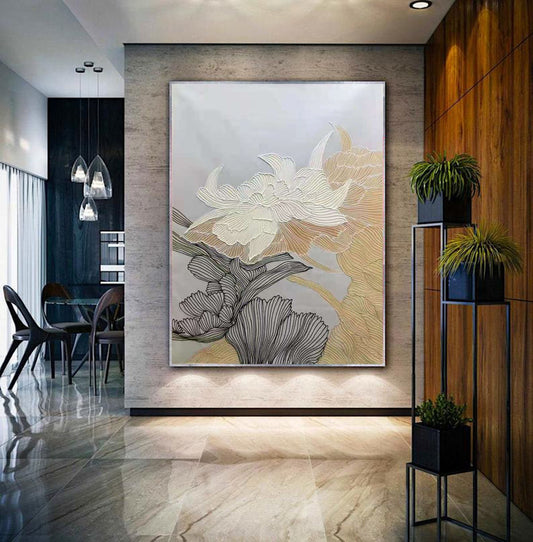 Textured White Floral Painting – Neutral 3D Botanical Canvas in Grey & Gold