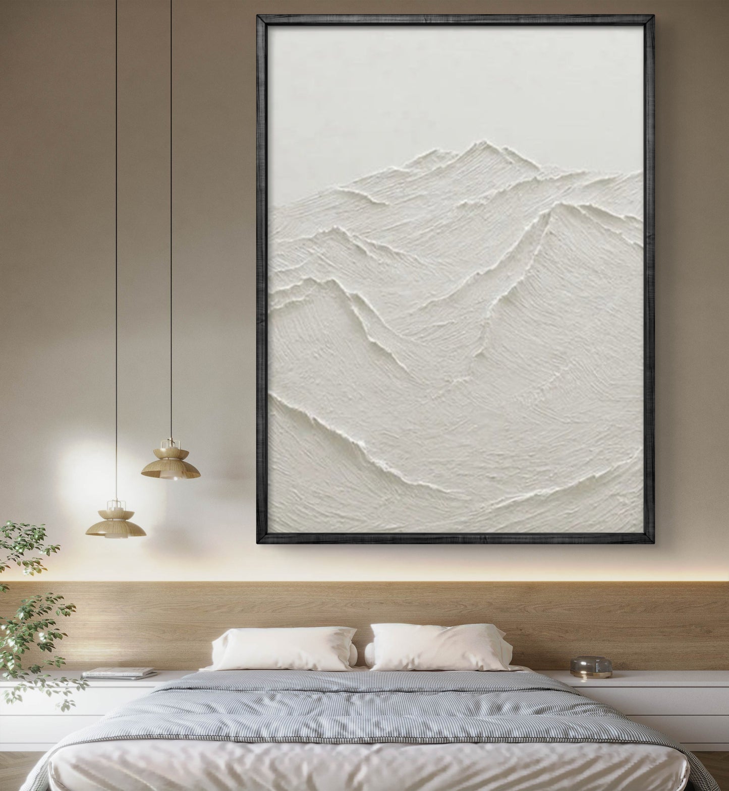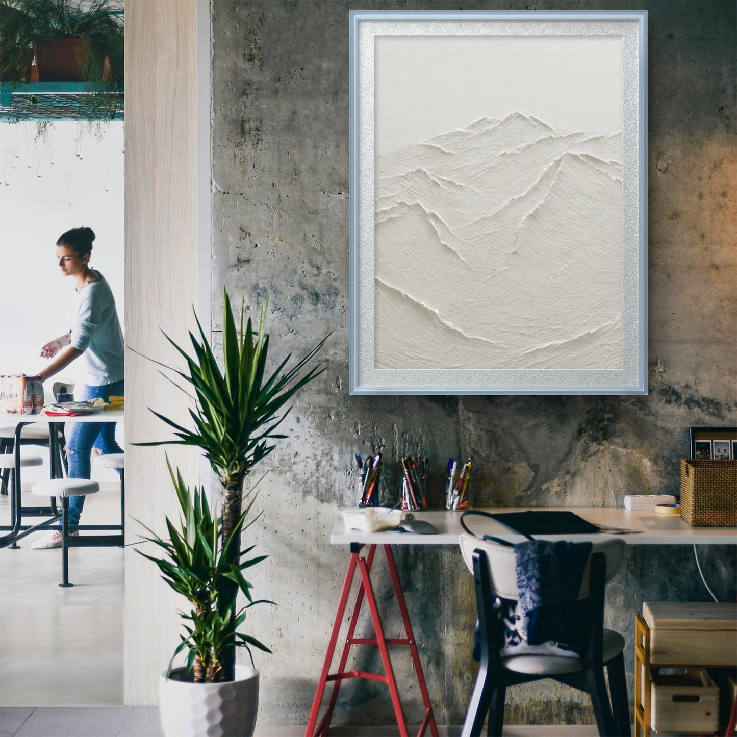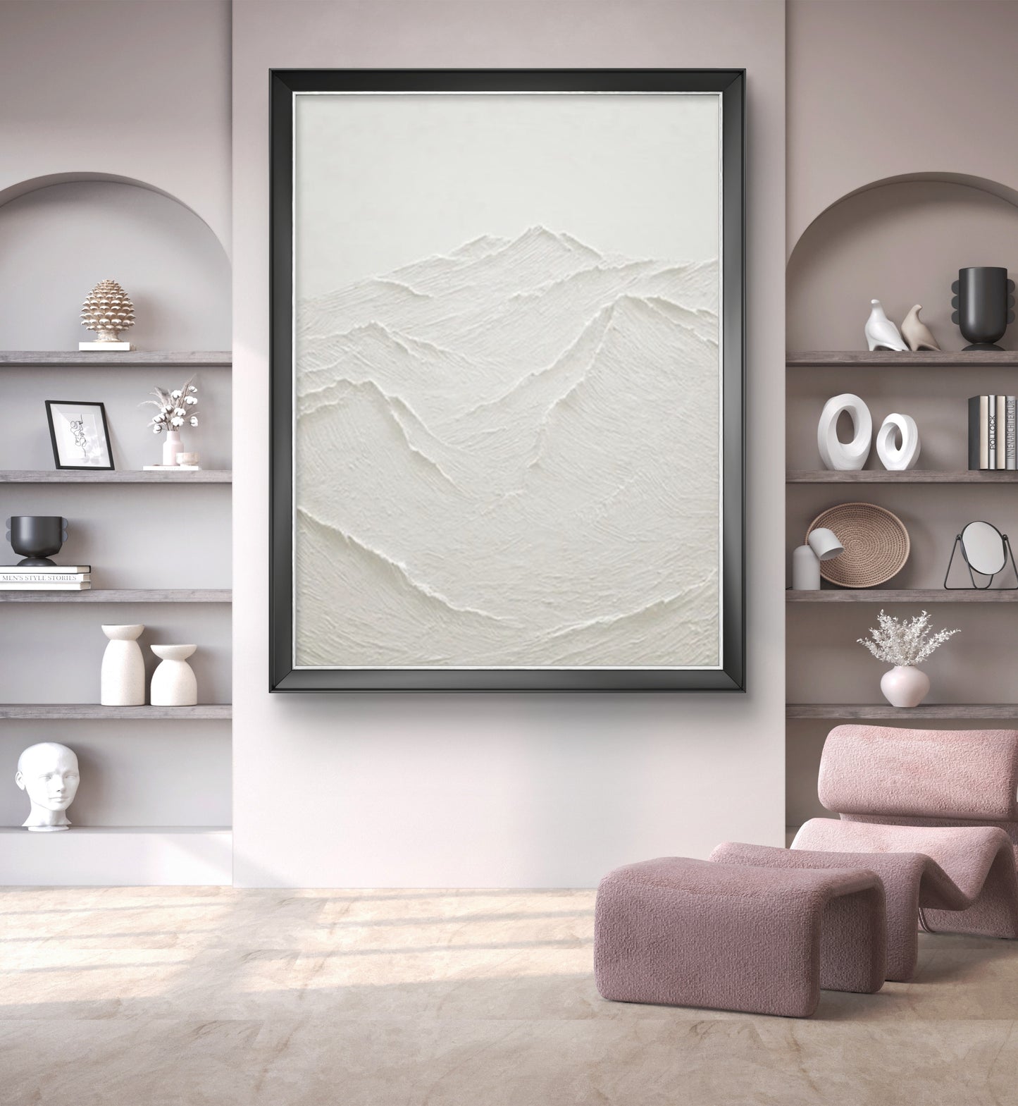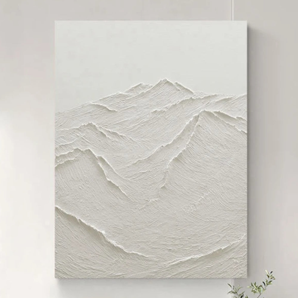 This oil painting features a series of mountain ranges, rendered in a striking 3D style that adds depth and dimension to the scene. The mountains are painted in a textured white, giving them a rugged, realistic appearance that contrasts beautifully with the abstract style of the artwork. The painting is designed to be displayed in a living room, where it can serve as a stunning focal point and conversation starter. Its neutral white colour scheme makes it versatile enough to complement a variety of interior design styles, from modern to rustic. This painting is not just a piece of decor, but a statement of appreciation for the awe-inspiring beauty of our natural world.