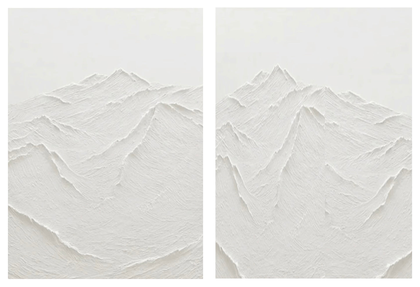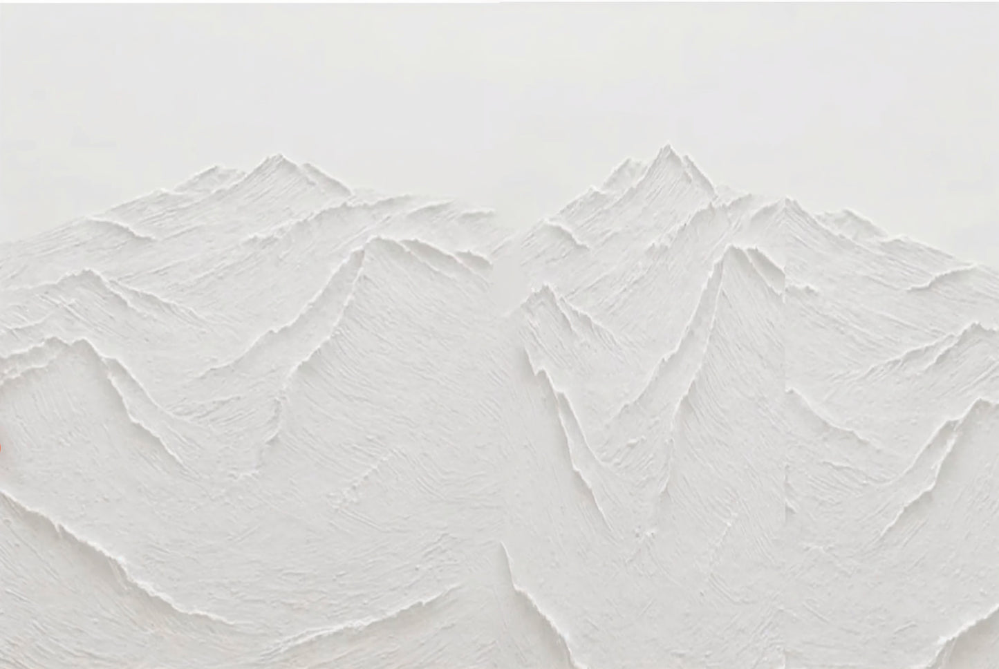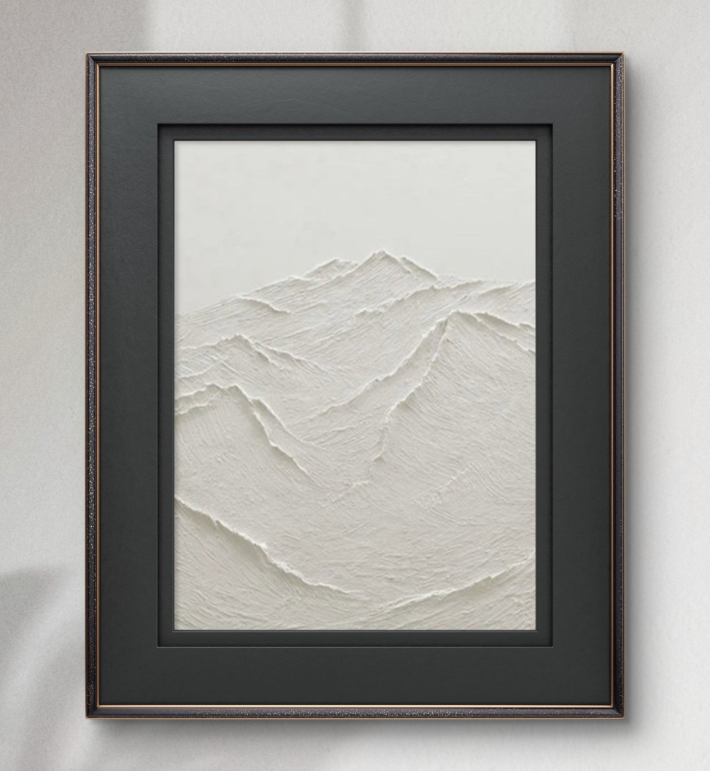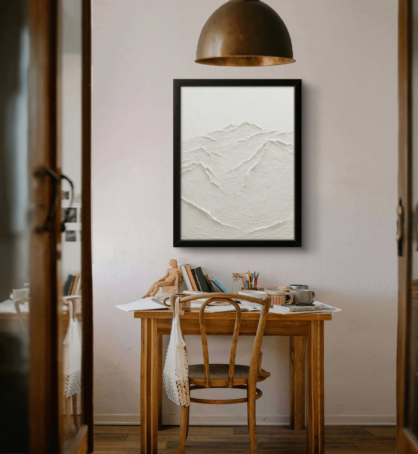 This oil painting features a series of mountain ranges, rendered in a striking 3D style that adds depth and dimension to the scene. The mountains are painted in a textured white, giving them a rugged, realistic appearance that contrasts beautifully with the abstract style of the artwork. The painting is designed to be displayed in a living room, where it can serve as a stunning focal point and conversation starter. Its neutral white colour scheme makes it versatile enough to complement a variety of interior design styles, from modern to rustic. This painting is not just a piece of decor, but a statement of appreciation for the awe-inspiring beauty of our natural world.