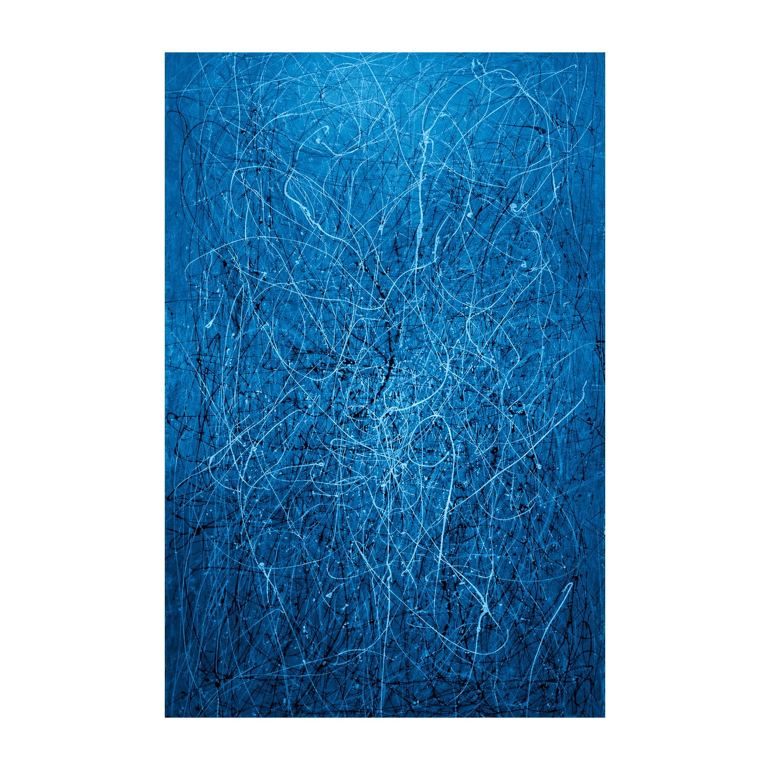 Immerse yourself in the cosmic flow of "Celestial Drifts," a mesmerizing abstract drip painting inspired by Jackson Pollock. This stunning artwork features an intricate network of white and black splatters dancing across a luminous sky blue background, evoking the movement of stars, clouds, and celestial energy. The fluidity and depth create an atmosphere of mystery and serenity, making it a striking addition to any modern space.