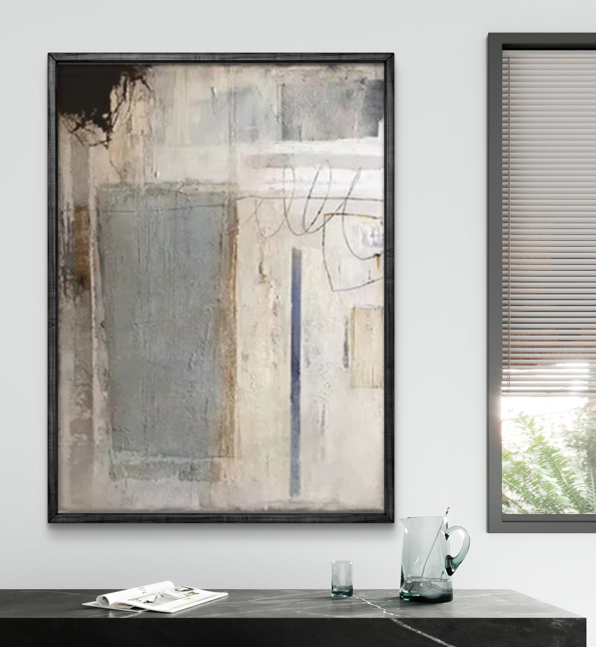 This minimalist, hand-painted abstract canvas brings a serene, wabi-sabi aesthetic to any room. Featuring a refined palette of grey and beige tones, the artwork embraces the beauty of simplicity and imperfection, inspired by Japanese design principles.